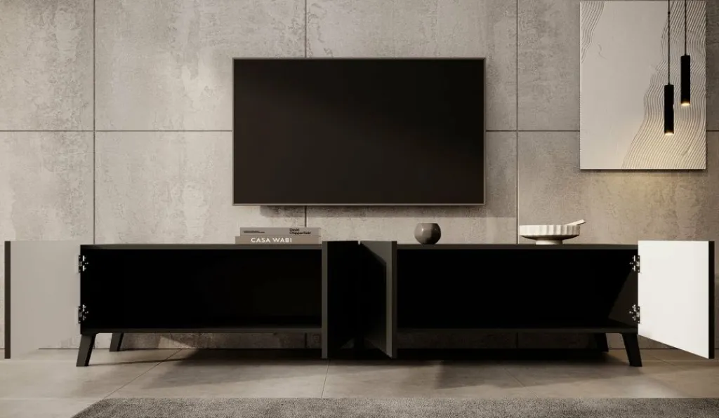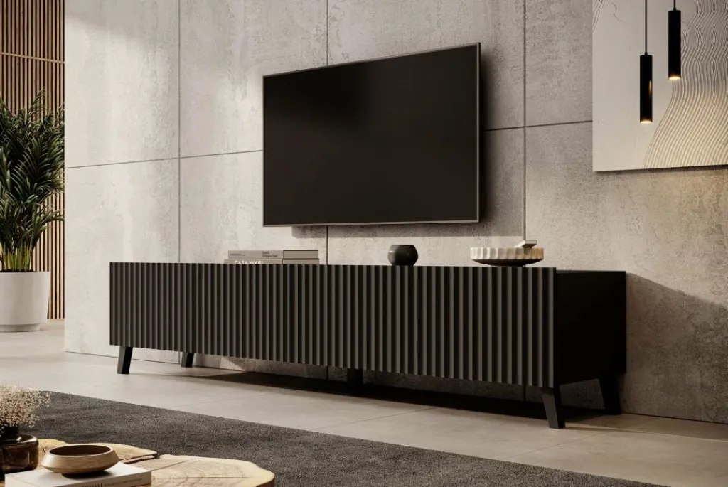 TV-meubel Pepinos 2 is een strak vormgegeven meubel in mat zwarte kleur. De kast is voorzien van vier kleppen die aan de bovenzijde openen. Achter de kleppen bevinden zich twee ruime opbergvakken waarin je apparatuur en accessoires netjes kunt opbergen. De voorzijde heeft een verticale lamelstructuur en het meubel staat op zwarte pootjes voor een stabiele plaatsing.