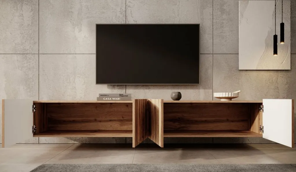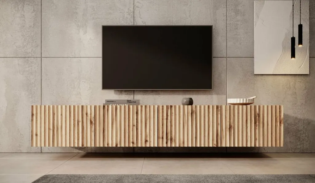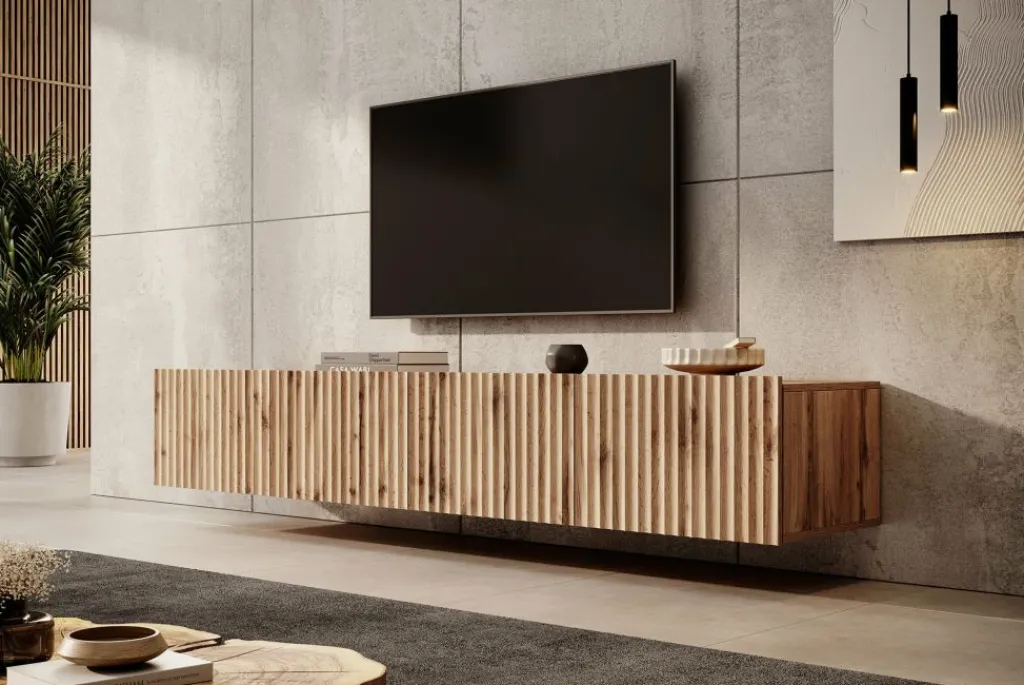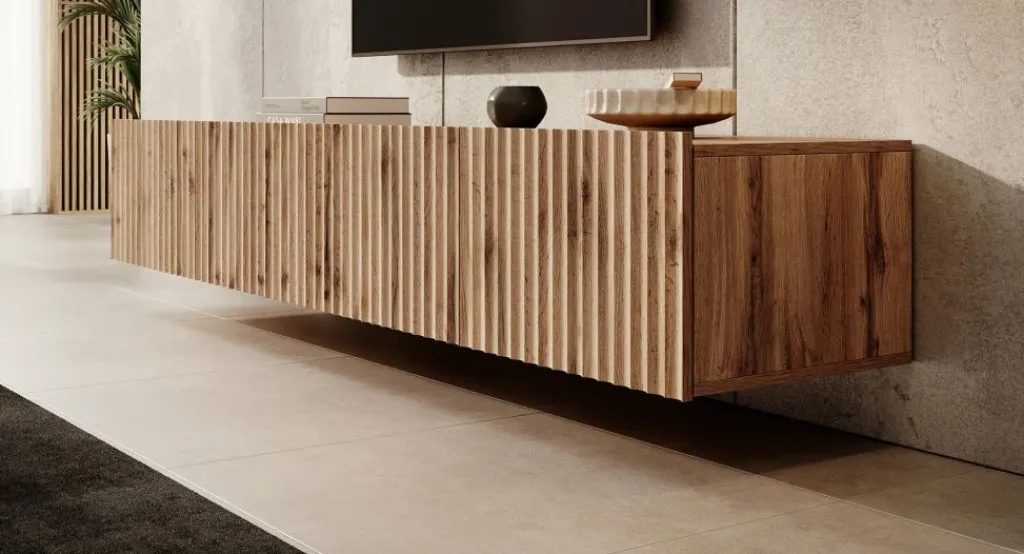 Door de zwevende montage blijft de vloer vrij en oogt de ruimte overzichtelijk. De eiken afwerking combineert eenvoudig met moderne en lichte interieurs. TV-meubel Pepinos is een praktische keuze wanneer je een strakke wandopstelling zoekt met voldoende gesloten bergruimte.