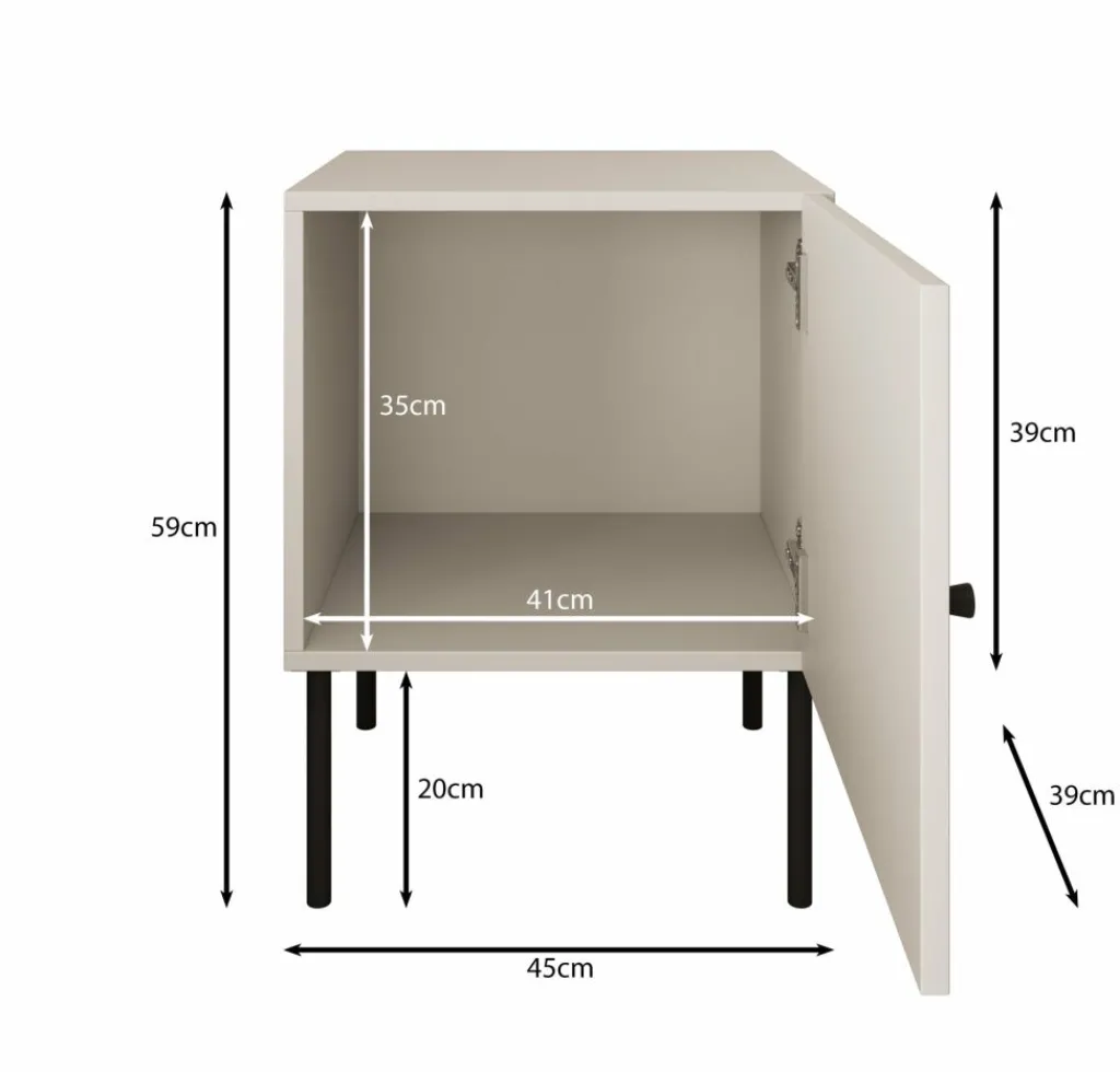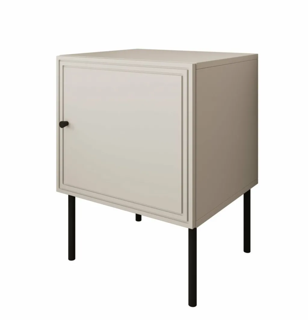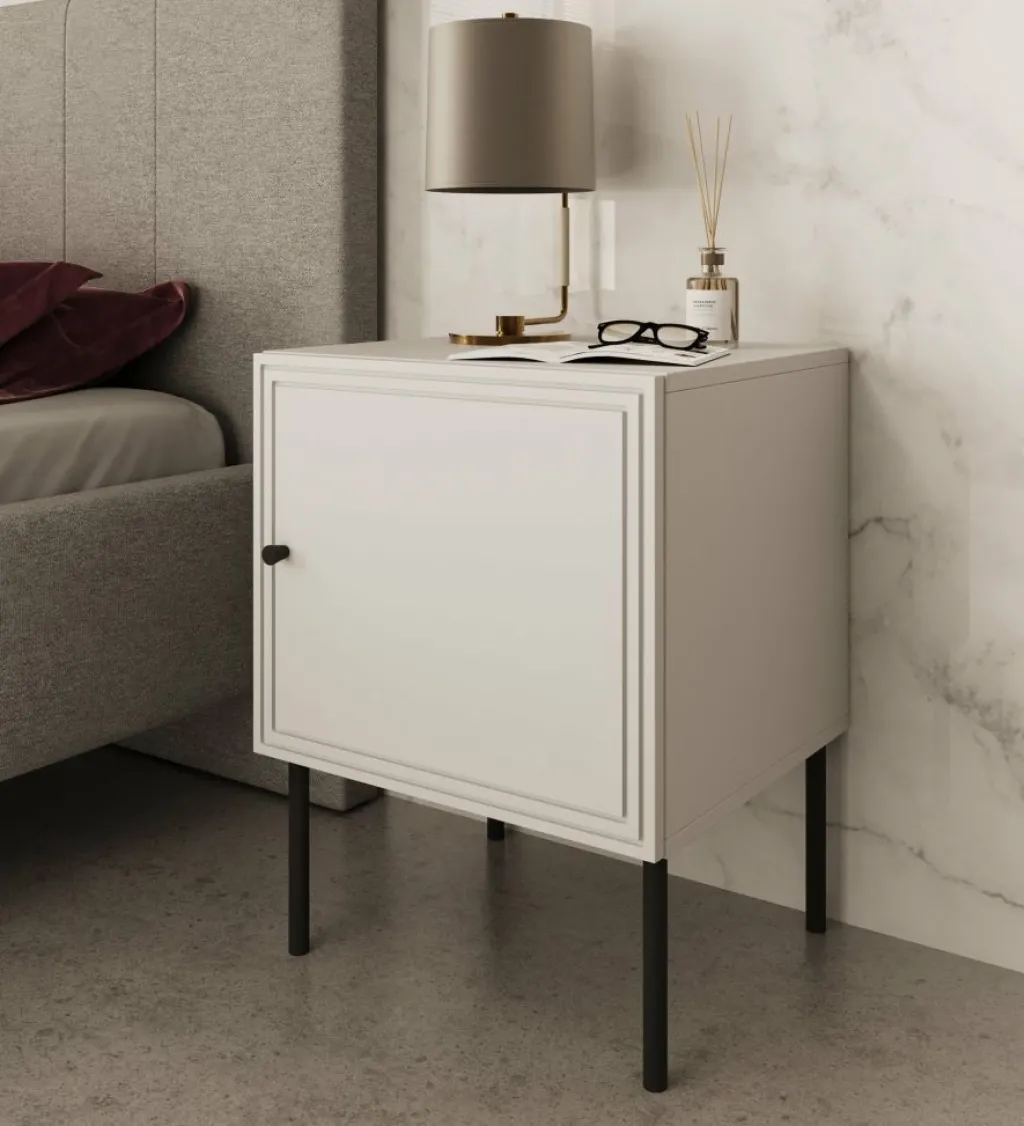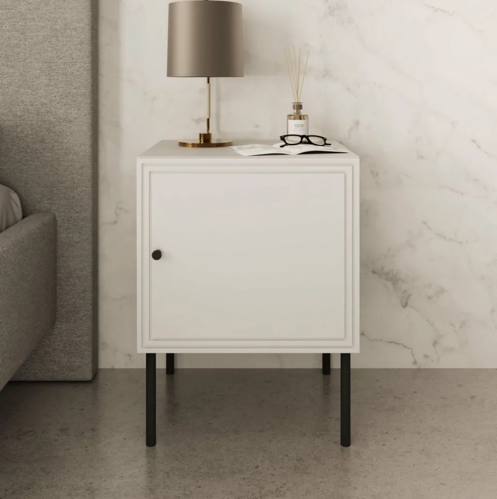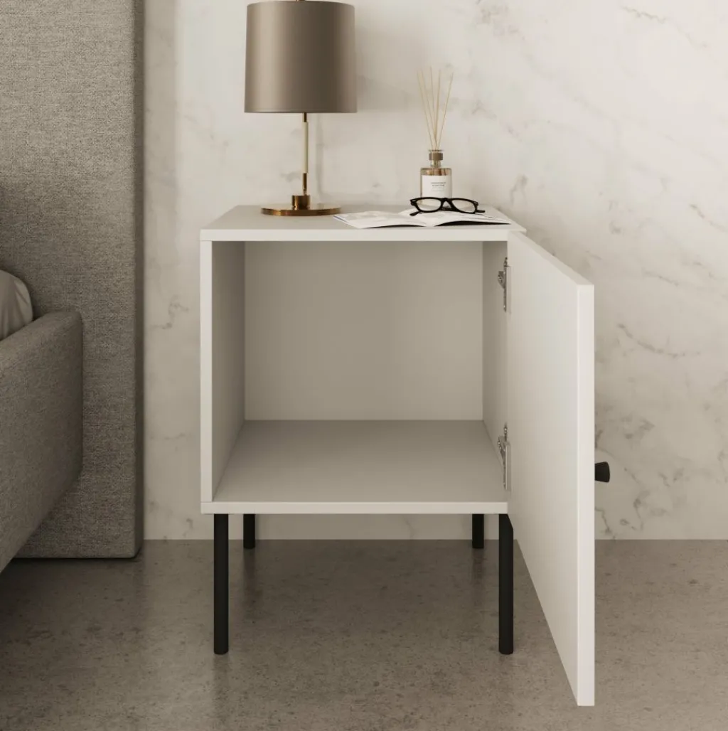 Nachtkastje Pierson is een set van 2 opbergkastjes voor naast het bed. De Pierson beschikt over 1 deurtje die opent met een zwarte knop. Het nachtkastje is uitgevoerd in een witte kleur. De poten zijn gemaakt van metaal in de kleur zwart.