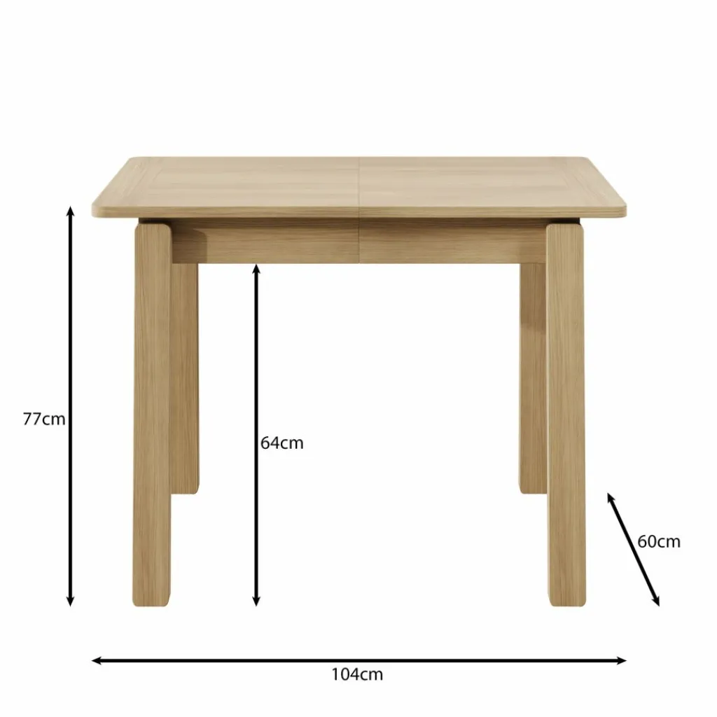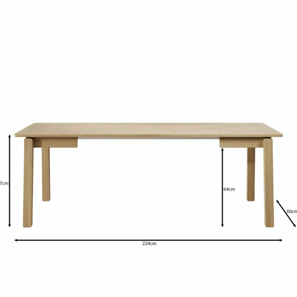 De eetkamertafel Portino is uitgevoerd in licht eikenlook en heeft een afmeting van 104 × 77 × 60 cm. Dankzij het uitschuifbare systeem kan de tafel worden verlengd tot 224 cm, waardoor je flexibel extra zitplaatsen creëert wanneer dat nodig is. Dit maakt de tafel geschikt voor zowel dagelijks gebruik als momenten waarop je meer ruimte aan tafel wilt.