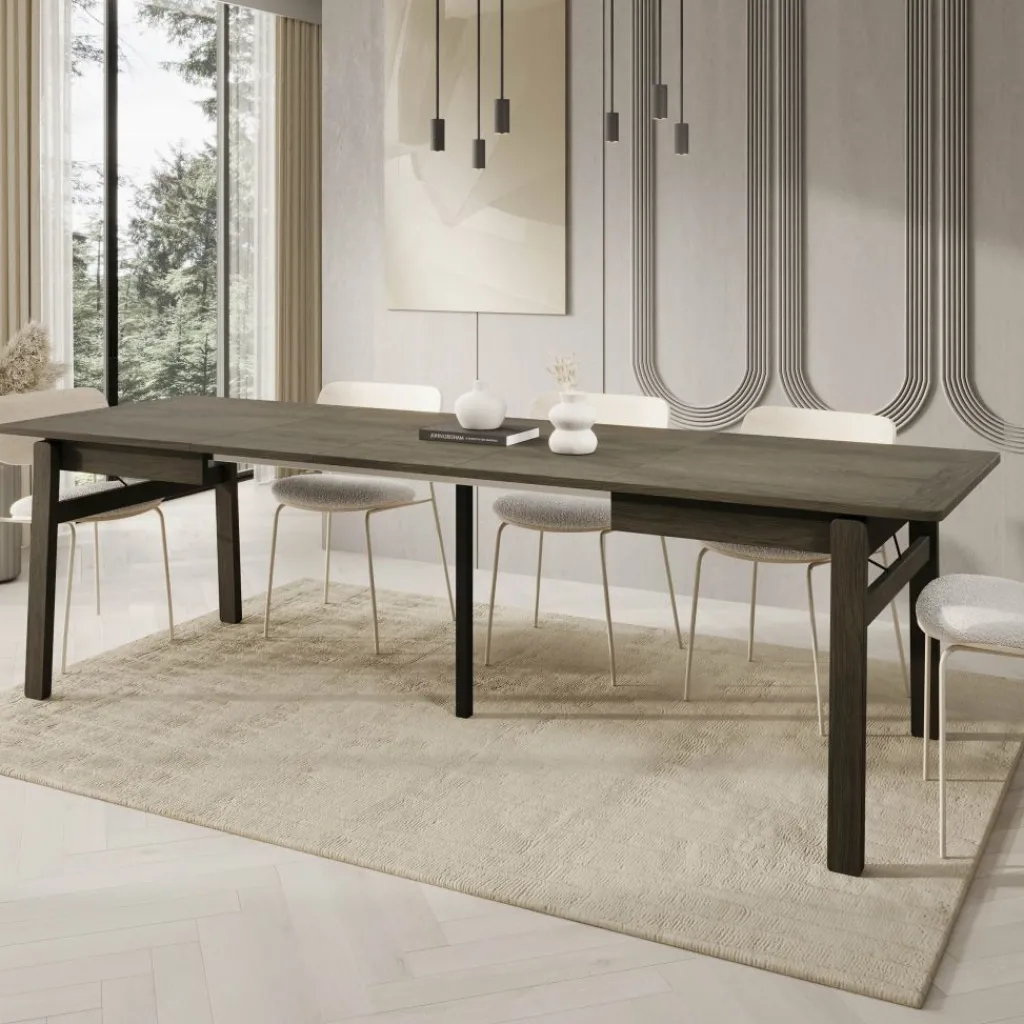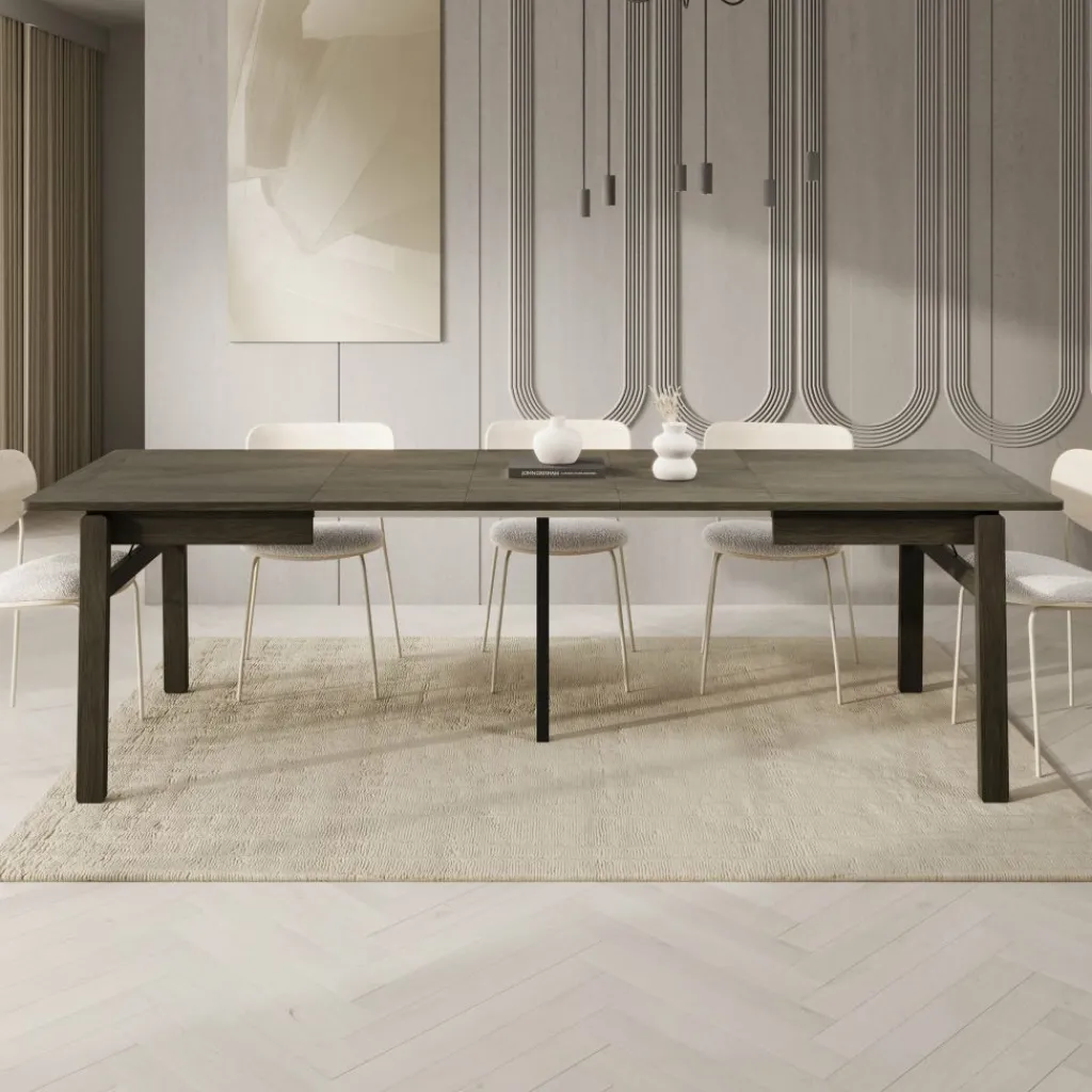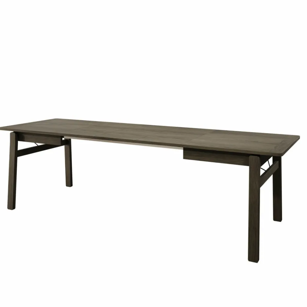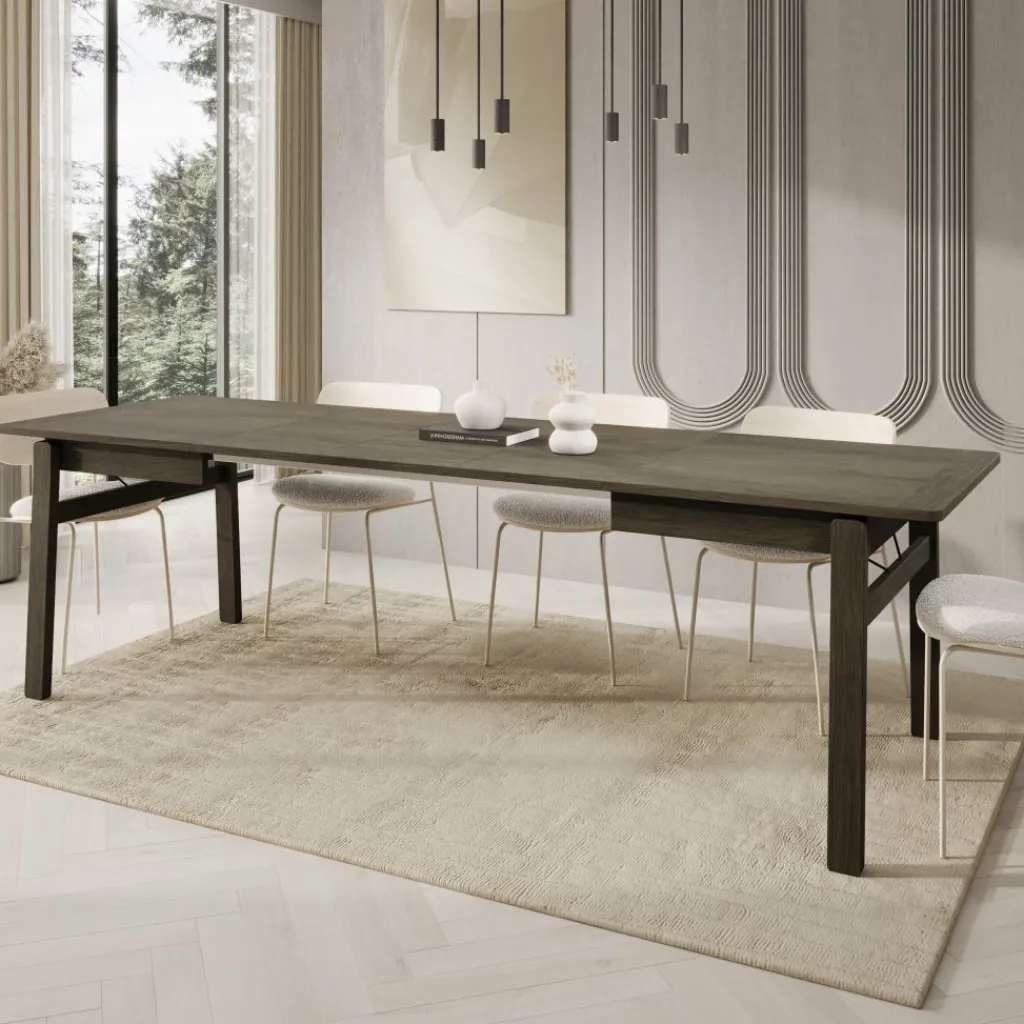 De donker eikenlook afwerking geeft de tafel een krachtige en verzorgde uitstraling die goed past in moderne eetkamers. Dankzij de rechte vormgeving en stabiele poten biedt de Portino voldoende ruimte en ondersteuning voor stoelen rondom, zowel in gesloten als uitgeschoven stand.