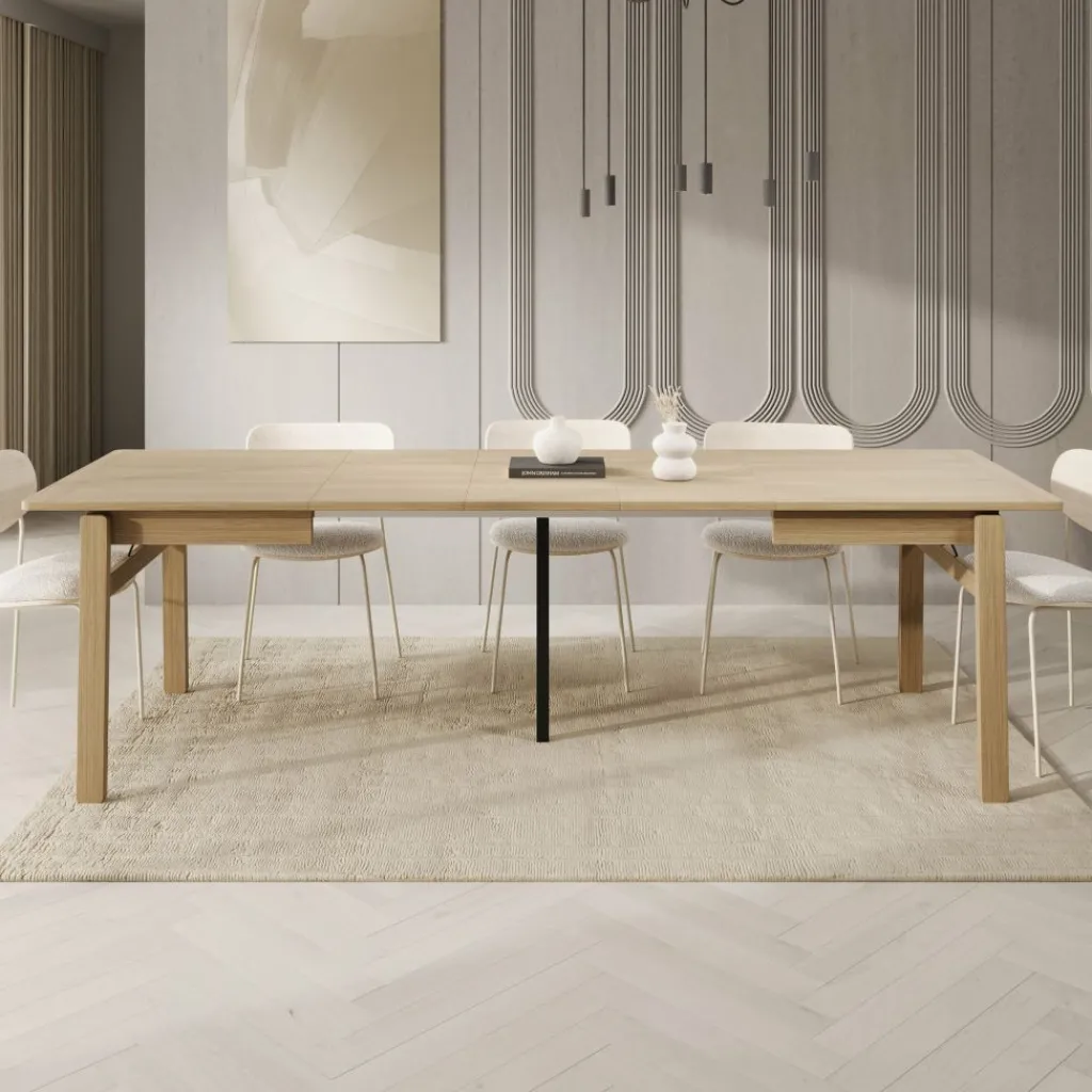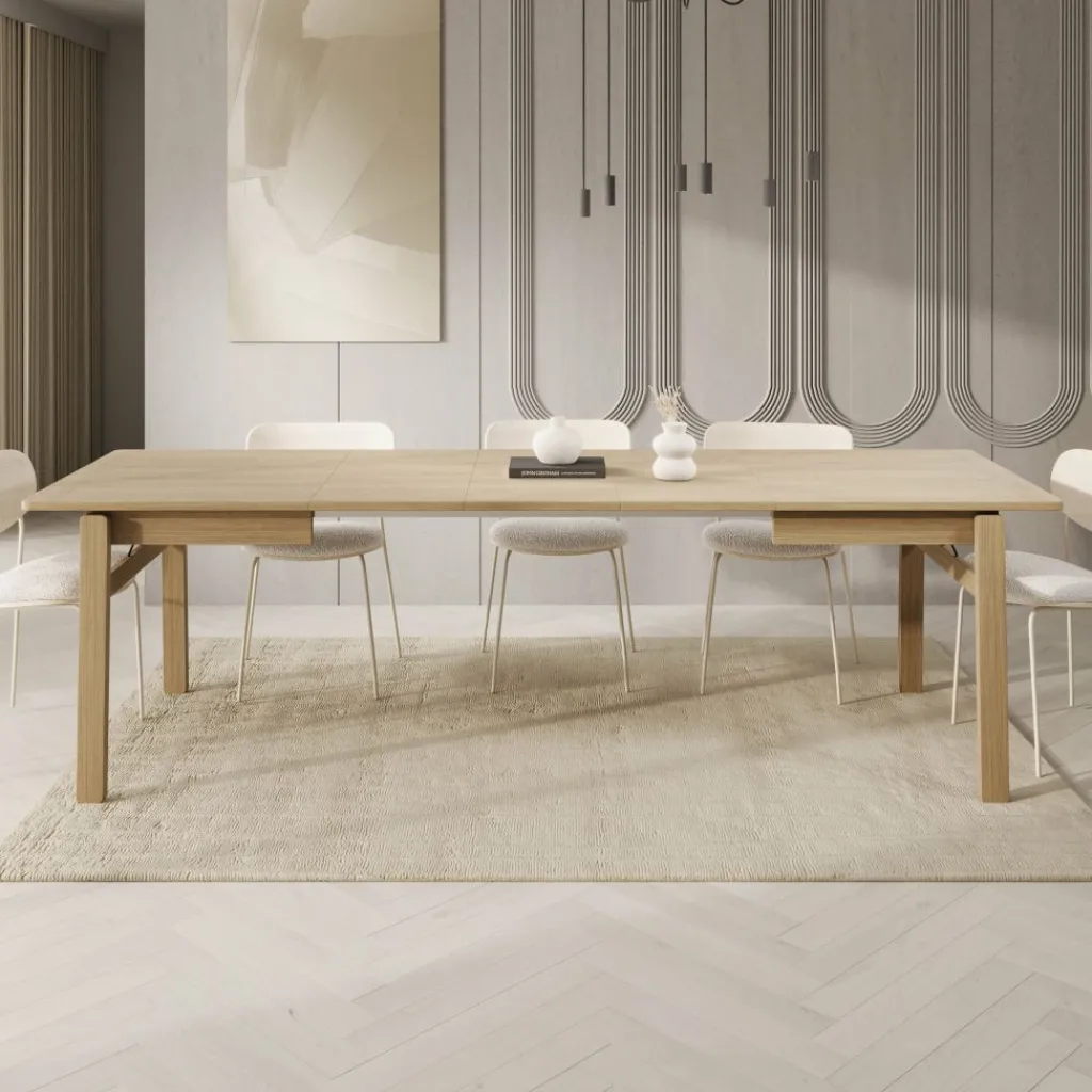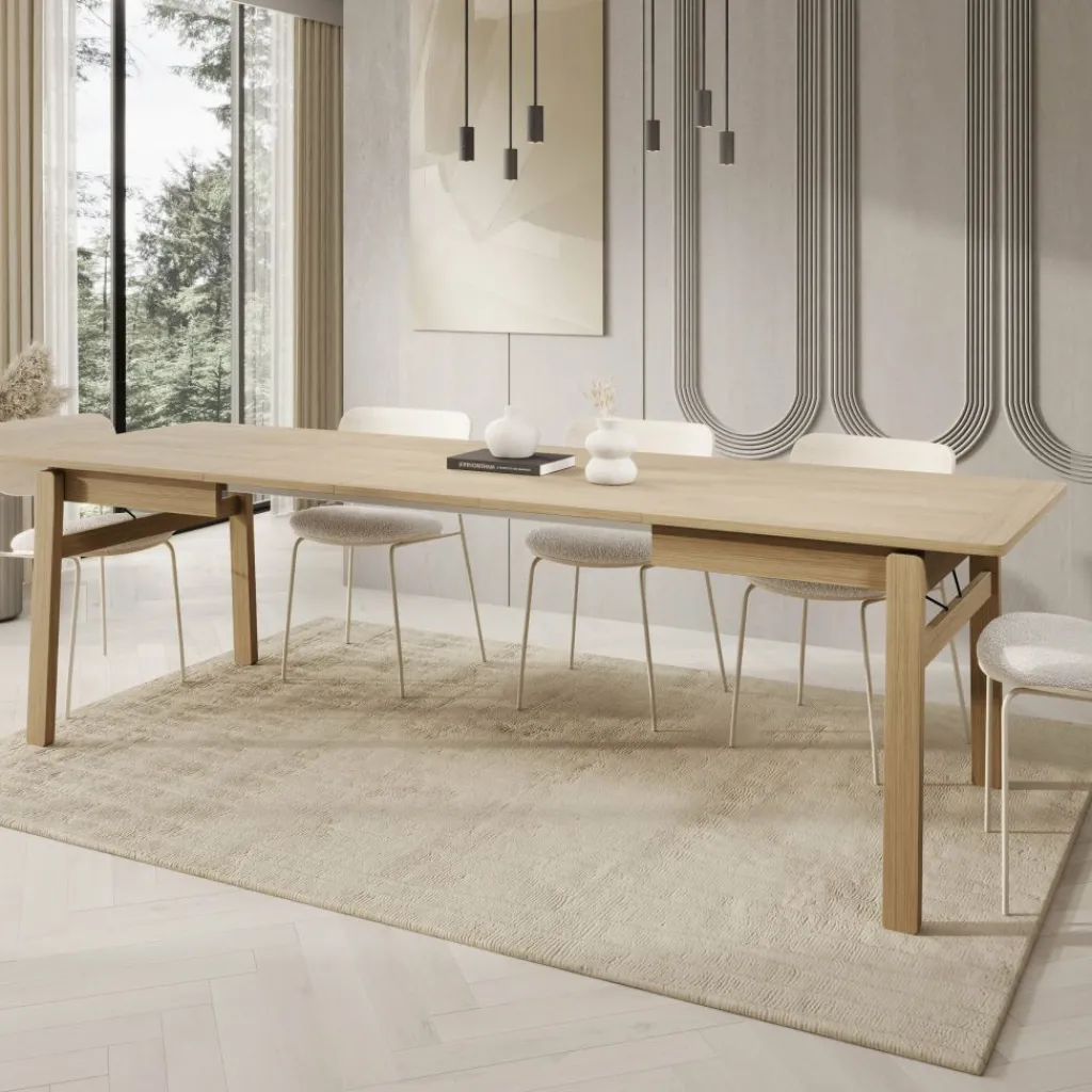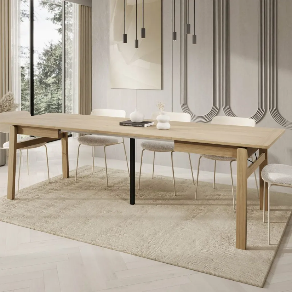 De licht eikenlook afwerking geeft de Portino een neutrale en frisse uitstraling die goed aansluit bij moderne en eigentijdse eetkamers. Door de royale afmetingen in uitgeschoven stand biedt de tafel veel ruimte rondom en is hij praktisch in gebruik voor verschillende situaties.