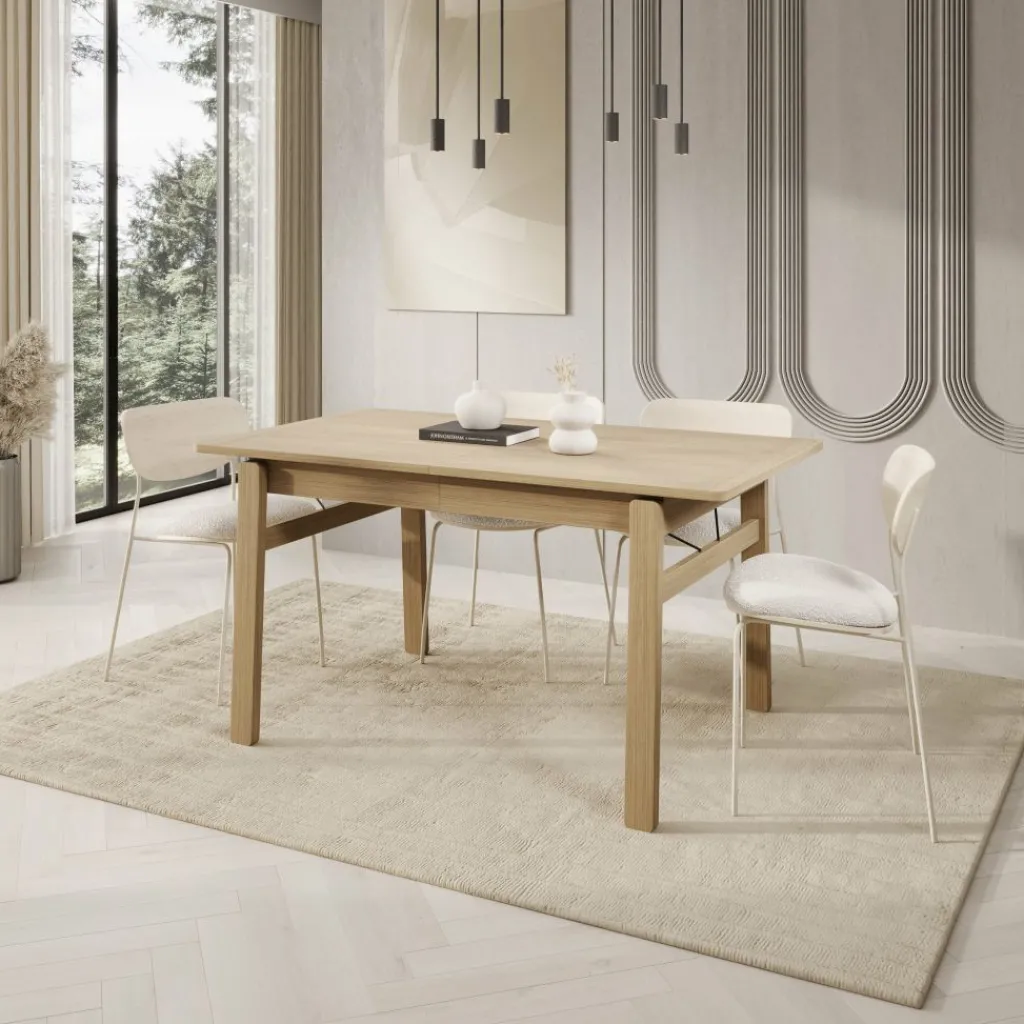 De eetkamertafel Portino is uitgevoerd in licht eikenlook en heeft een afmeting van 149 × 77 × 85 cm. Dankzij het uitschuifbare systeem kan de tafel worden verlengd tot 269 cm, waardoor je eenvoudig extra zitplaatsen creëert wanneer dat nodig is. Dit maakt de tafel geschikt voor zowel dagelijks gebruik als grotere gezelschappen.