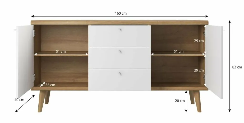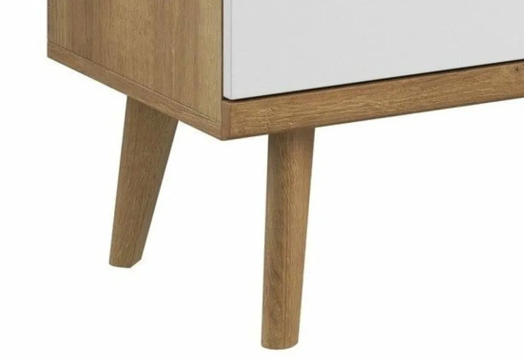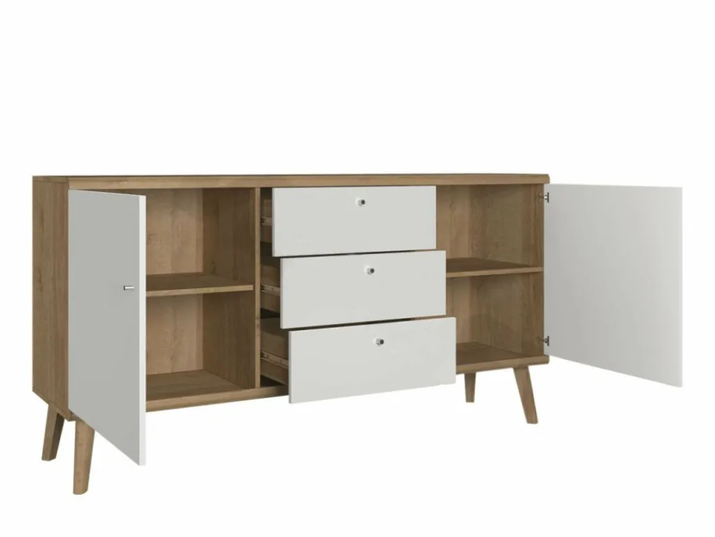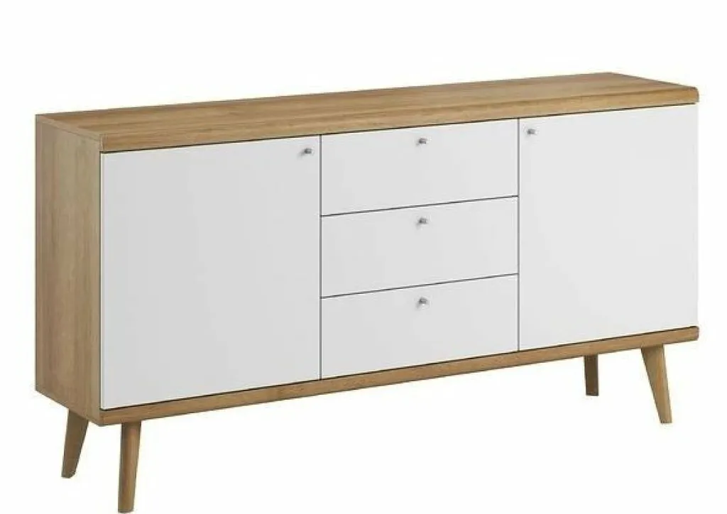 Dressoir Primavera is een praktisch dressoir met voldoende opbergruimte en een moderne look. De gehele kast is uitgevoerd in een neutrale licht eiken kleur met mat witte deuren en lades. Dit meubel is voorzien van twee deuren met daarachter voldoende opbergruimte middels een legplank. In het midden bevinden zich drie handige lades. De kast staat op schuine pootjes. Deze poten kunnen iets lichter of juist donkerder van kleur zijn in vergelijking met de rest van het meubel aangezien deze gemaakt zijn van hout. Dressoir Primavera is onderdeel van een uitgebreid woonprogramma waarmee je een compleet nieuwe sfeer in huis kan creëren. Door het neutrale kleurgebruik is dit meubel geschikt voor iedere stijl interieur.