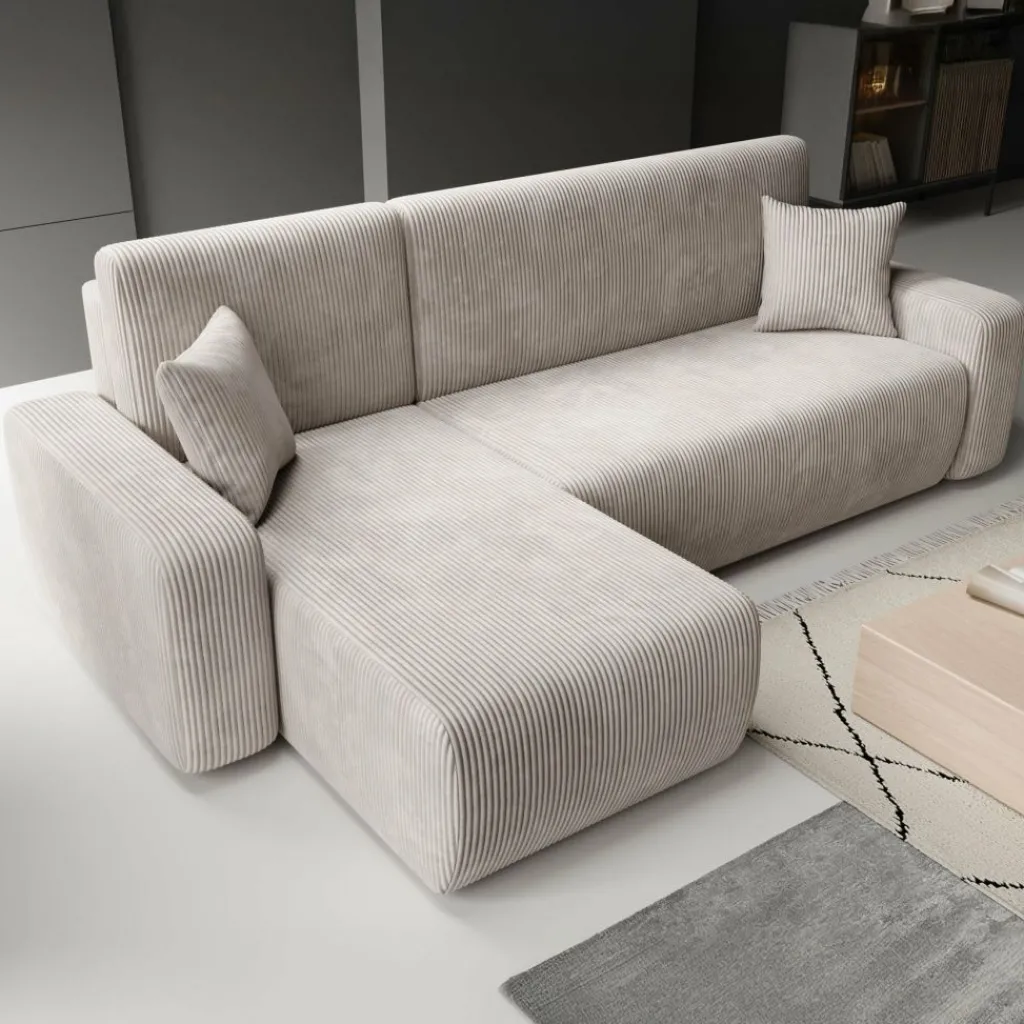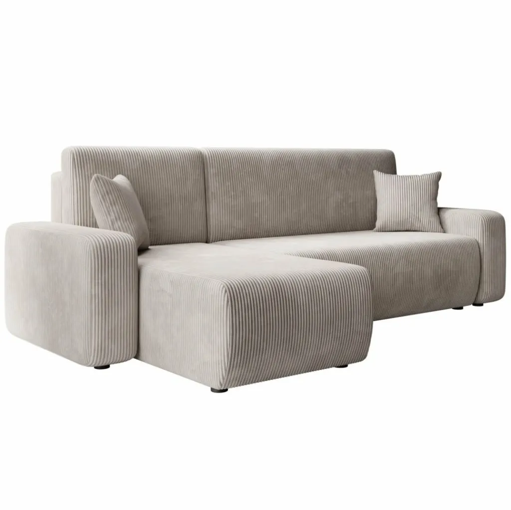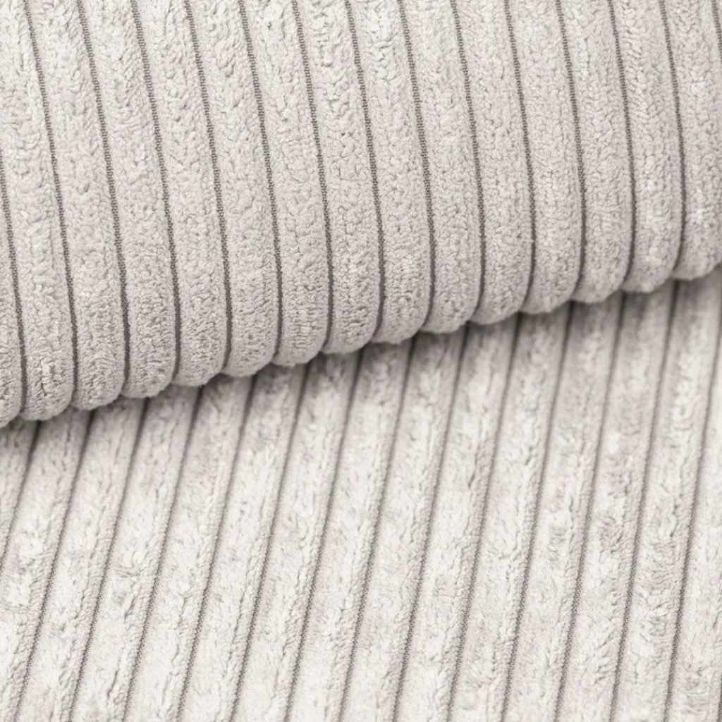 Dankzij het universele ontwerp plaats je het loungegedeelte links óf rechts, precies zoals het in jouw ruimte past. De bank is bekleed met een zachte ribstof in een lichte beige kleur – heerlijk comfortabel en tegelijkertijd slijtvast en sfeervol. De brede armleuningen en afgeronde hoeken geven de bank een moderne look.