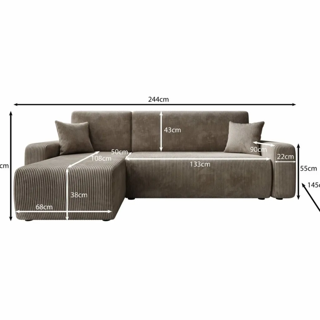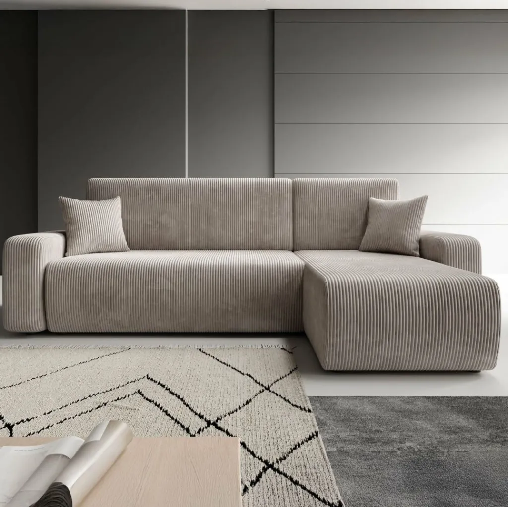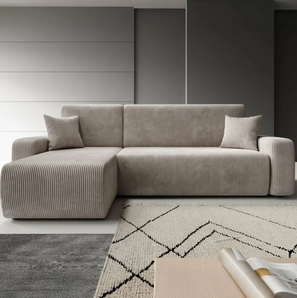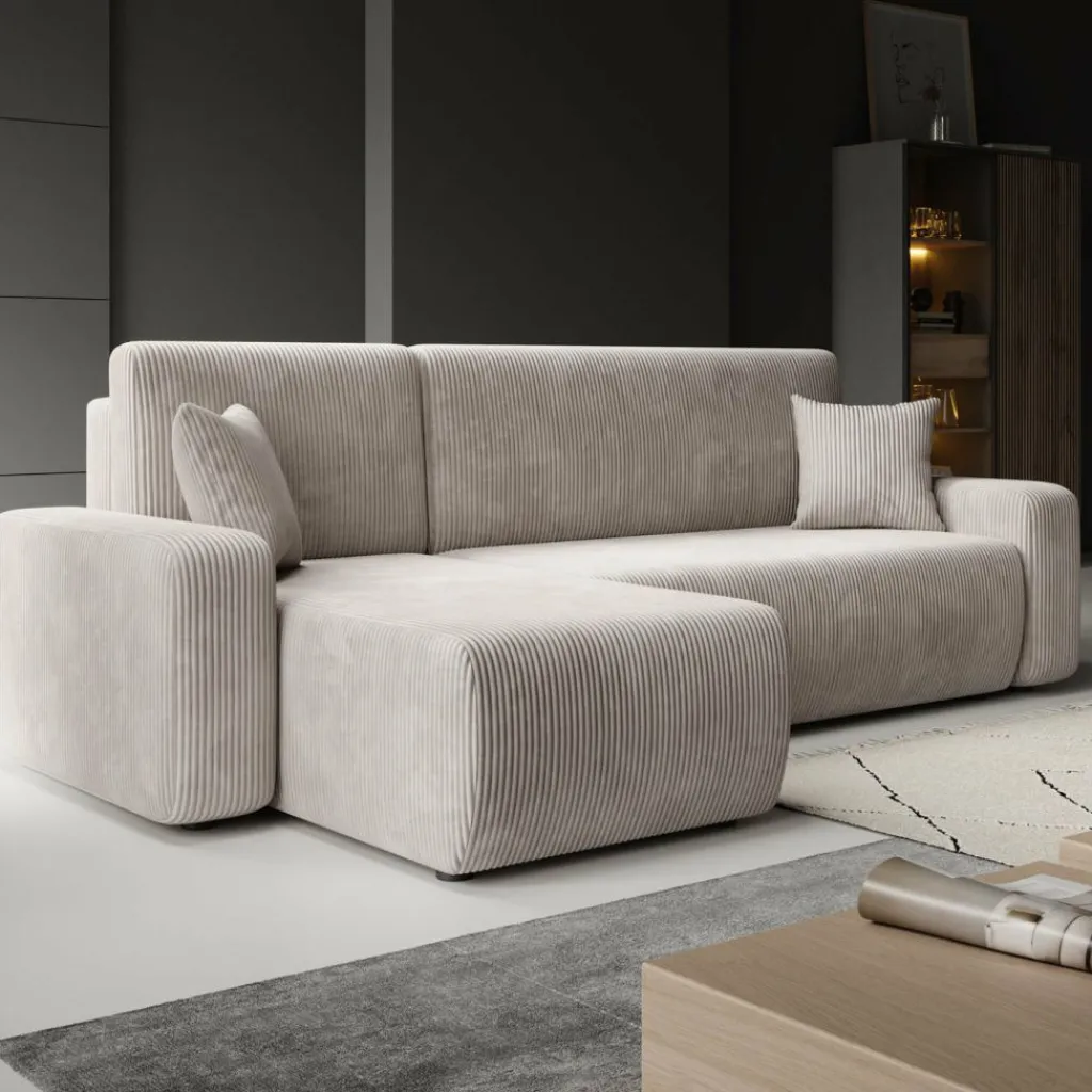 Dankzij het universele ontwerp plaats je het loungegedeelte links óf rechts, precies zoals het in jouw ruimte past. De bank is bekleed met een zachte ribstof in een lichte beige kleur – heerlijk comfortabel en tegelijkertijd slijtvast en sfeervol. De brede armleuningen en afgeronde hoeken geven de bank een moderne look.