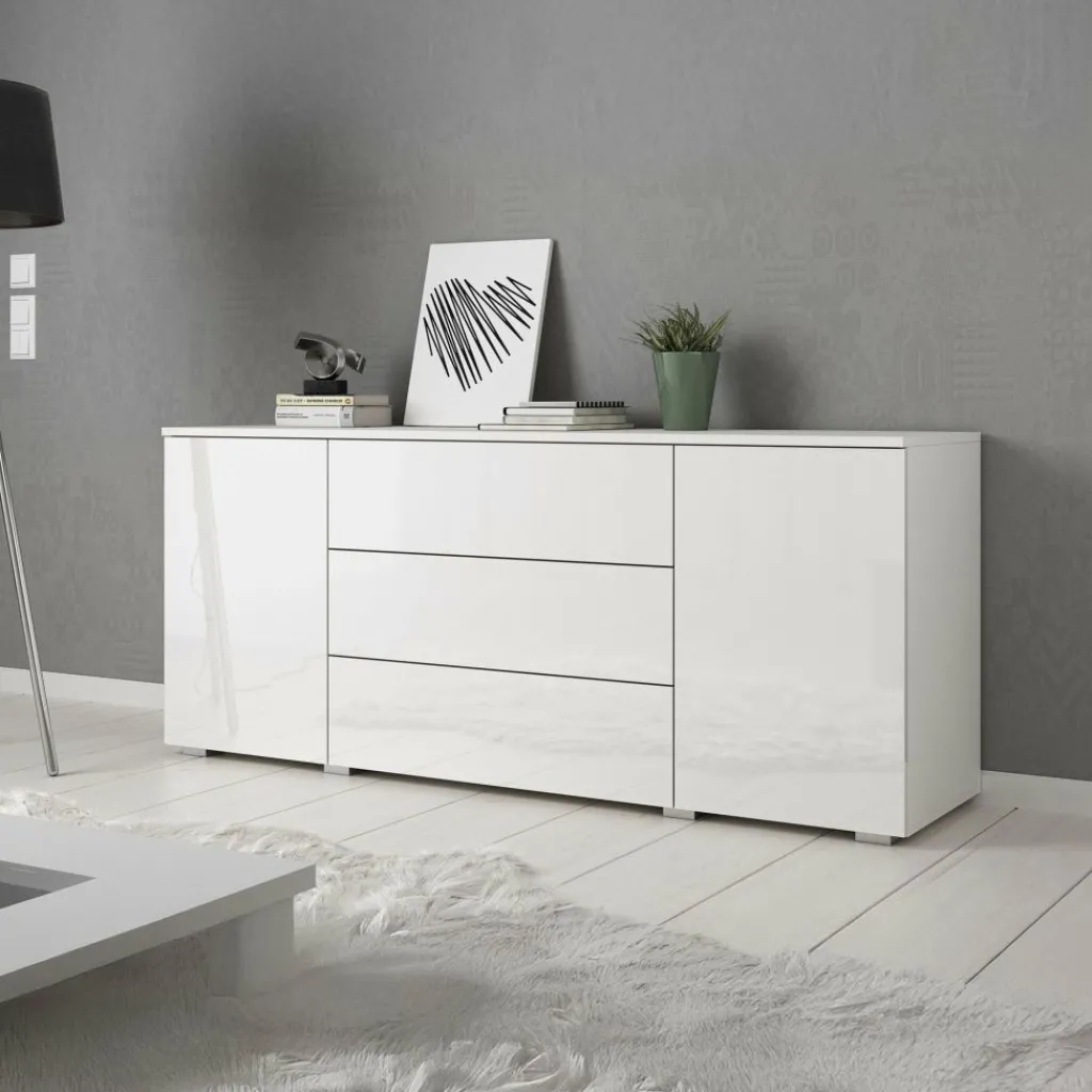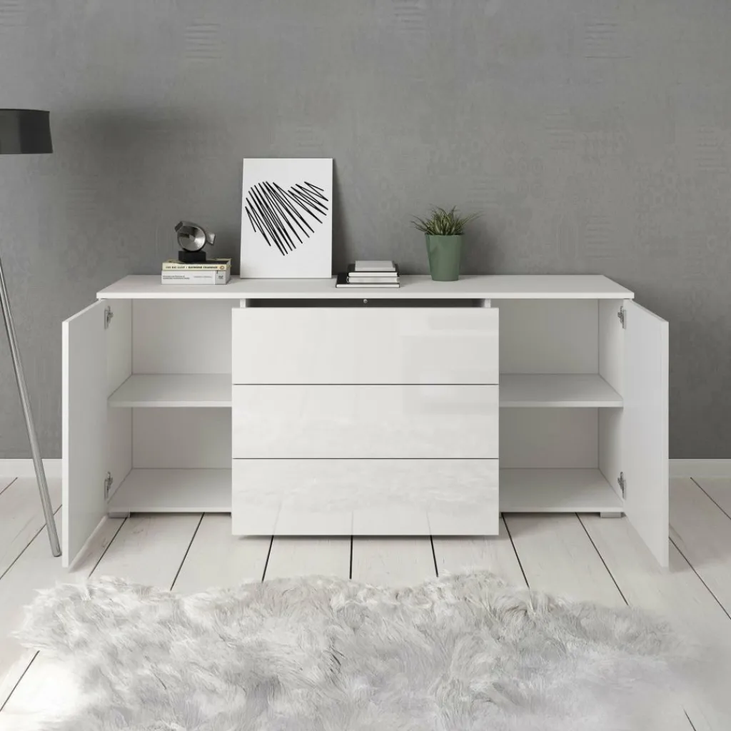 Dressoir Pure is een praktisch en moderne designkast, uitgevoerd in een witte kleur. De voorzijde is geheel uitgevoerd in hoogglans wit. De ombouw in mat wit. De kast beschikt over 2 openslaande deuren en 3 brede opberglades. Door het strakke en eenvoudige design is dit meubel vooral passend binnen een moderne woonstijl.