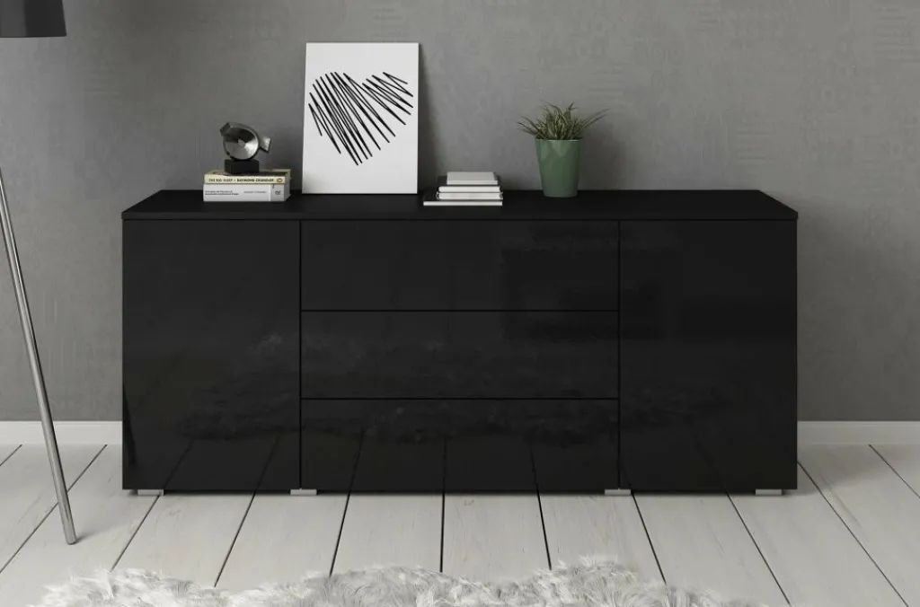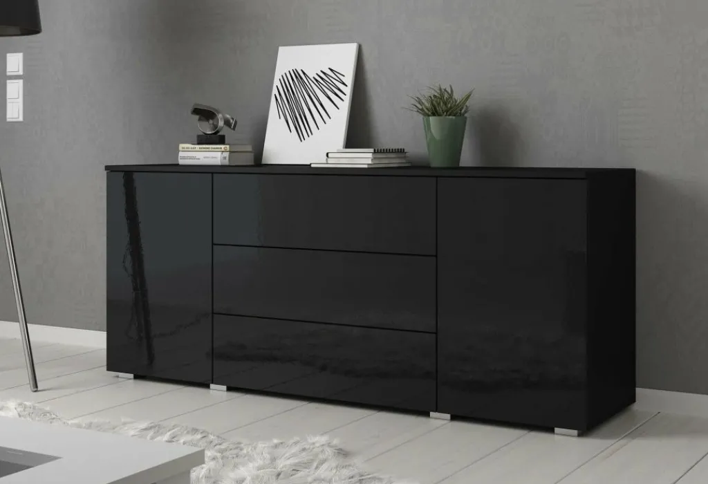 Dressoir Pure is een praktisch en moderne designkast, uitgevoerd in een zwarte kleur. De voorzijde is geheel uitgevoerd in hoogglans zwart. De ombouw in mat zwart. De kast beschikt over 2 openslaande deuren en 3 brede opberglades. Door het strakke en eenvoudige design is dit meubel vooral passend binnen een moderne woonstijl.