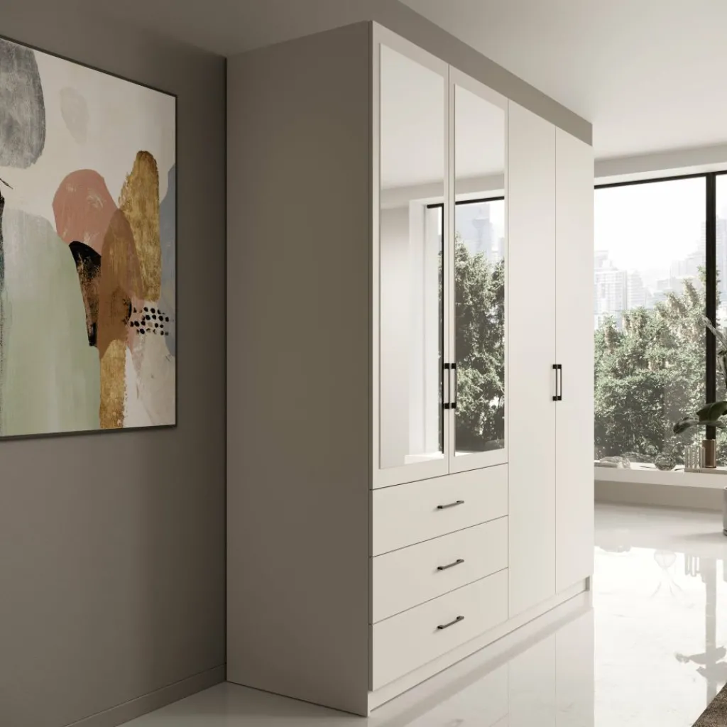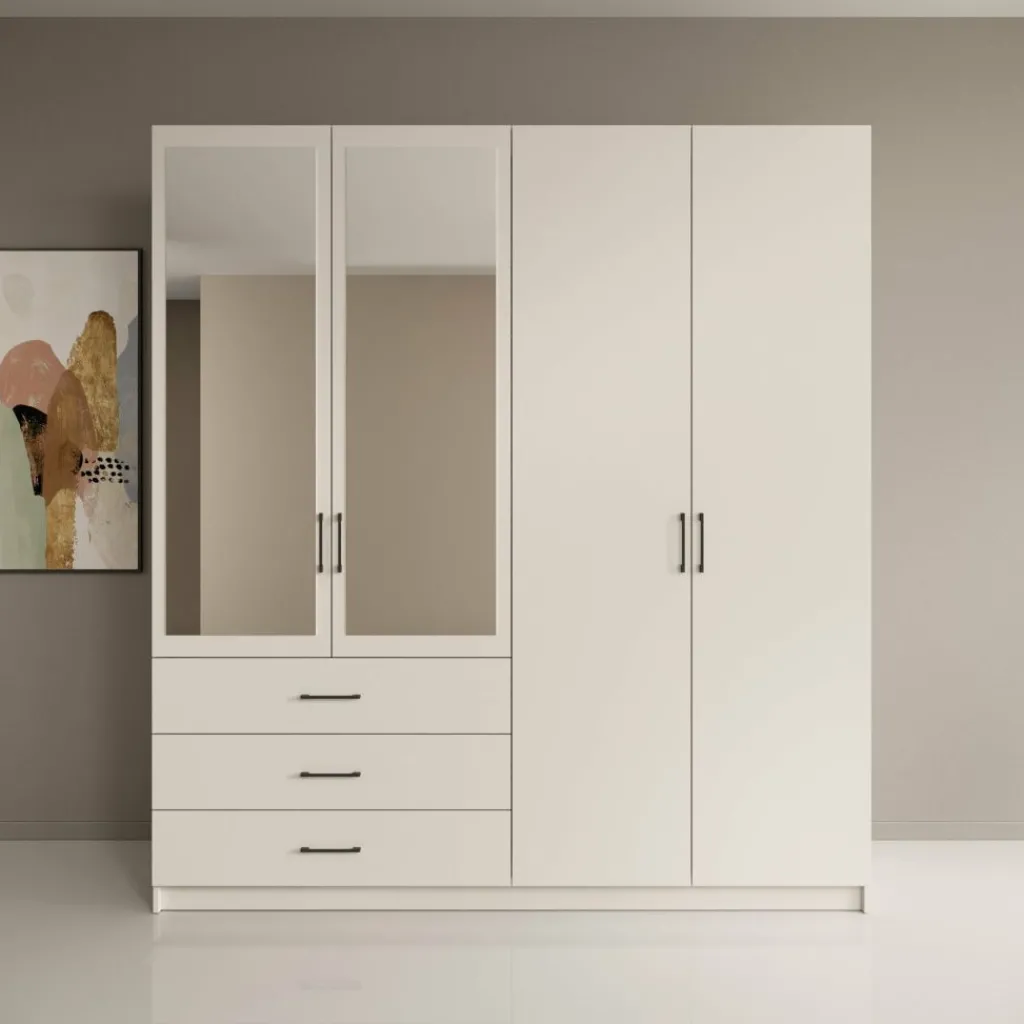 Aan de linkerzijde is de kast voorzien van meerdere legplanken boven drie lades, geschikt voor gevouwen kleding en kleinere items. De rechterzijde bestaat uit een hanggedeelte met daaronder een extra onderplank, ideaal voor jassen, jurken en andere langere kledingstukken. De vier draaideuren zorgen voor een duidelijke scheiding tussen de verschillende opbergzones en bieden gemakkelijke toegang. De zwarte handgrepen vormen een strak contrast met de beige afwerking.