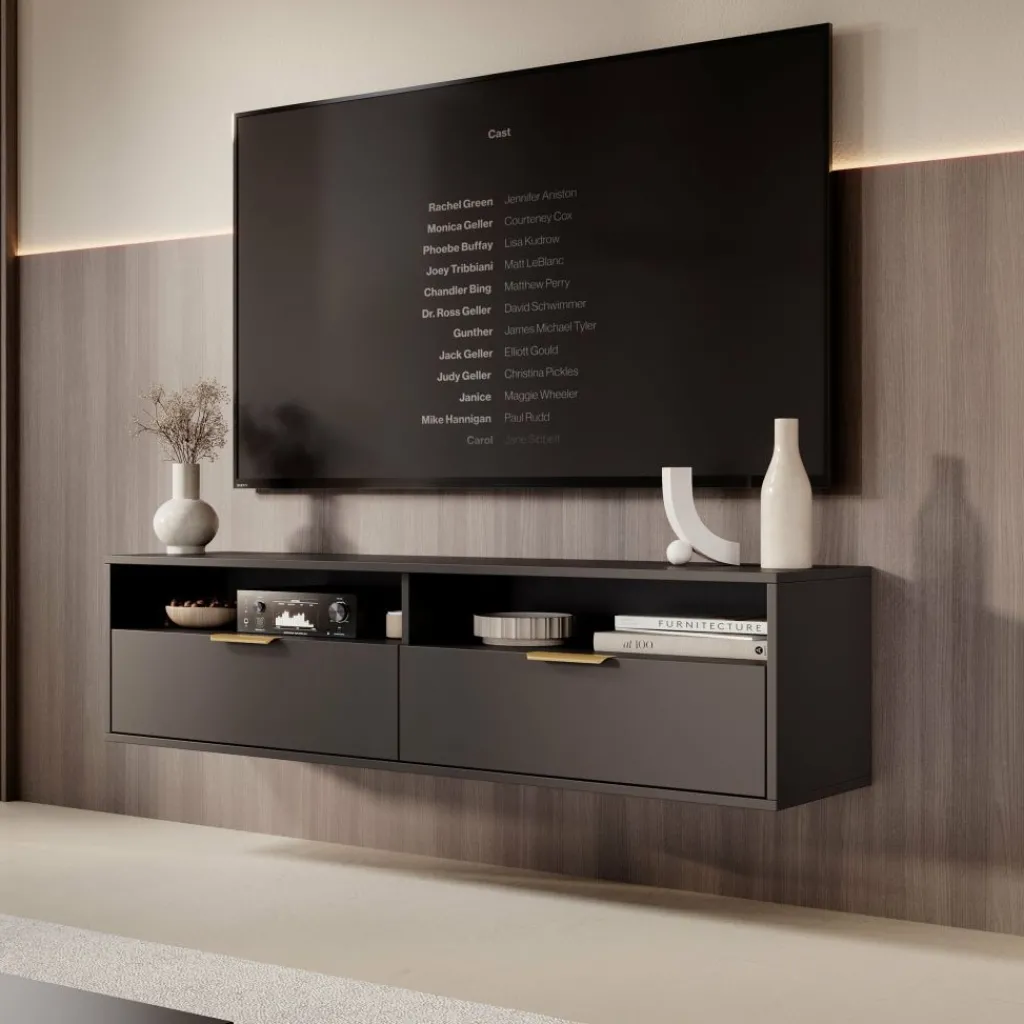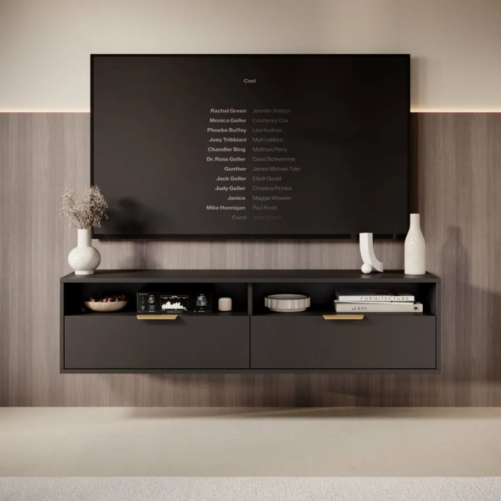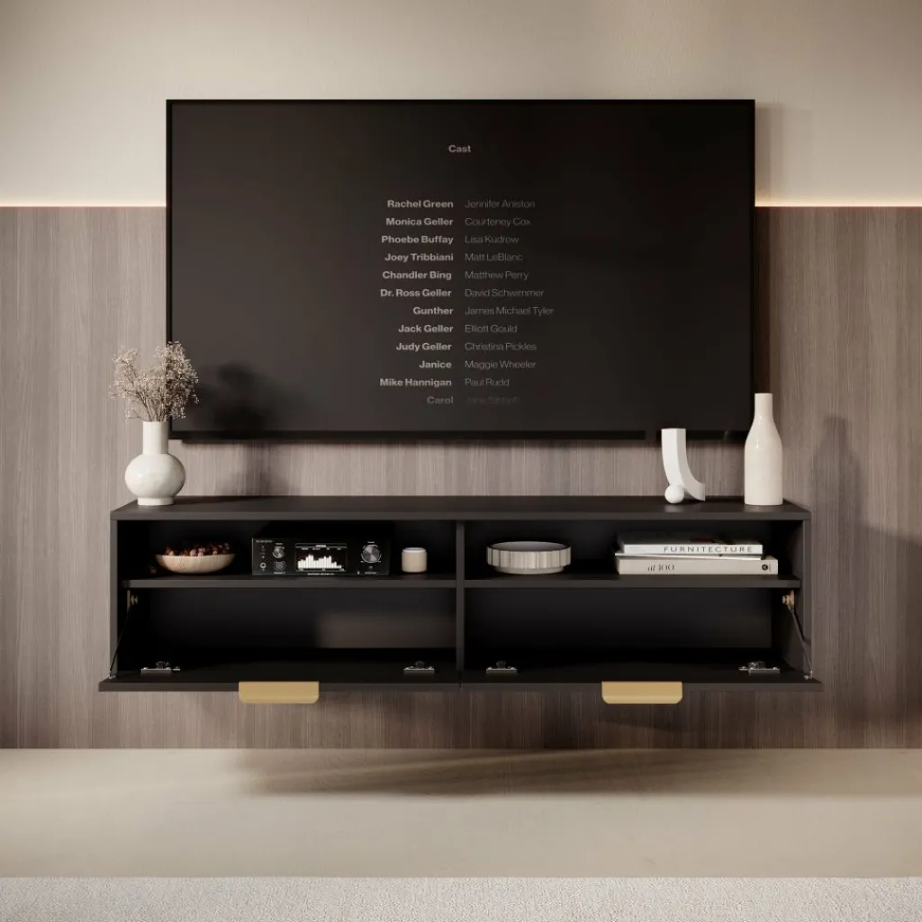 TV-meubel Qipp is een strak vormgegeven meubel in zwart met goudkleurige grepen. Het zwevende ontwerp creëert een moderne uitstraling en biedt praktische opbergruimte zonder vloeroppervlak te verliezen.