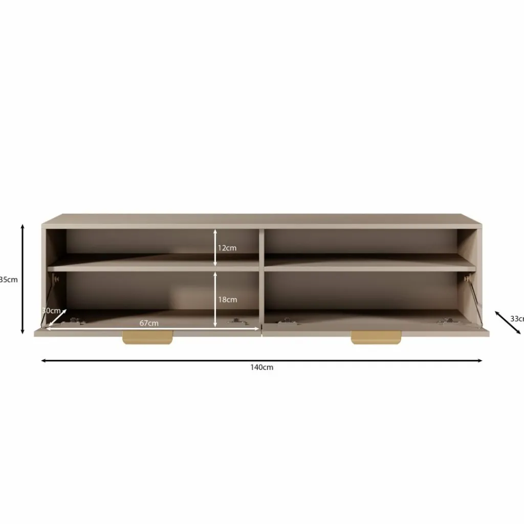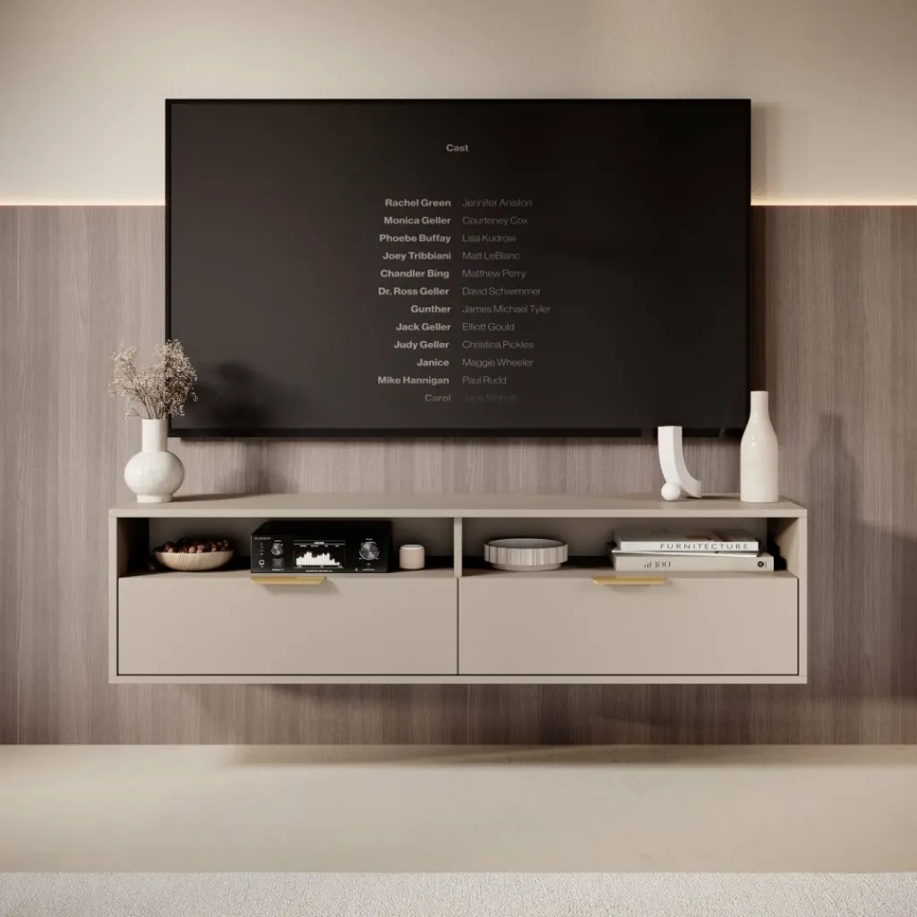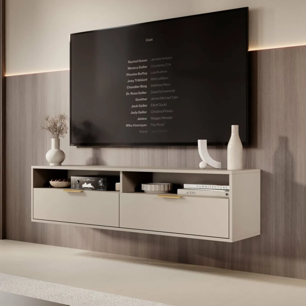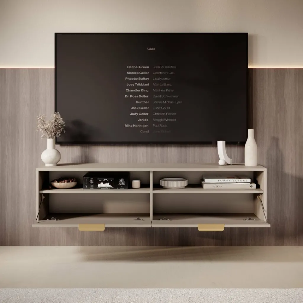 Qipp is een strak vormgegeven TV-meubel in beige met goudkleurige grepen. Het zwevende ontwerp creëert een moderne uitstraling en biedt praktische opbergruimte zonder vloeroppervlak te verliezen.