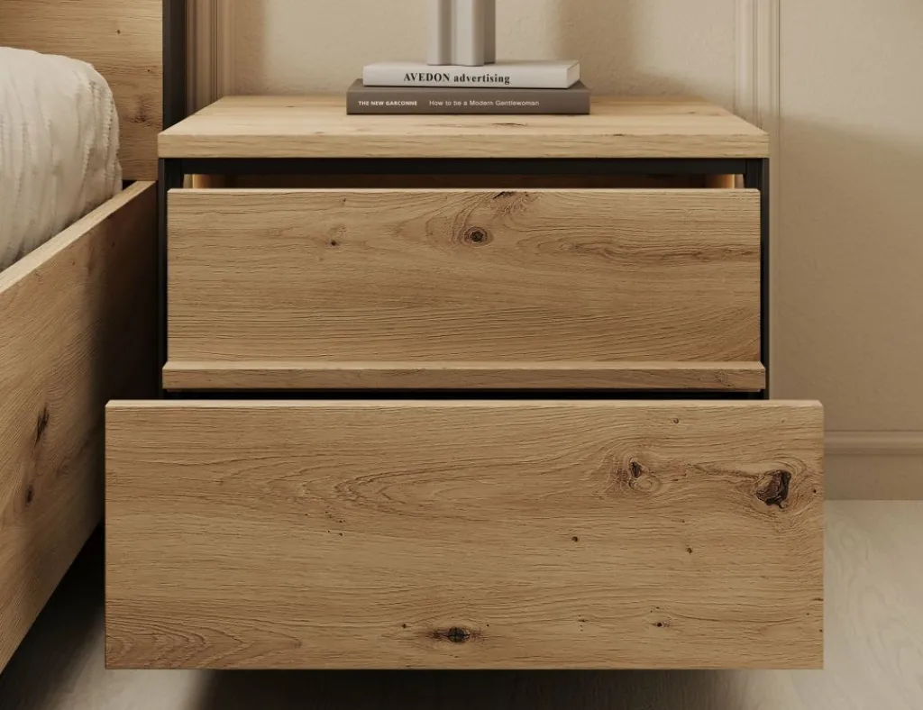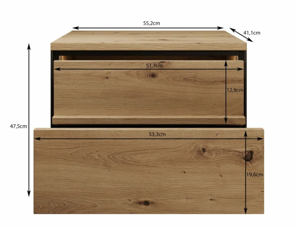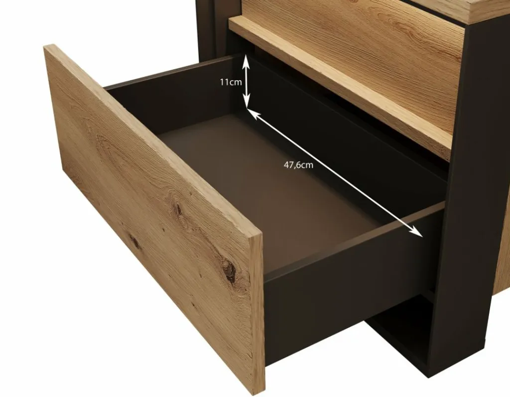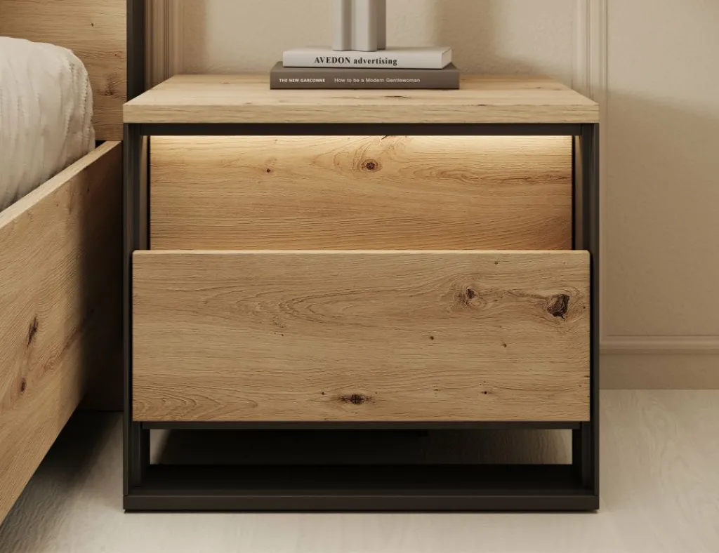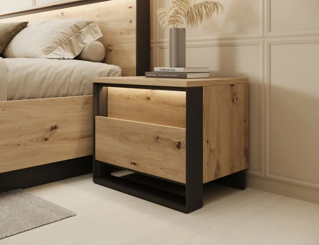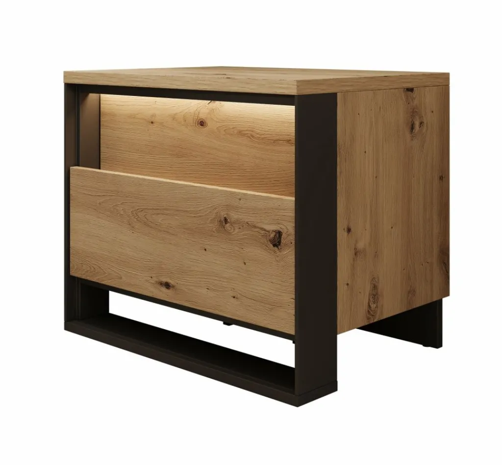 Nachtkastje Quarry is een opbergkastje voor naast het bed in moderne stijl. De Quarry beschikt over 2 lades die te openen zijn met het push to open systeem. In de bovenkant van het meubel is LED-verlichting geplaatst wat het nachtkastje een unieke uitstraling geeft. De Quarry is uitgevoerd in een eiken kleur met zwarte details.