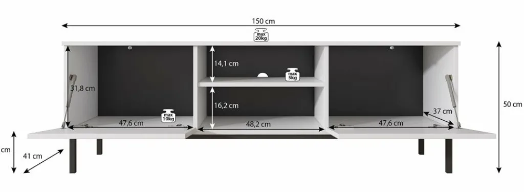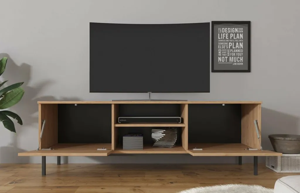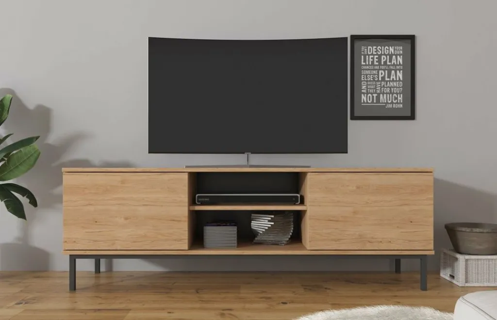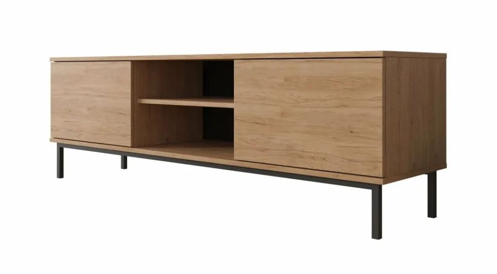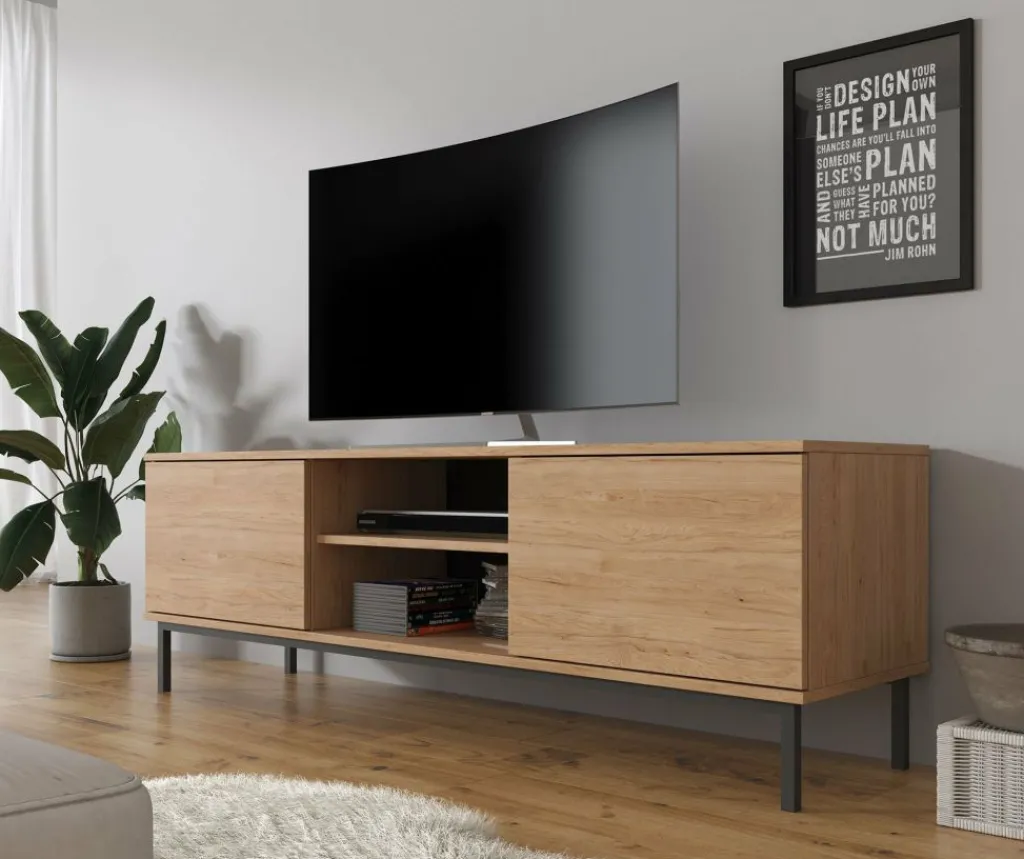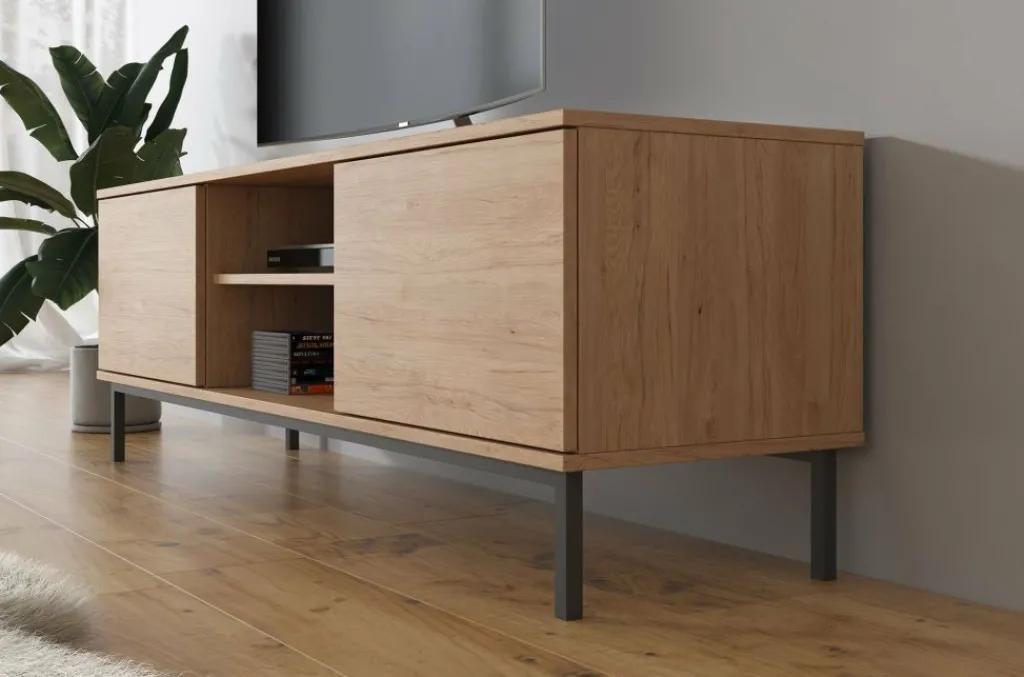 TV-meubel Queen is een industrieel en praktisch vormgegeven meubel met voldoende opbergmogelijkheden. Deze kast heeft een breedte van 150 centimeter en is gemaakt van spaanplaat met een melamine coating in eiken kleur. Dankzij het kleurgebruik en design is dit meubel geschikt voor zowel industriële als moderne interieurs. De kast beschikt over een klepdeur en twee open schappen. Aan de achterzijde bevindt zich een gat om eventuele bedrading weg te werken. De Queen is te combineren met andere meubels uit het woonprogramma Queen.