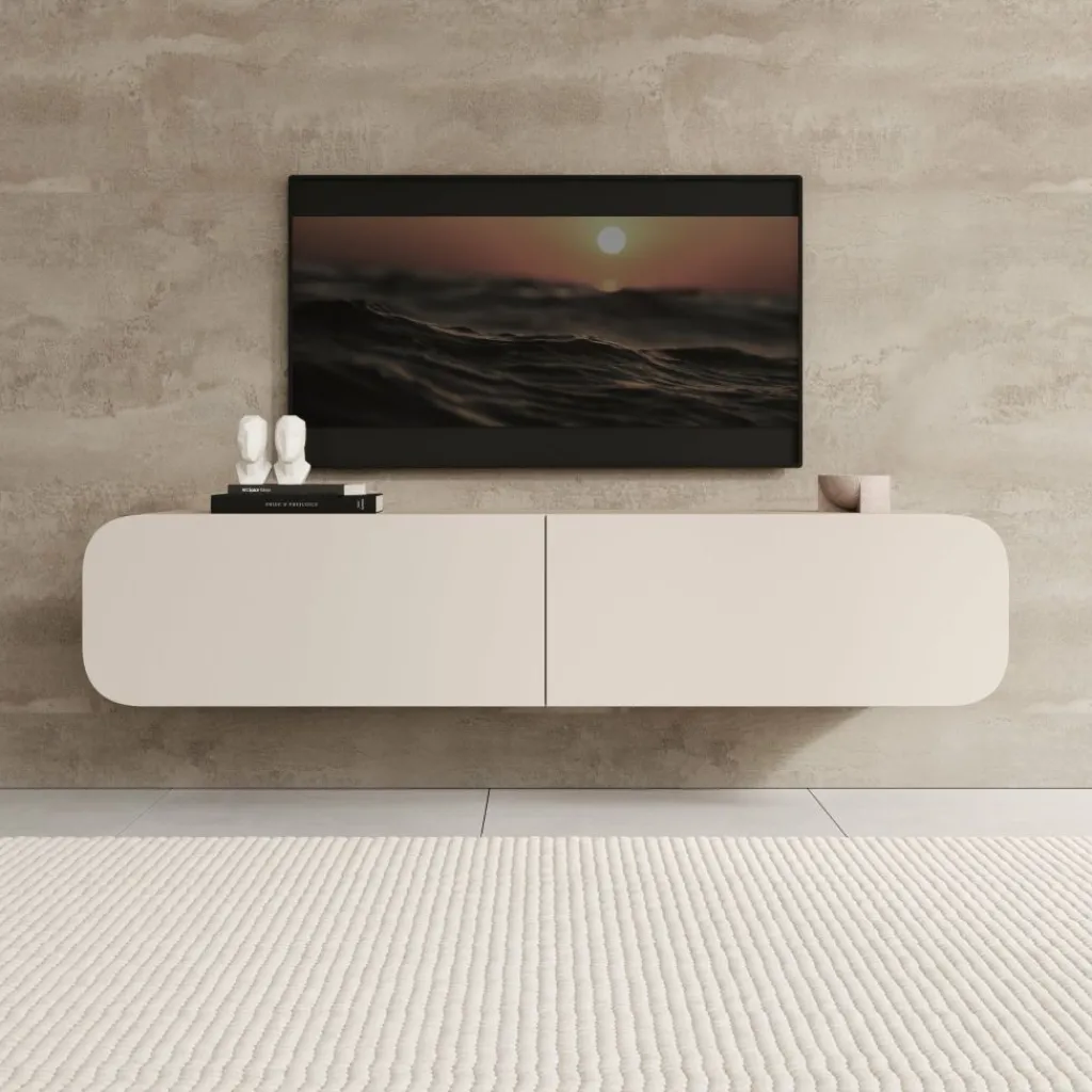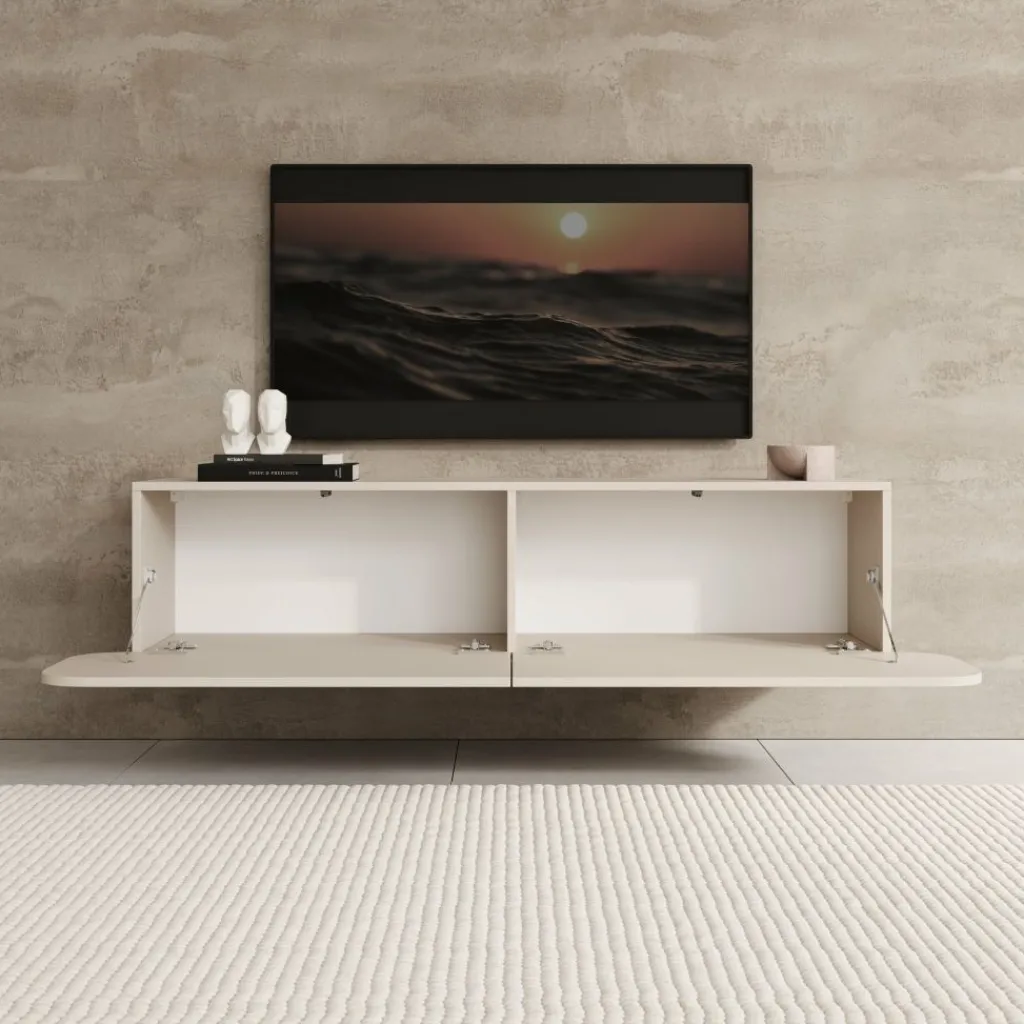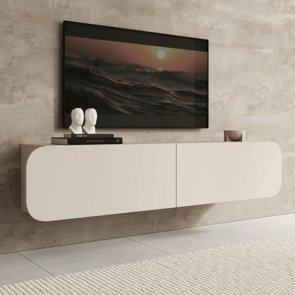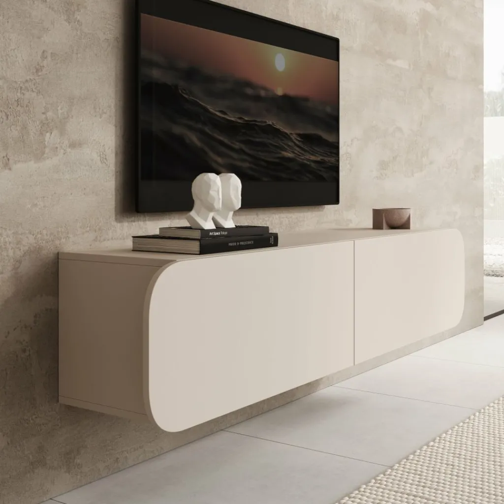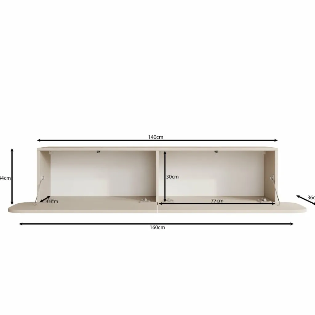 Het Renalto tv-meubel is een strak wandmeubel met een minimalistisch ontwerp en afgeronde zijkanten. Met een breedte van 140 cm, een diepte van 36 cm en een hoogte van 34 cm biedt het meubel praktische opbergruimte voor apparatuur en accessoires, terwijl het compacte formaat goed past in moderne woonkamers.