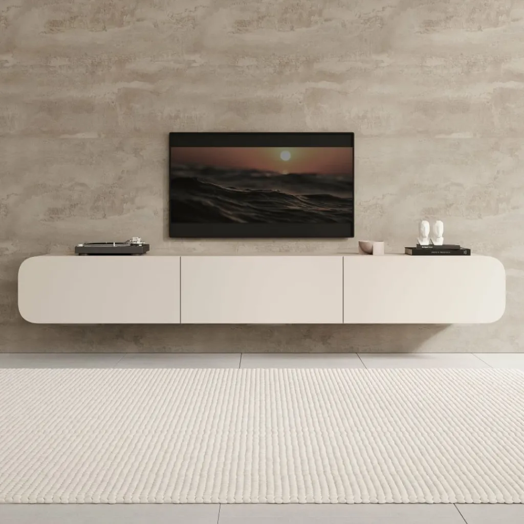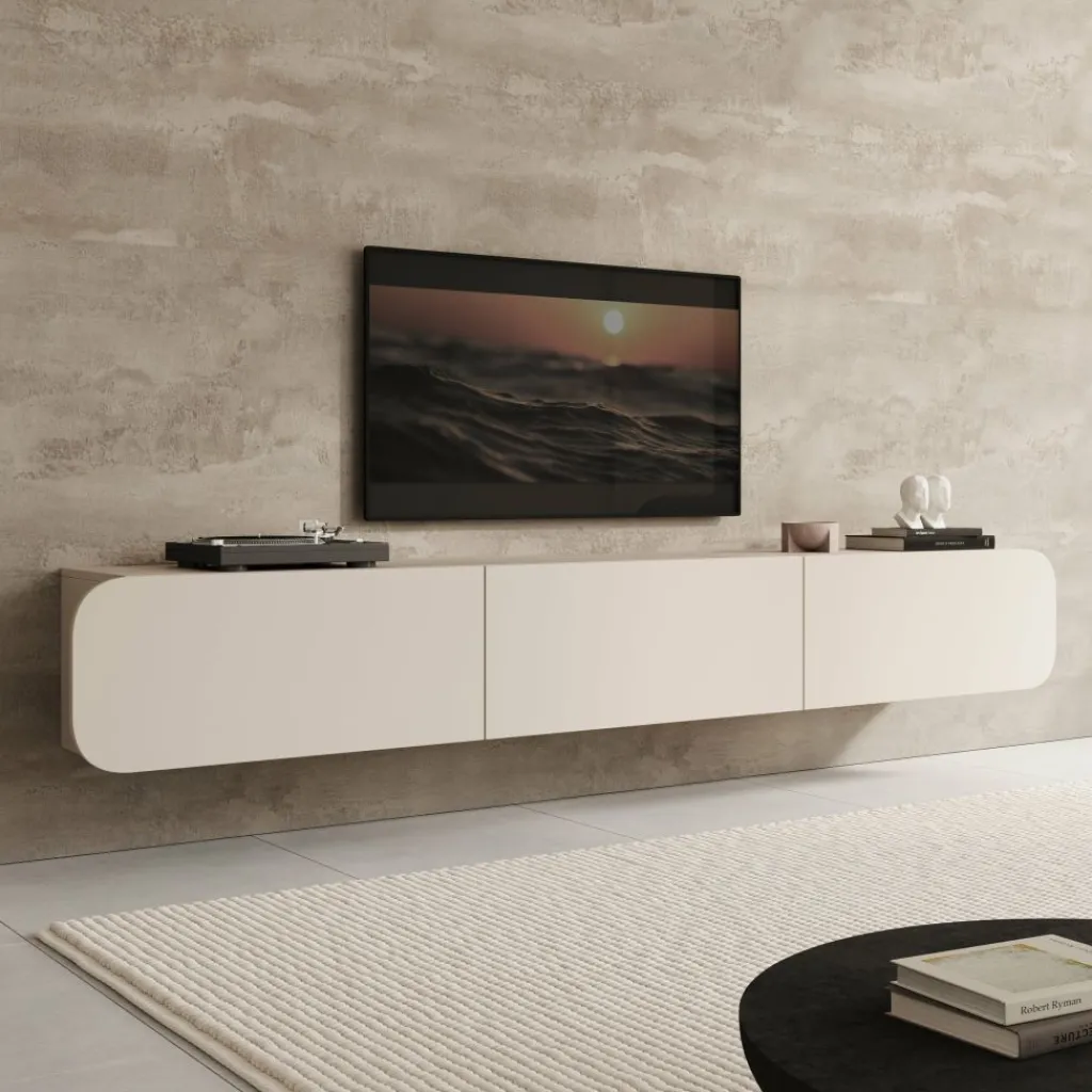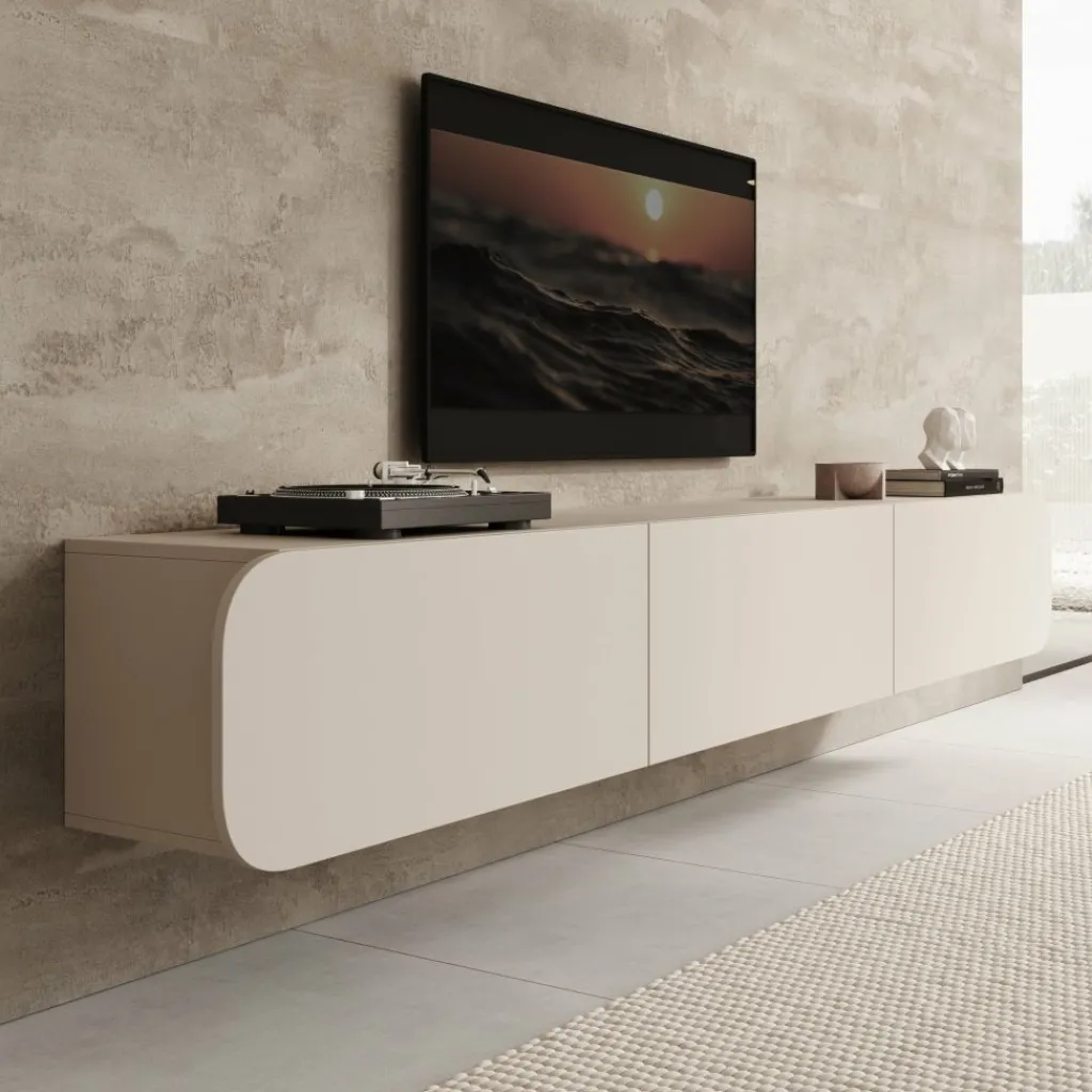 Het Renalto tv-meubel is een modern wandmeubel met een strak en minimalistisch ontwerp. Met een breedte van 220 cm, een diepte van 36 cm en een hoogte van 34 cm biedt het meubel ruime opbergmogelijkheden voor apparatuur en accessoires. Door het zwevende ontwerp en de afgeronde zijkanten oogt het meubel licht en past het goed in moderne woonkamers.