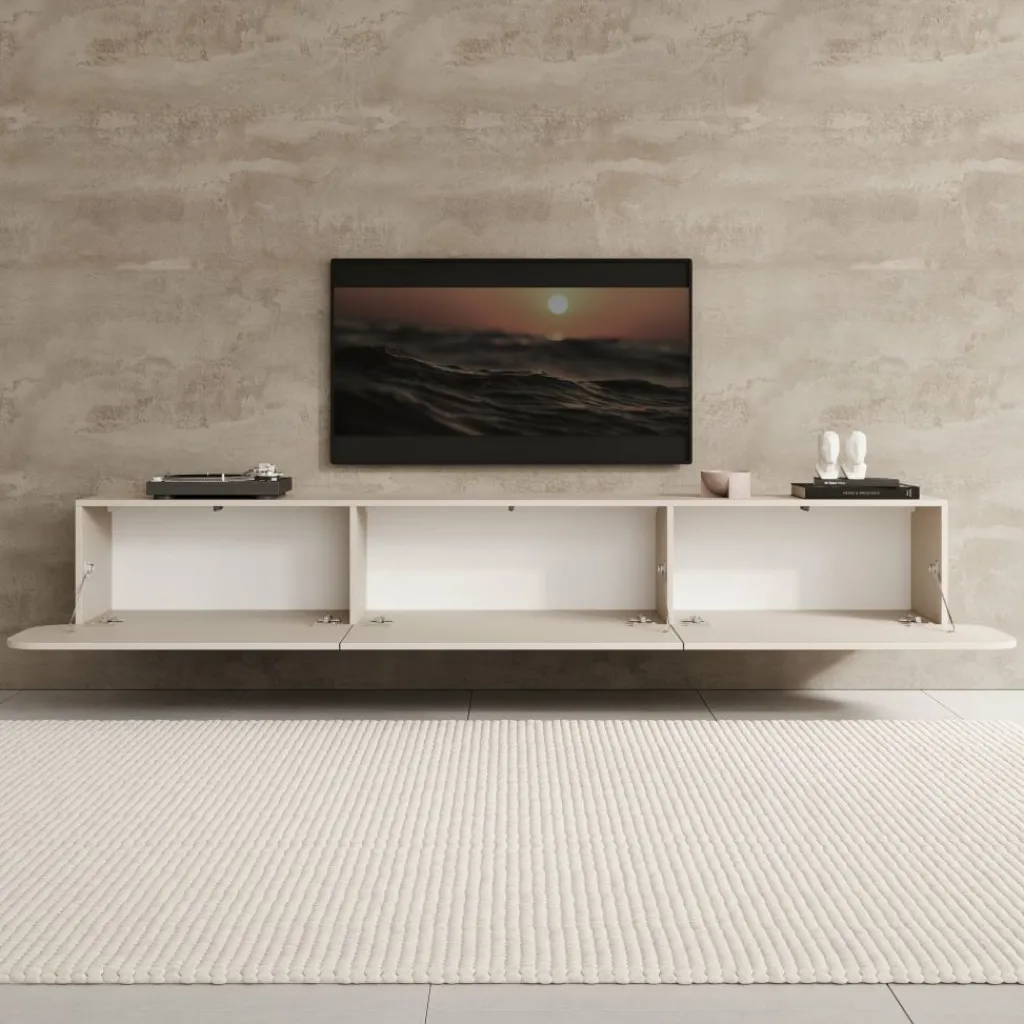 Achter de drie kleppen bevindt zich een ruime opbergruimte die is verdeeld in drie compartimenten. Hierdoor kun je mediaboxen, spelcomputers, kabels en andere accessoires overzichtelijk opbergen. De kleppen openen naar beneden en geven eenvoudig toegang tot de binnenruimte.