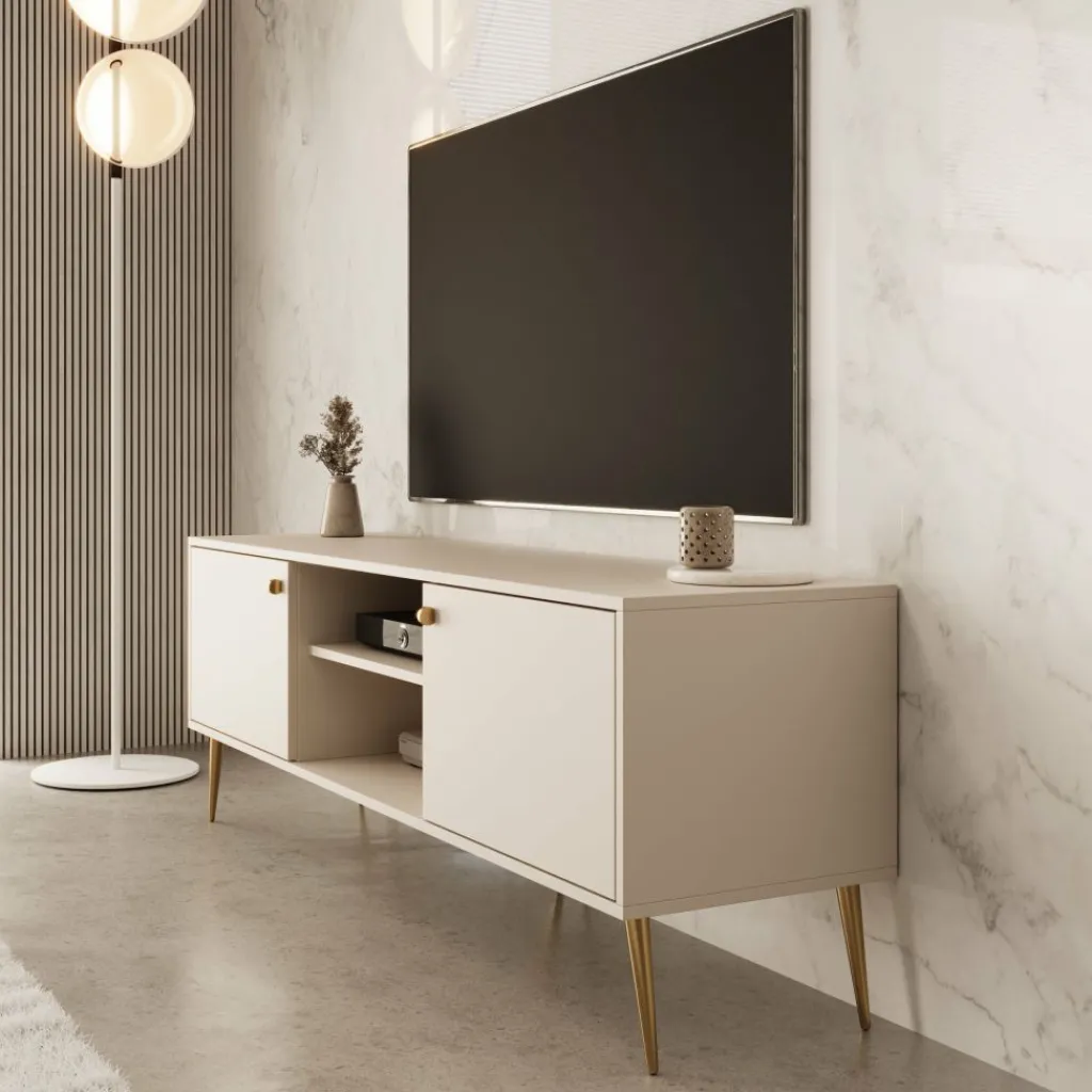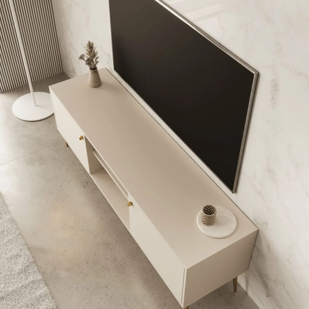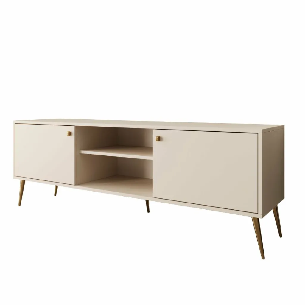 Het Reunion TV-meubel in beige combineert strak design met praktische opbergruimte. Het minimalistische ontwerp krijgt een elegante touch door de goudkleurige pootjes en knopjes, die subtiel luxe uitstralen.