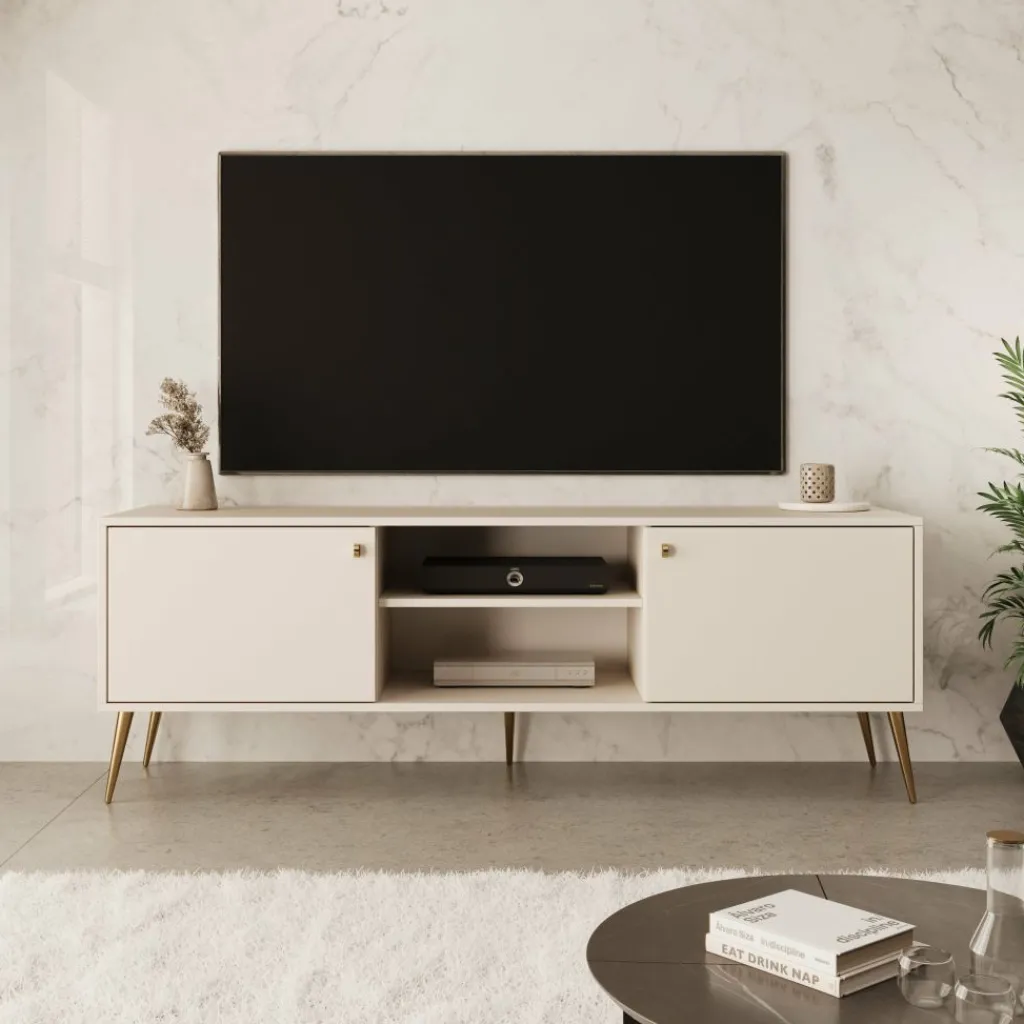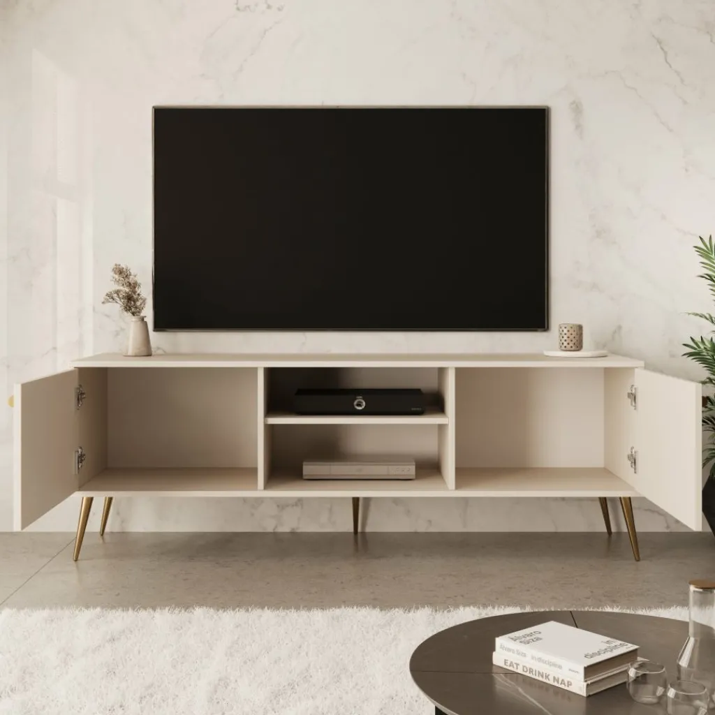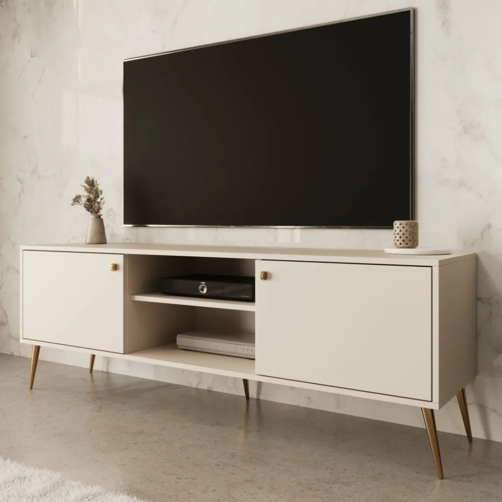 Het Reunion TV-meubel in beige combineert strak design met praktische opbergruimte. Het minimalistische ontwerp krijgt een elegante touch door de goudkleurige pootjes en knopjes, die subtiel luxe uitstralen.