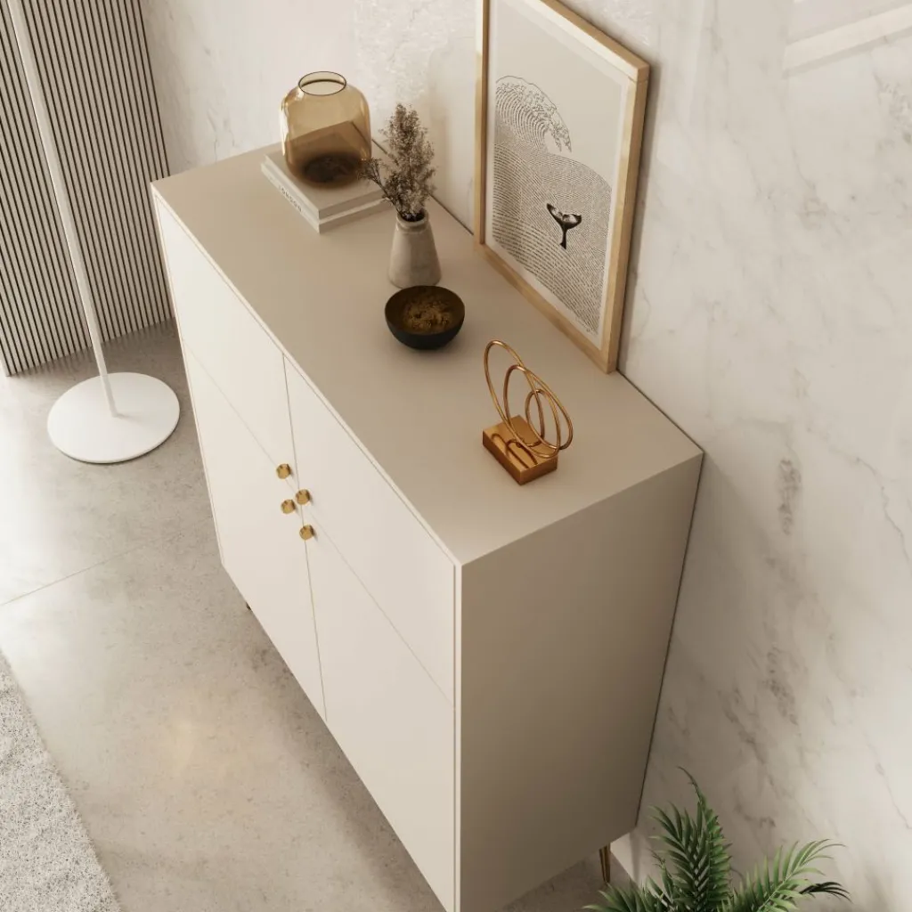 Het Reunion dressoir in beige combineert functionaliteit met een verfijnde uitstraling. Het strakke ontwerp wordt versterkt door de slanke gouden pootjes en subtiele knoppen, wat zorgt voor een chique en moderne uitstraling.