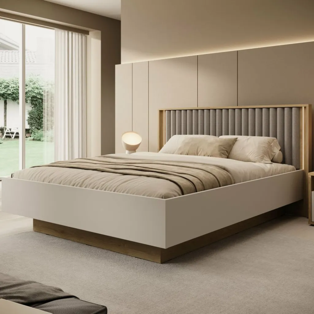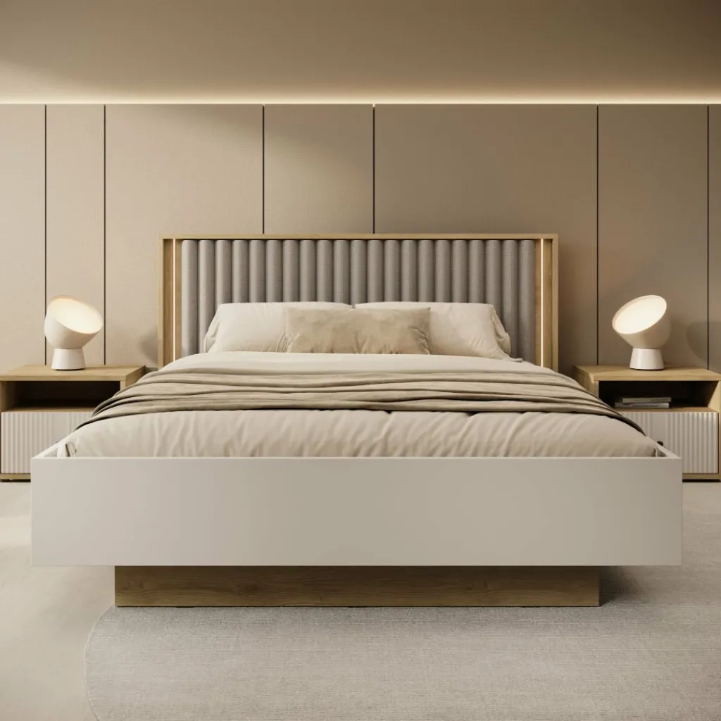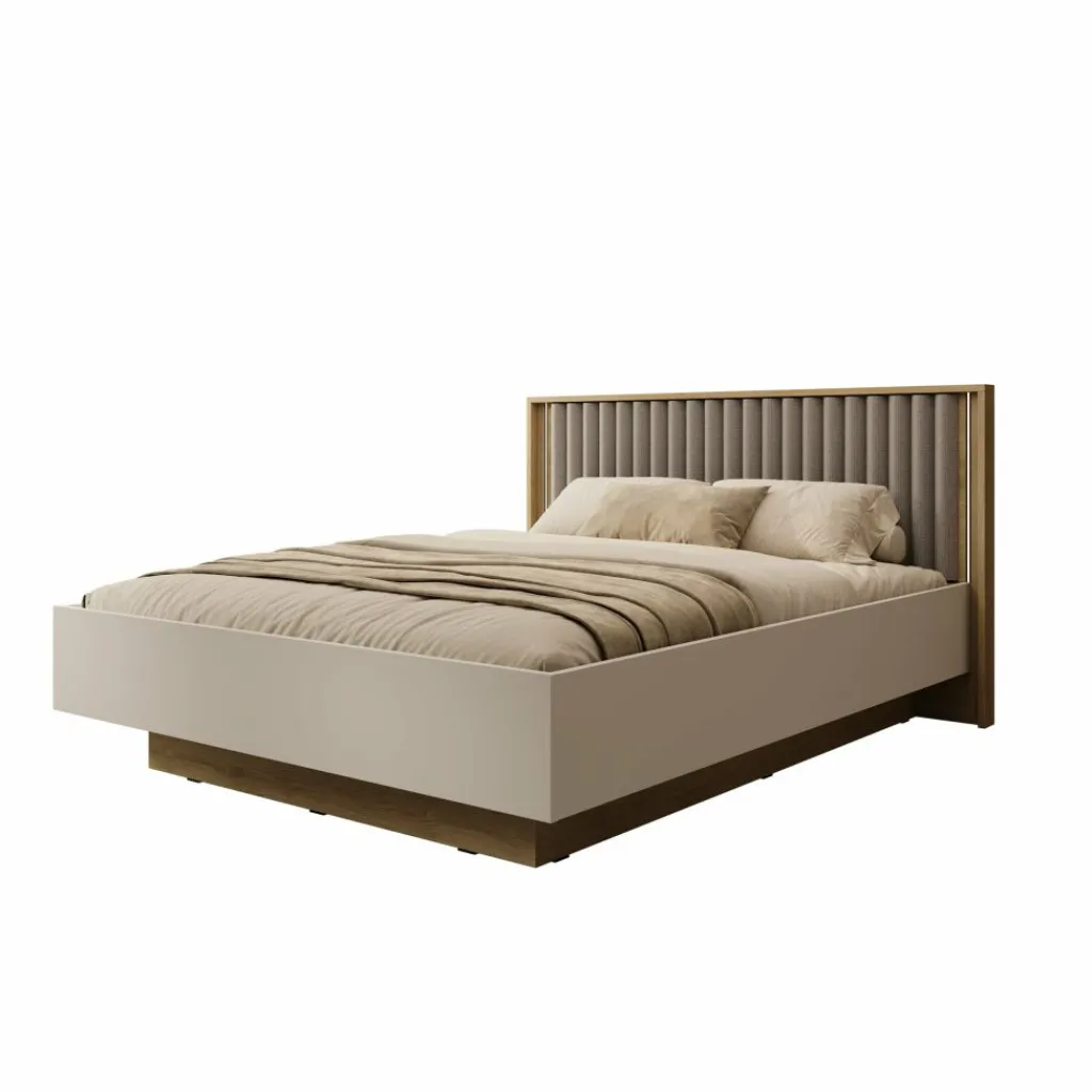 Tweepersoonsbed Riggs is een bed geschikt voor matrasmaat 160×200 cm. Het meubel is gemaakt van stevig spaanplaat in de kleur beige. Het hoofdbord is bezet met een grijze stof en beschikt over verlichting aan de zijkanten. Het bed wordt geleverd zonder matras. De lattenbodem is wel inbegrepen. Deze lattenbodem beschikt over een gasliftsysteem. Hierdoor kan je de bodem omhoog kantelen zodat er opbergruimte ontstaat. Handig voor bijvoorbeeld kussens, beddengoed of dekens.