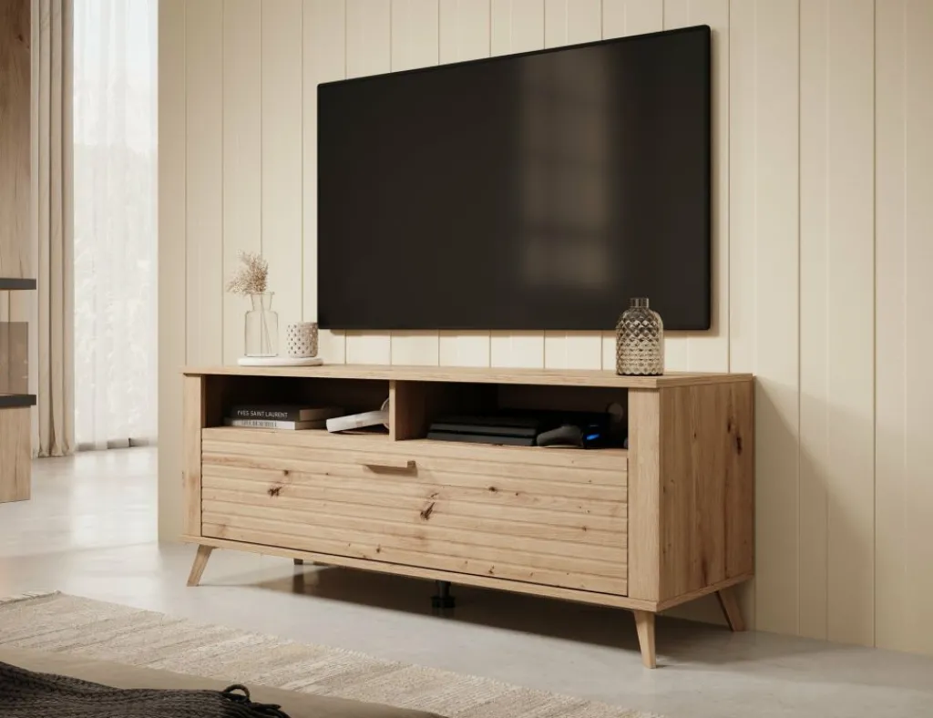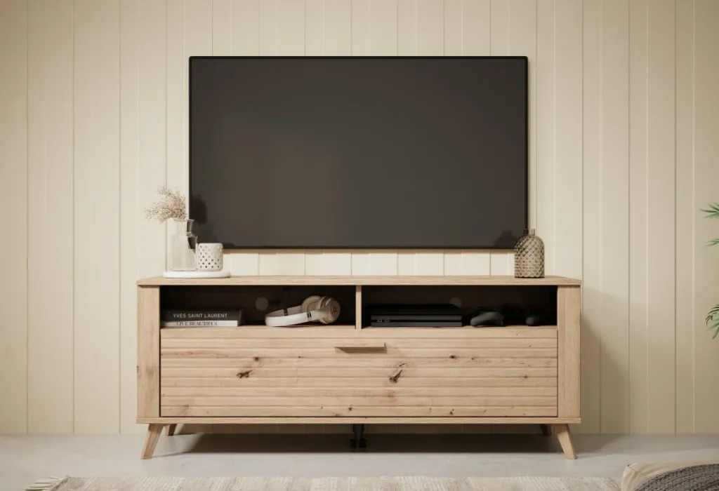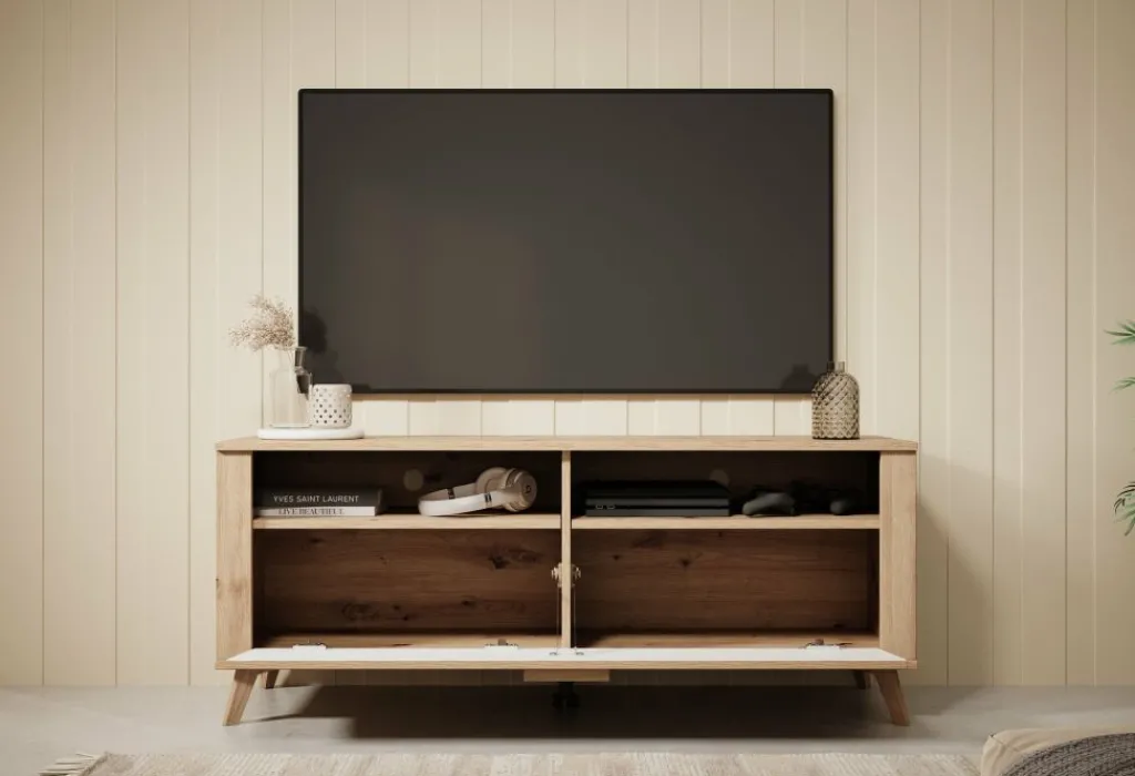 TV-Meubel Ritch is een opbergkast voor onder de tv in een moderne stijl. De TV kast beschikt over 2 open vakken en 1 klep. Deze klep is te openen met een handgreep en hierachter zitten 2 opbergvakken. In de achterwand zitten 2 uitsparingen om eventuele bedrading netjes te kunnen wegwerken. Het meubel is uitgevoerd in een eiken kleur.