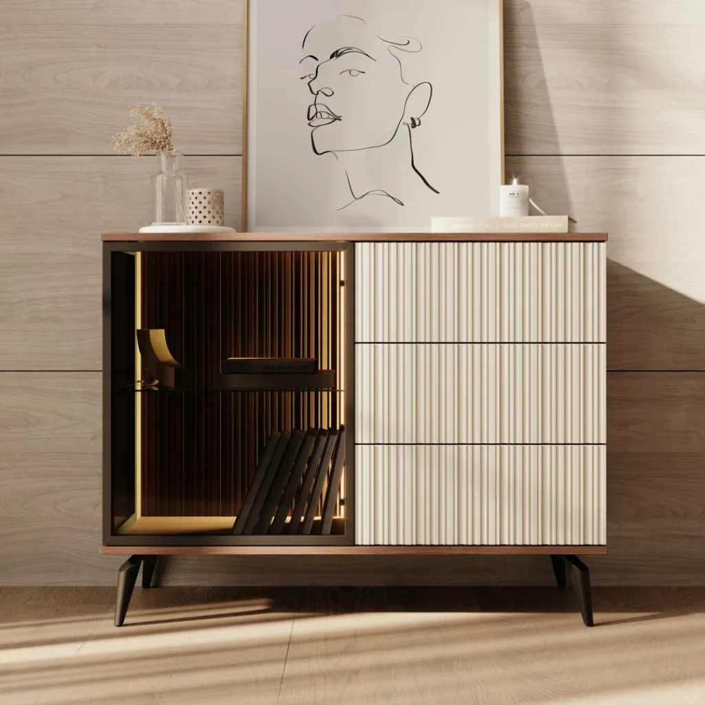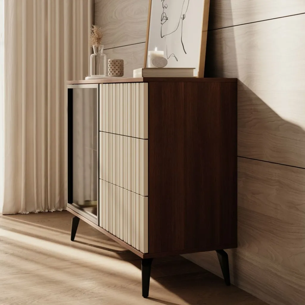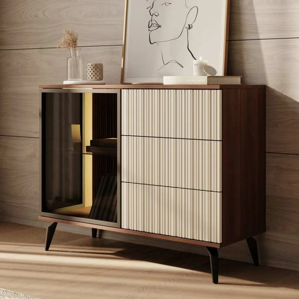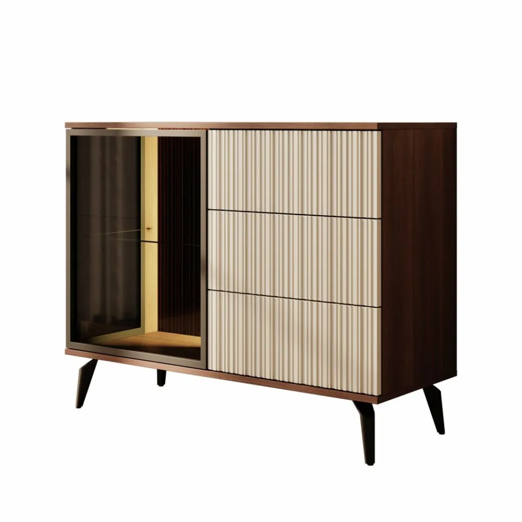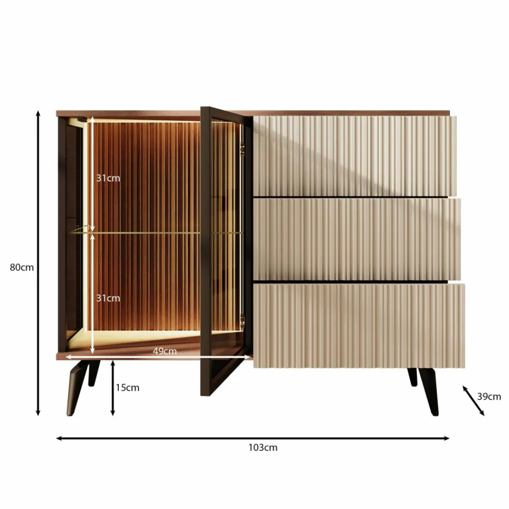 De kast is voorzien van drie lades die veel opbergruimte bieden voor bijvoorbeeld servies, boeken of andere spullen die je graag uit het zicht houdt. Aan de linkerkant vind je een glazen vitrinevak, uitgerust met geïntegreerde LED-verlichting en een glazen legplank. Dit creëert twee overzichtelijke compartimenten van elk 31 cm hoog, perfect voor het uitstallen van decoratie of boeken.
