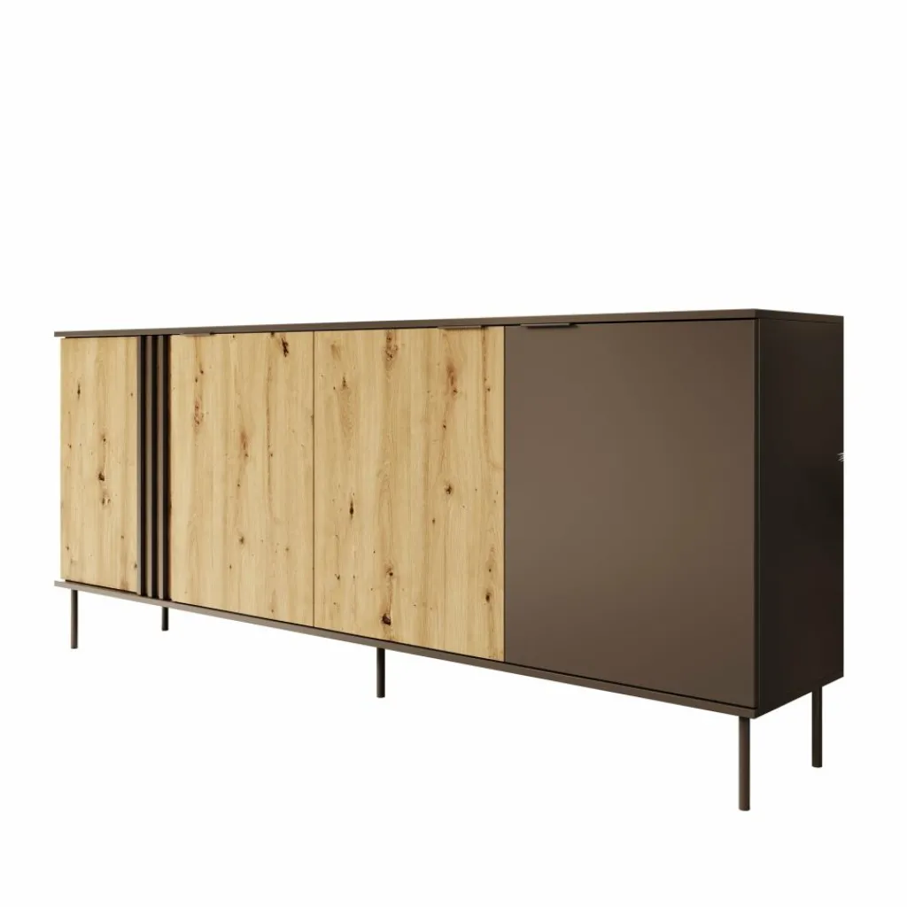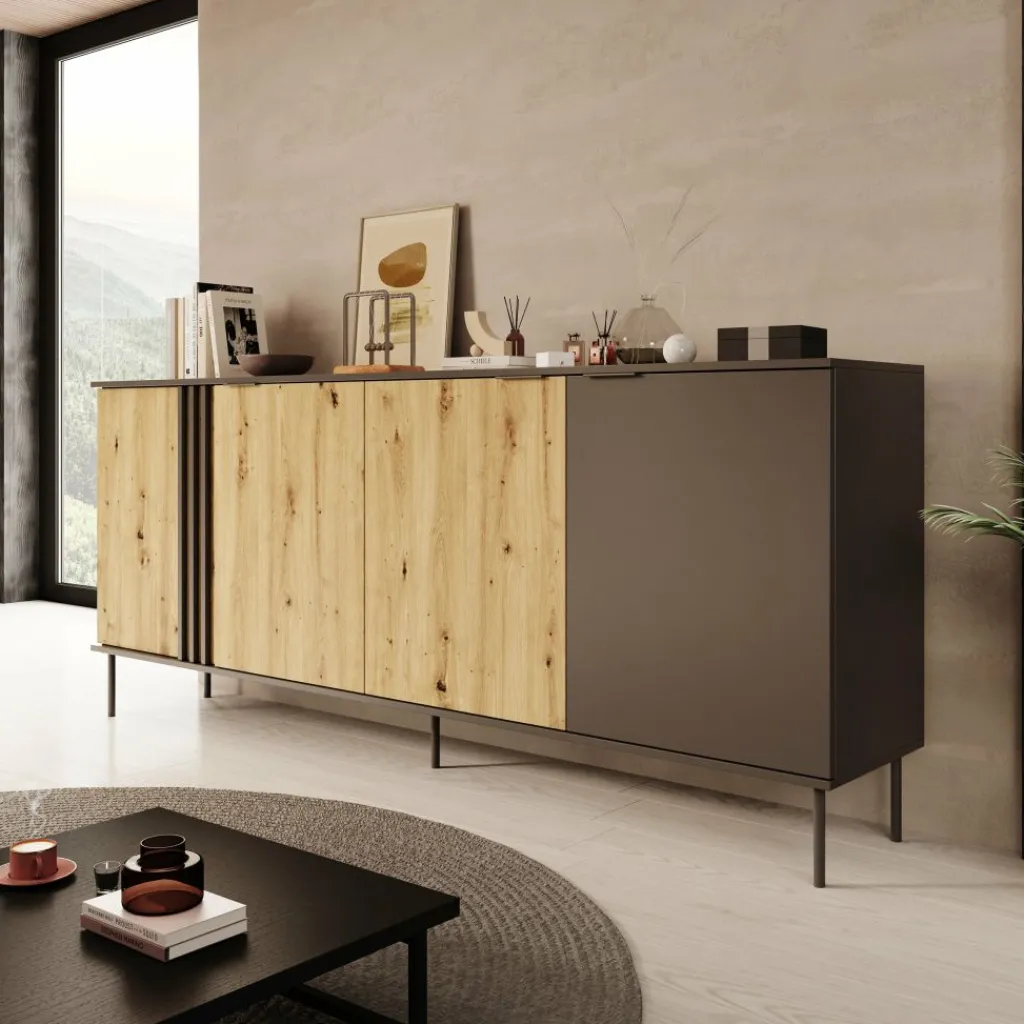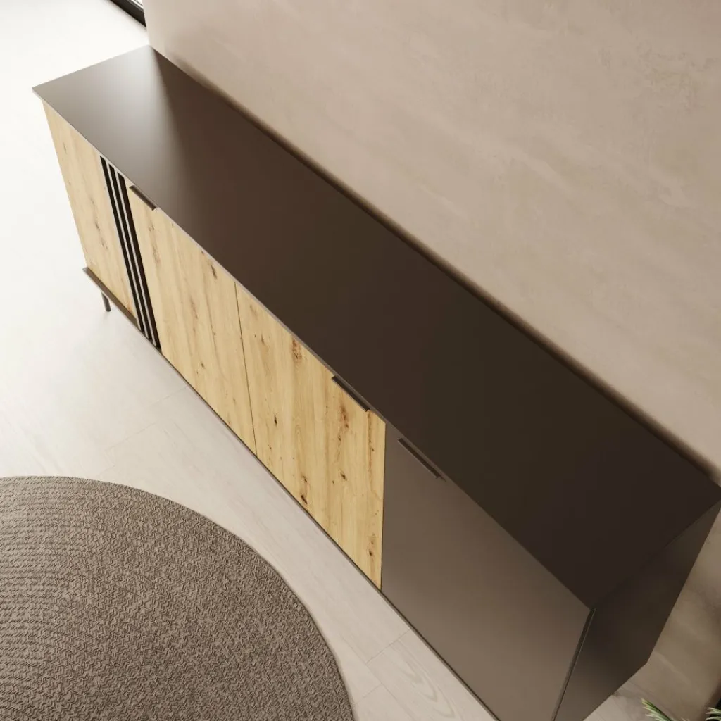 Het Rogan dressoir combineert een strak zwart design met warme houtaccenten, wat zorgt voor een stoere en eigentijdse uitstraling. Met vier ruime deuren biedt dit dressoir volop opbergruimte voor servies, linnengoed of andere spullen die je netjes uit het zicht wilt bewaren.
