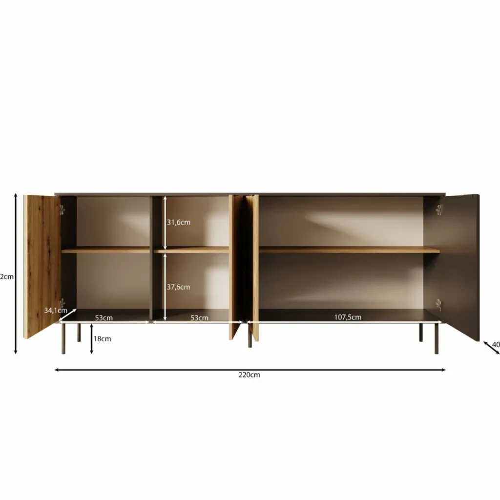 Dankzij de lengte van 220 cm is het dressoir niet alleen praktisch, maar ook een echte eyecatcher in de woonkamer of eetkamer. De slanke metalen poten geven het meubel een luchtig karakter, terwijl de combinatie van materialen aansluit bij een industrieel moderne woonstijl.