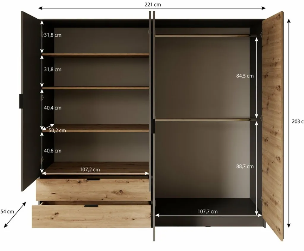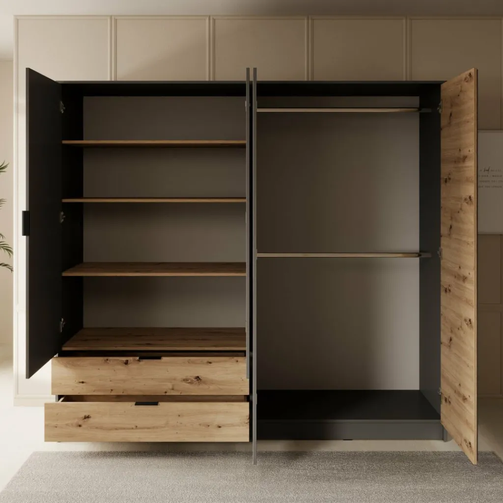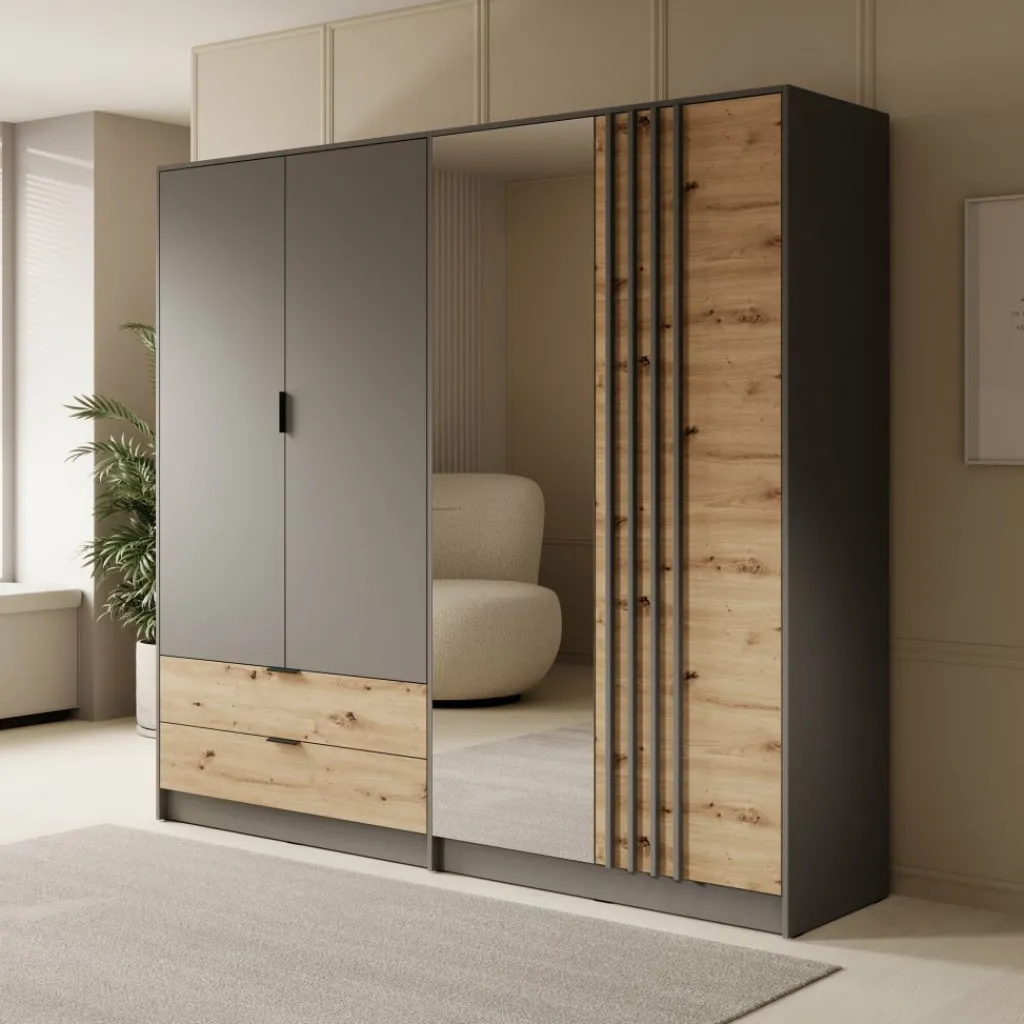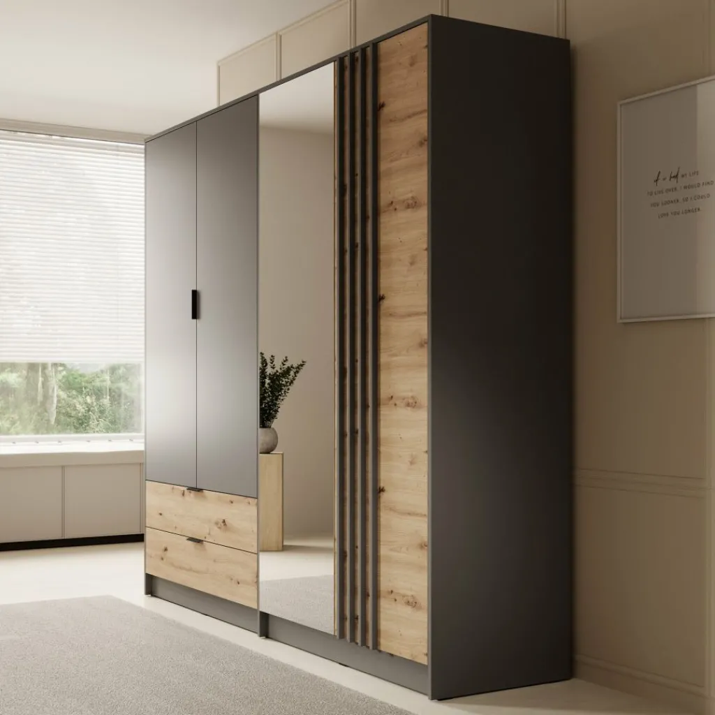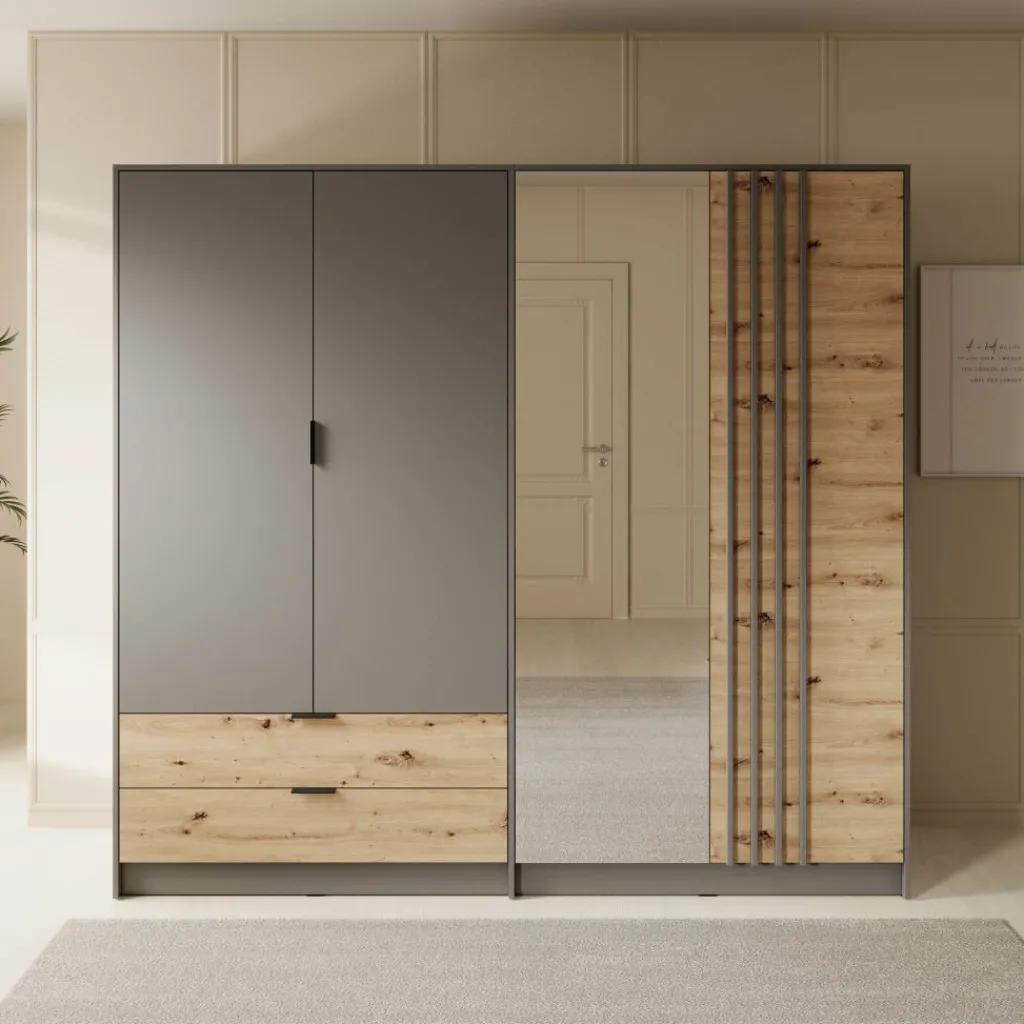 Kledingkast Roma is een praktische garderobekast voor in je slaapkamer in grijs met eiken kleur. Dit model beschikt over 4 scharnierdeuren en 2 lades. Deze deuren en lades zijn te openen met zwarte handgrepen. Ook heeft de kast een handige spiegel. De binnenkant van de Roma is voorzien van 2 kledingroedes en 4 opbergvakken, zodat je al je kleding netjes kunt opbergen en organiseren.