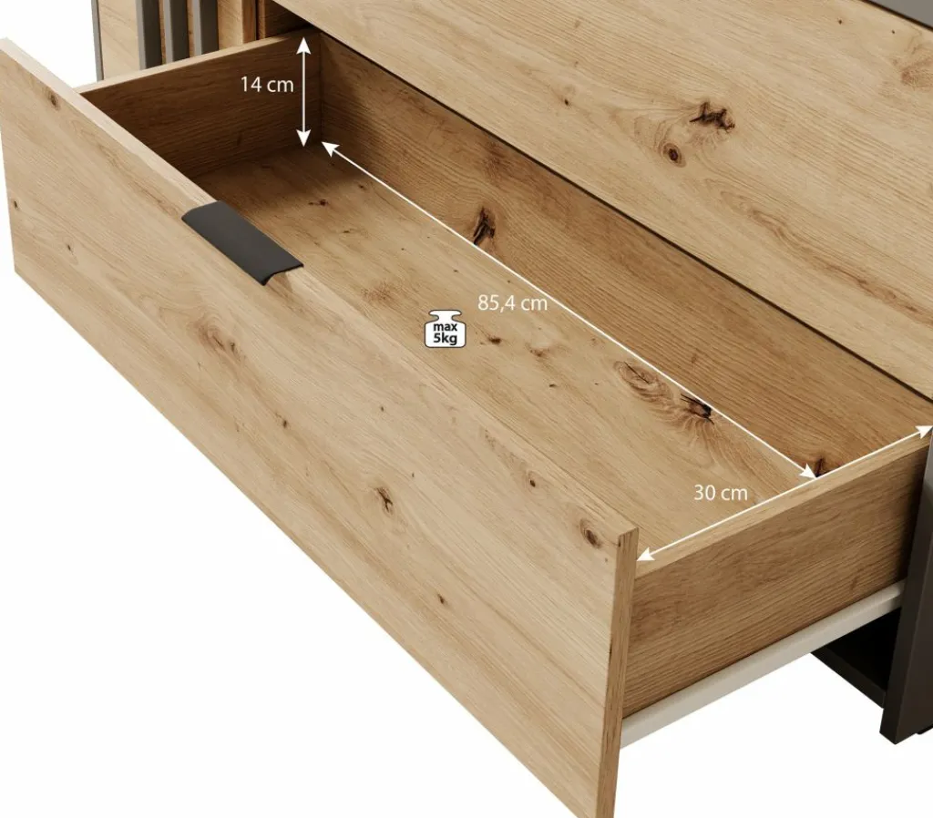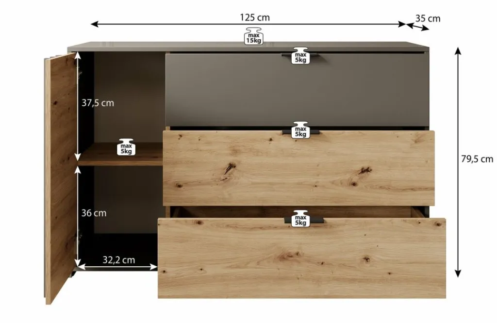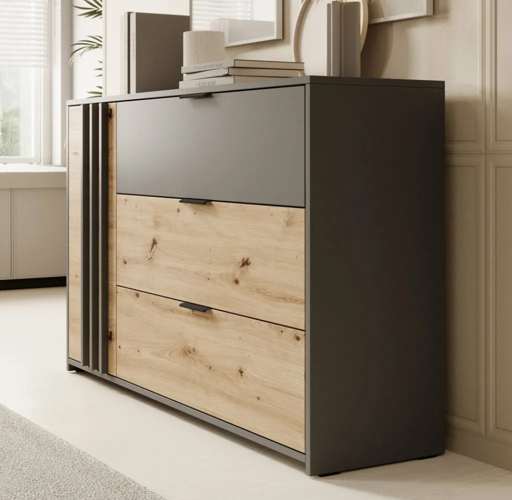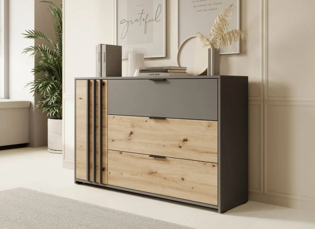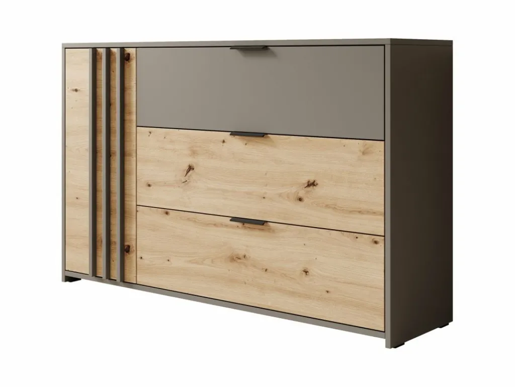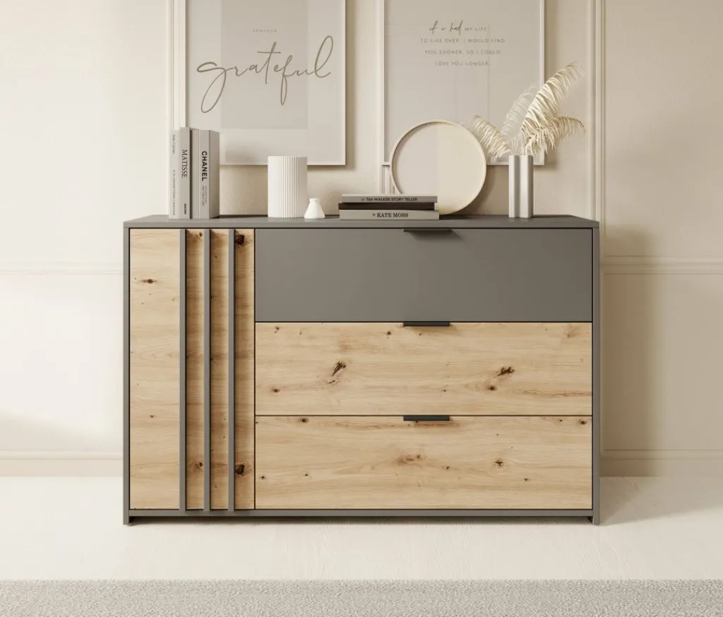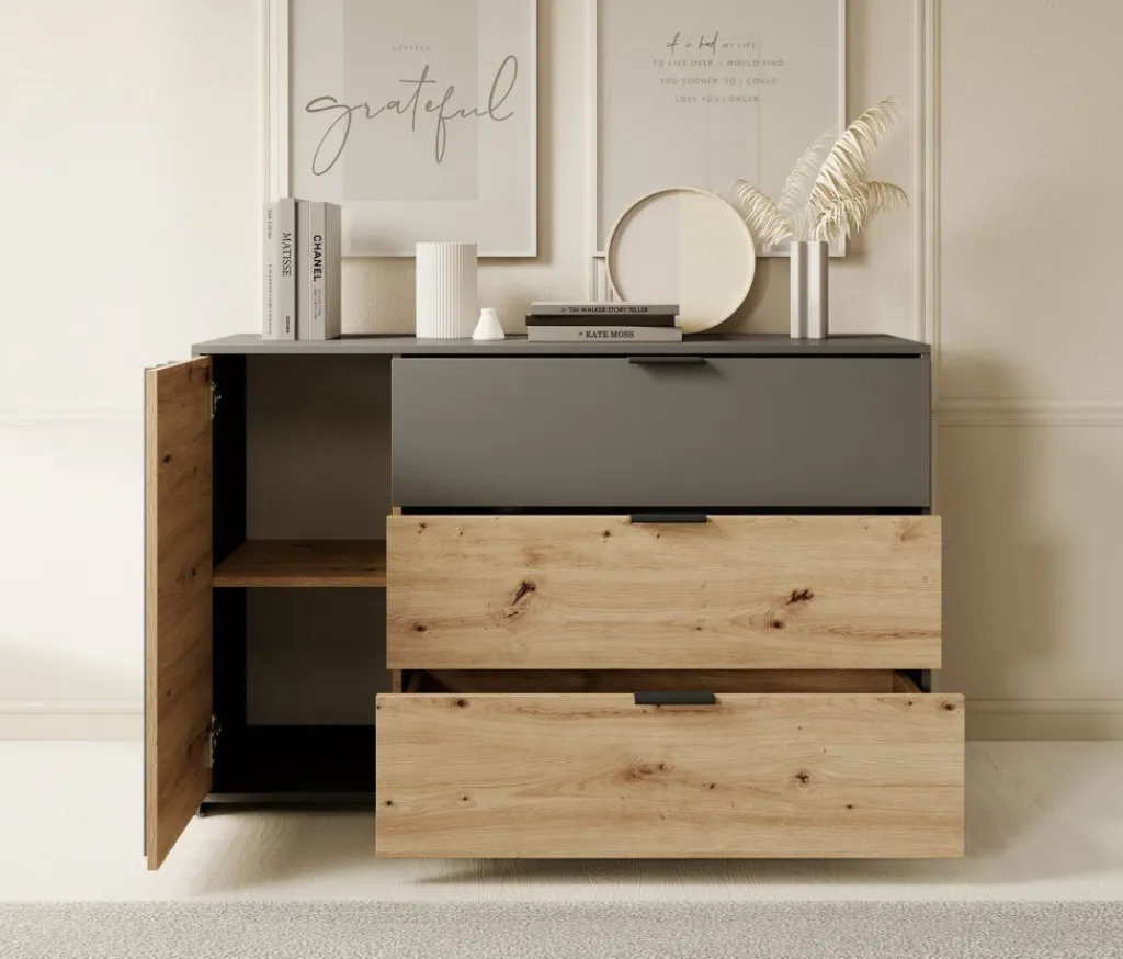 Commode Roma is een praktisch dressoir met veel opbergmogelijkheden. Zo heeft het meubel 3 lades en 1 deur. De lades zijn te openen met zwarte handgrepen en het deurtje via de grijze latjes. Achter dit deurtje zijn nog 2 opbergvakken te vinden.