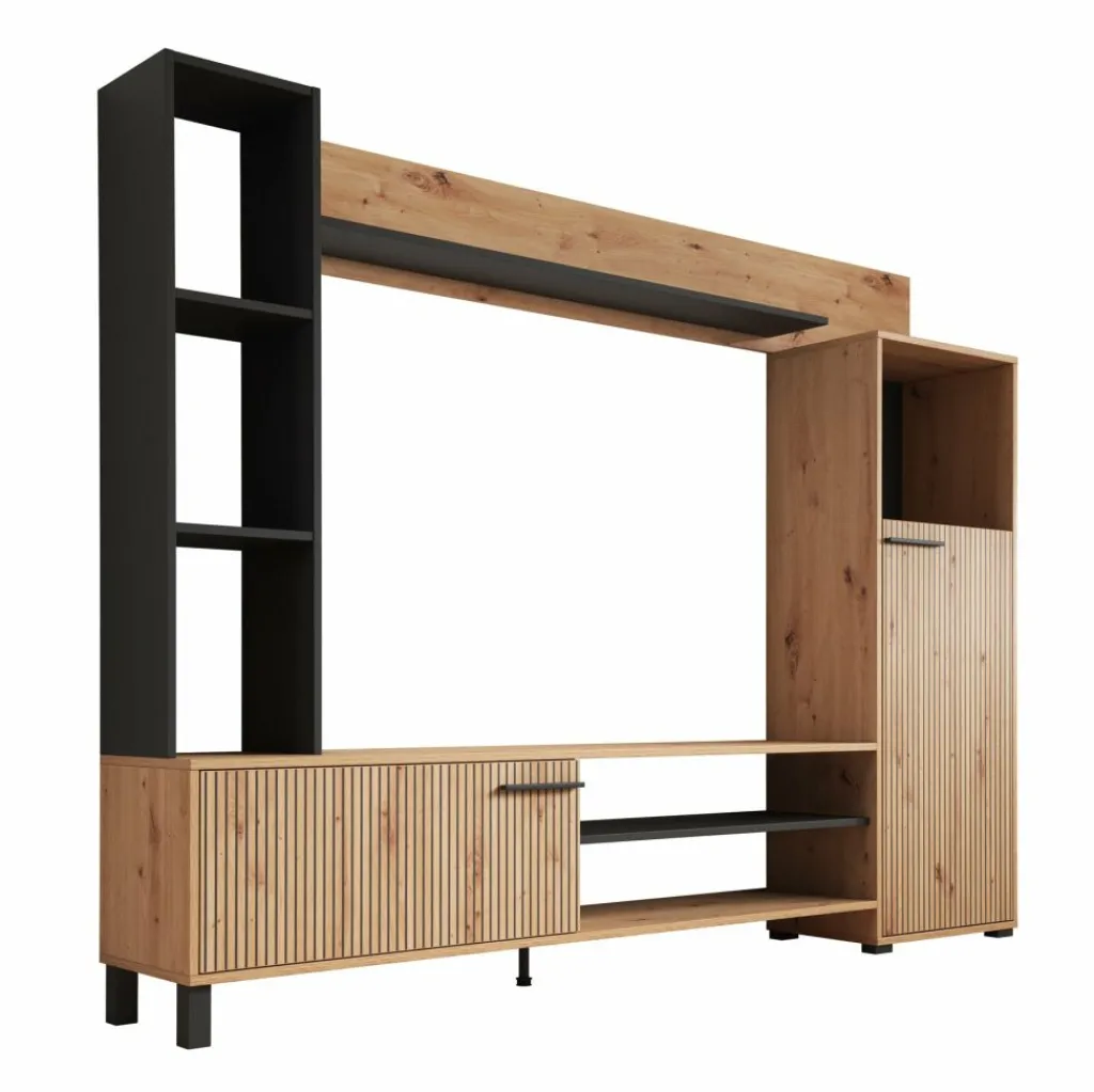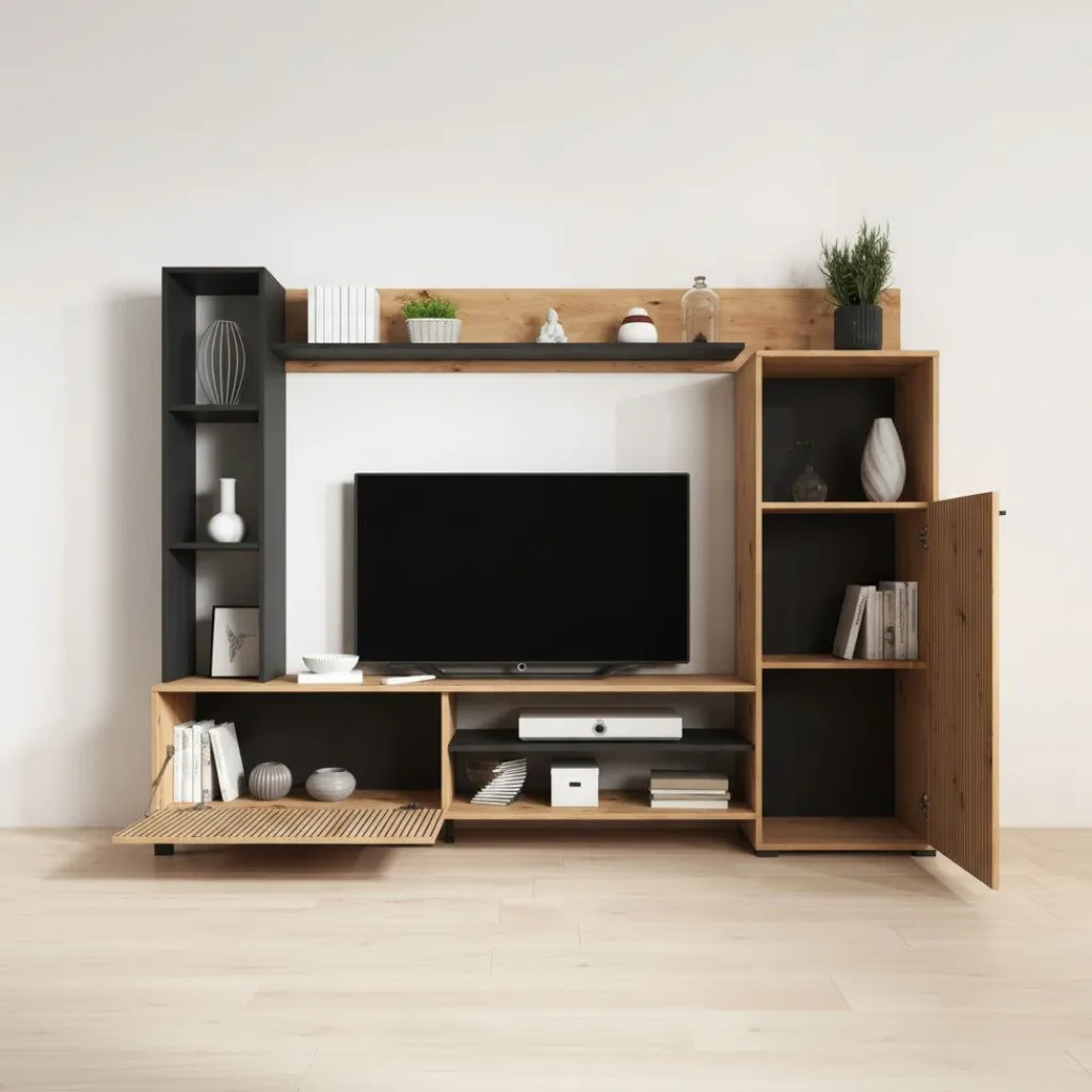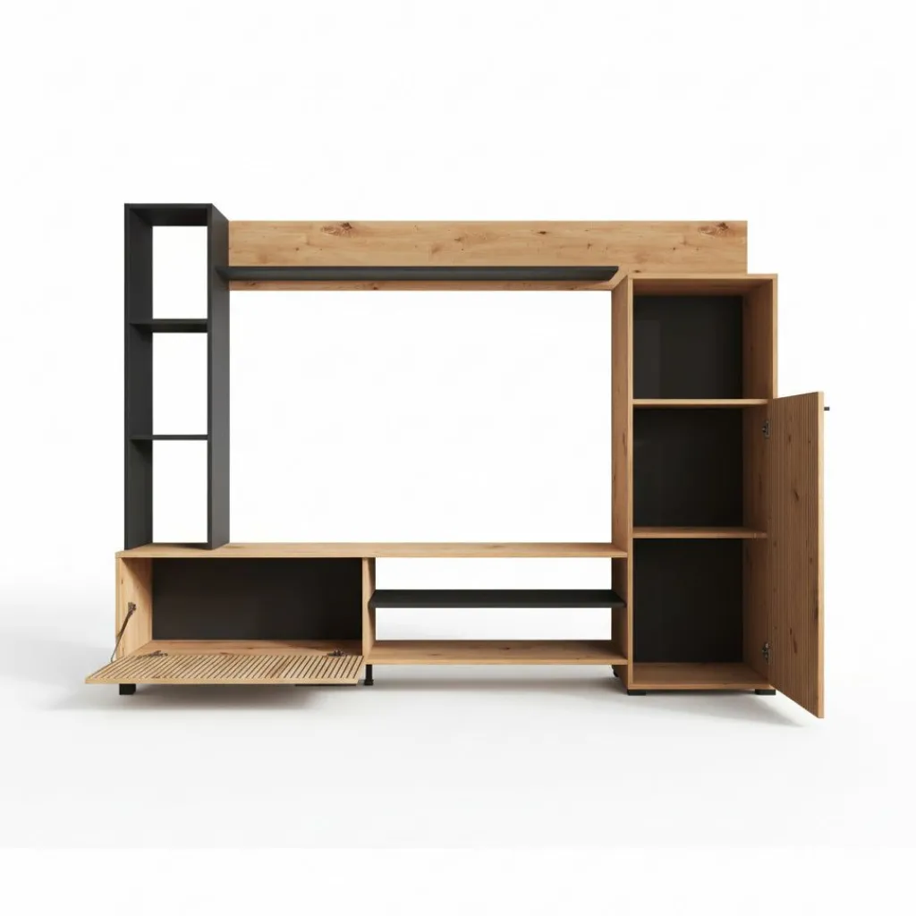 TV-Meubel: de TV-kast beschikt over 1 klep die opent met een zwarte handgreep. Hiernaast zitten nog 2 open vakken.