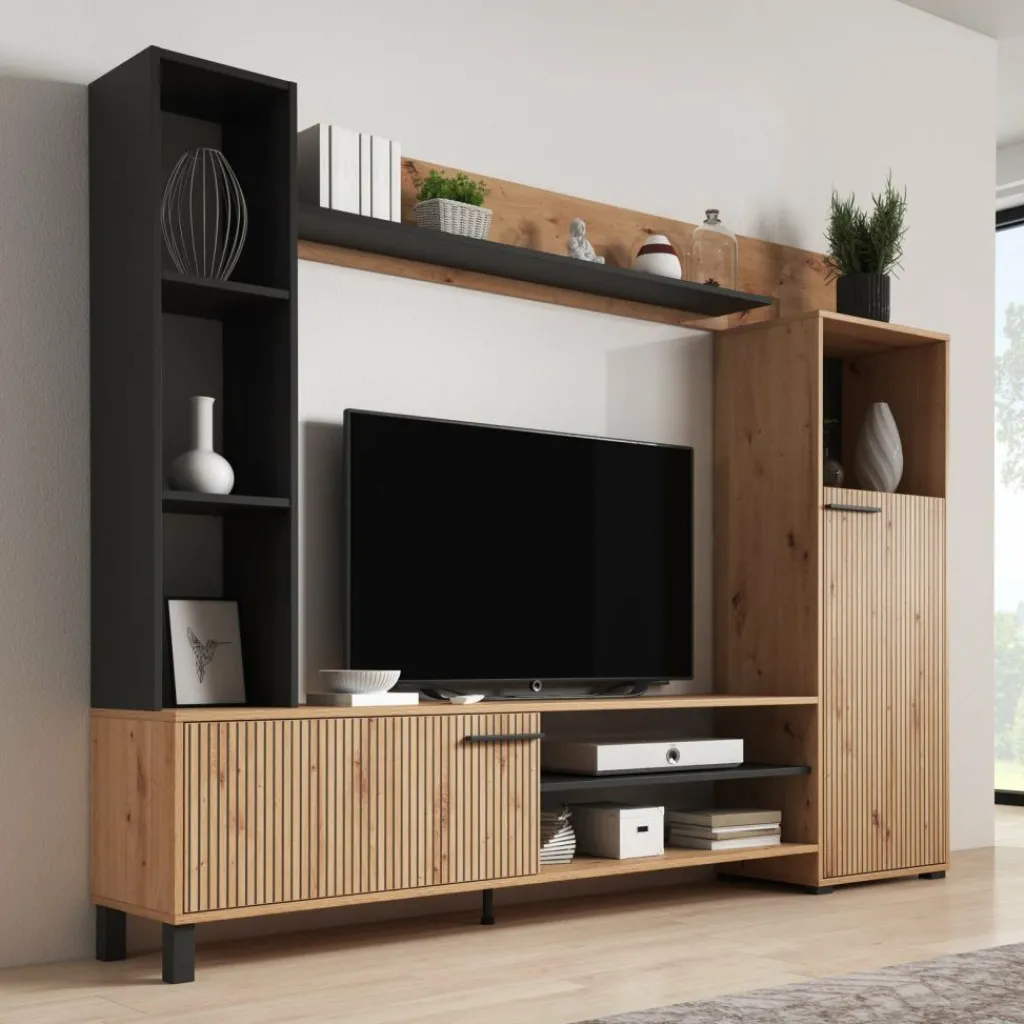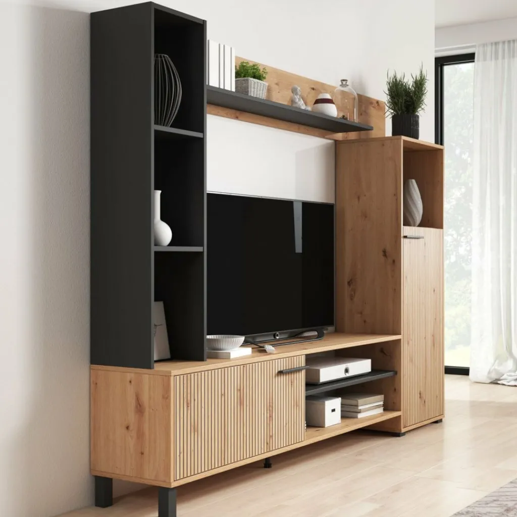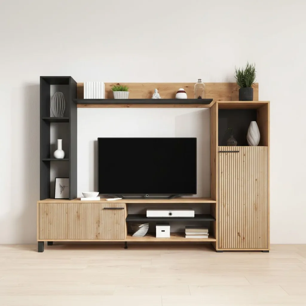 TV-Meubel: de TV-kast beschikt over 1 klep die opent met een zwarte handgreep. Hiernaast zitten nog 2 open vakken.