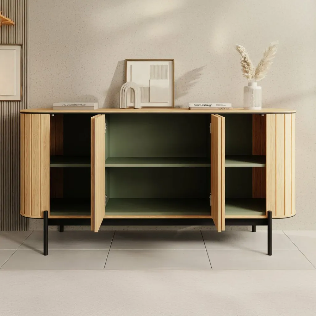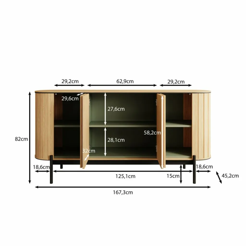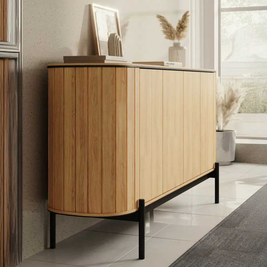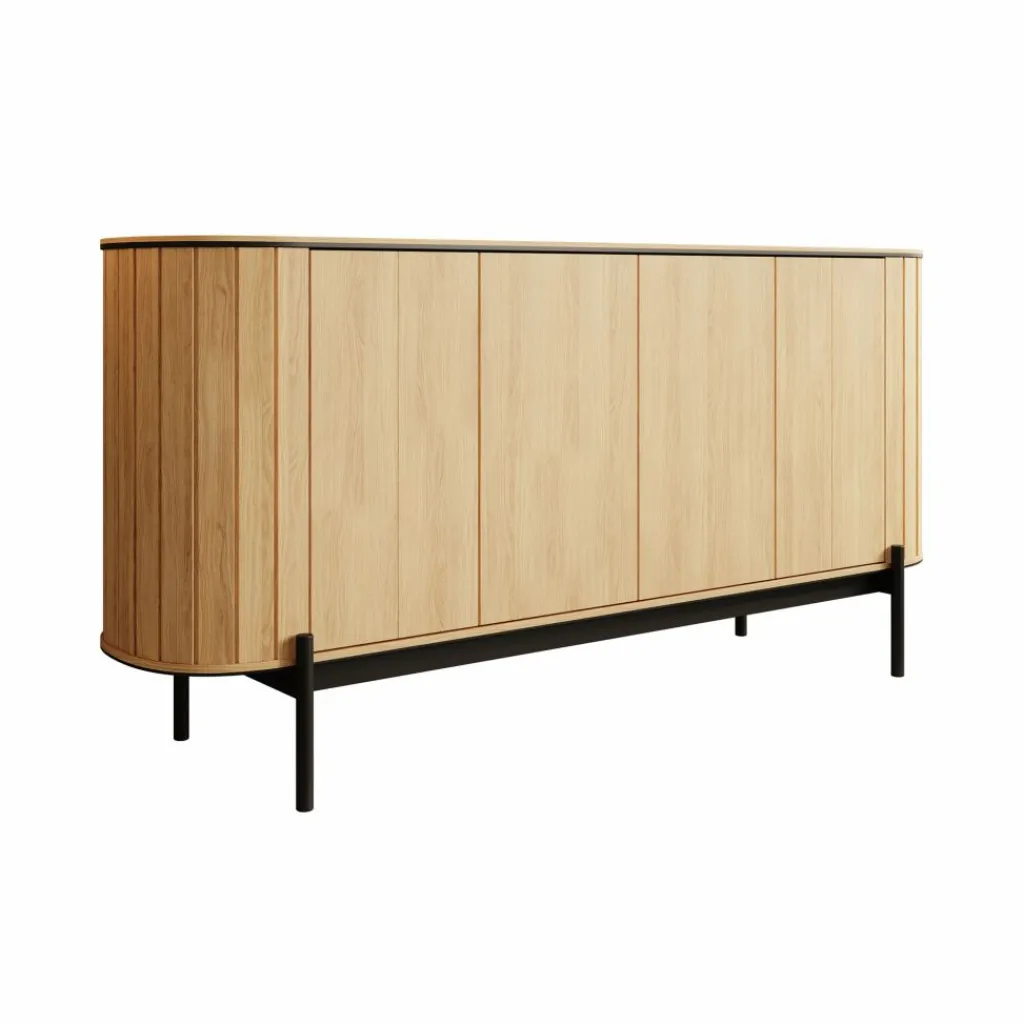 Dressoir Royale is een opbergkast in moderne stijl in een eiken kleur. Het ronde design geeft het meubel een speelse en elegante uitstraling. De kast heeft 4 deuren die openen met het push to open systeem. Hierachter zitten 6 opbergvakken. De Royale staat op een metalen onderstel in de kleur zwart.