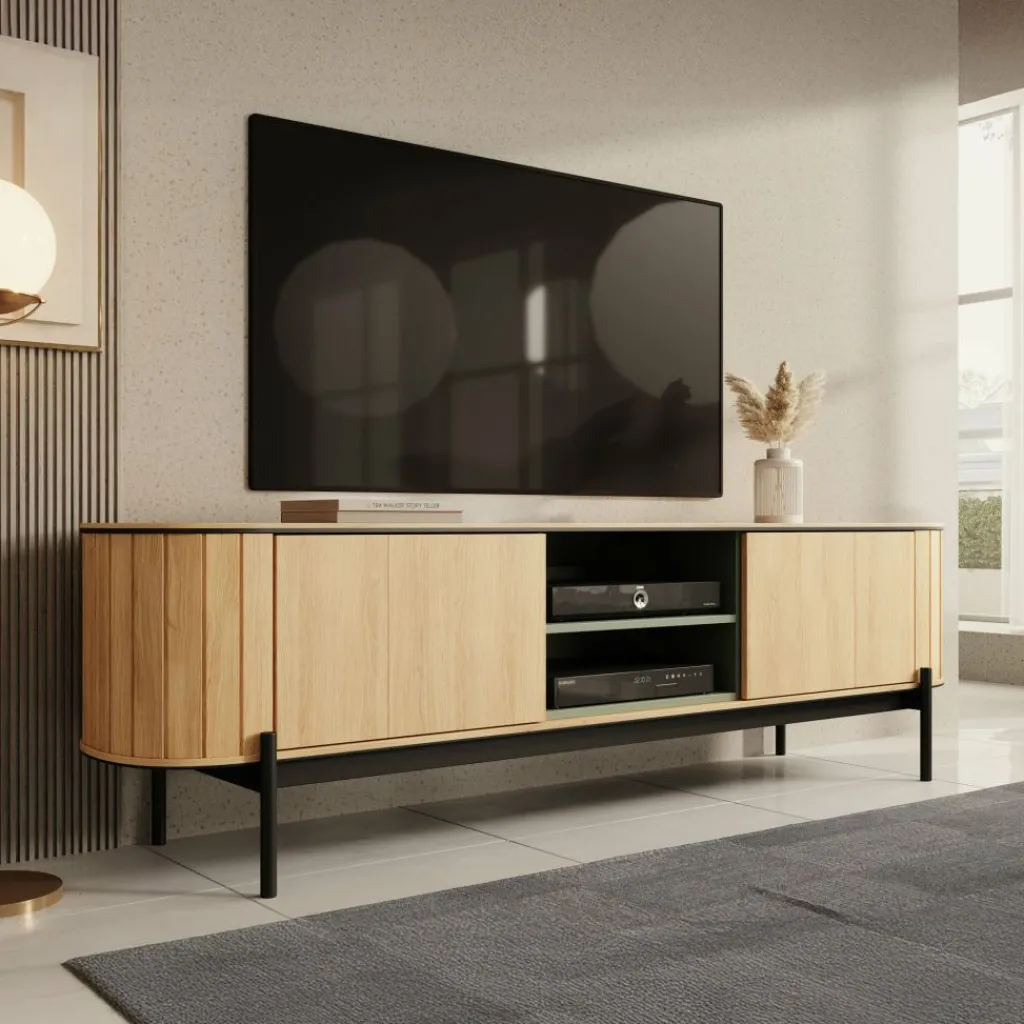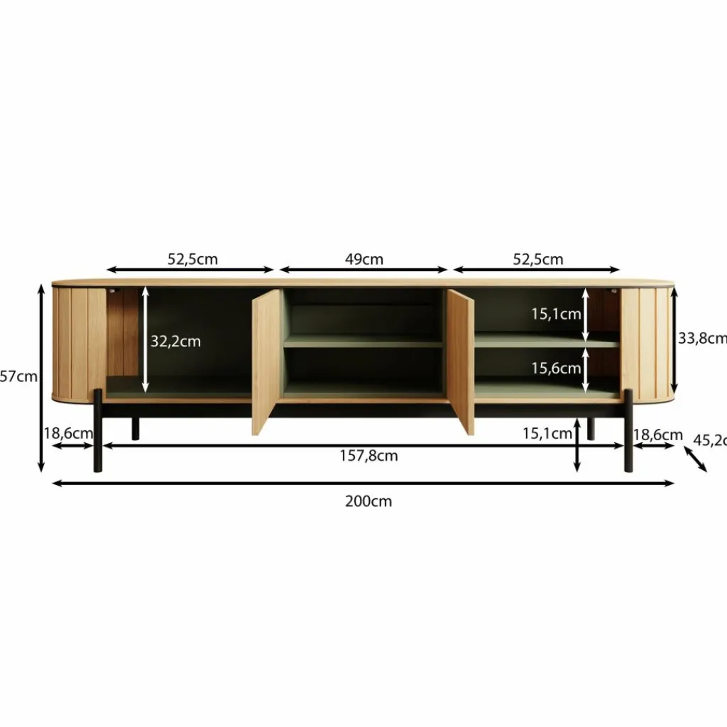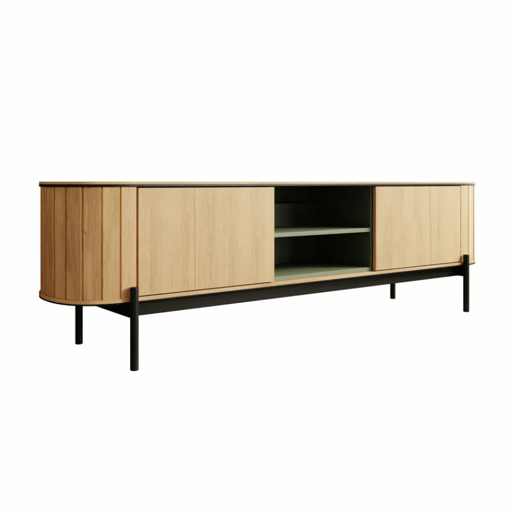 TV-Meubel Royale is een opbergkast voor onder de tv in een moderne stijl. Het ronde design geeft het meubel een speelse en elegante uitstraling. De TV-kast is gemaakt in een eiken kleur. Het onderstel is gemaakt van metaal in zwart. De Royale beschikt over 2 open vakken en 2 deuren die openen met het push to open systeem. Achter de linkerdeur zit 1 opbergvak en achter de rechterdeur zitten 2 opbergvakken.