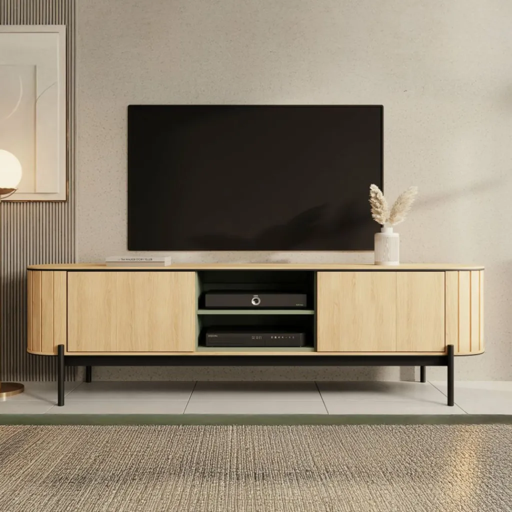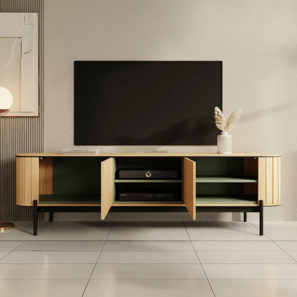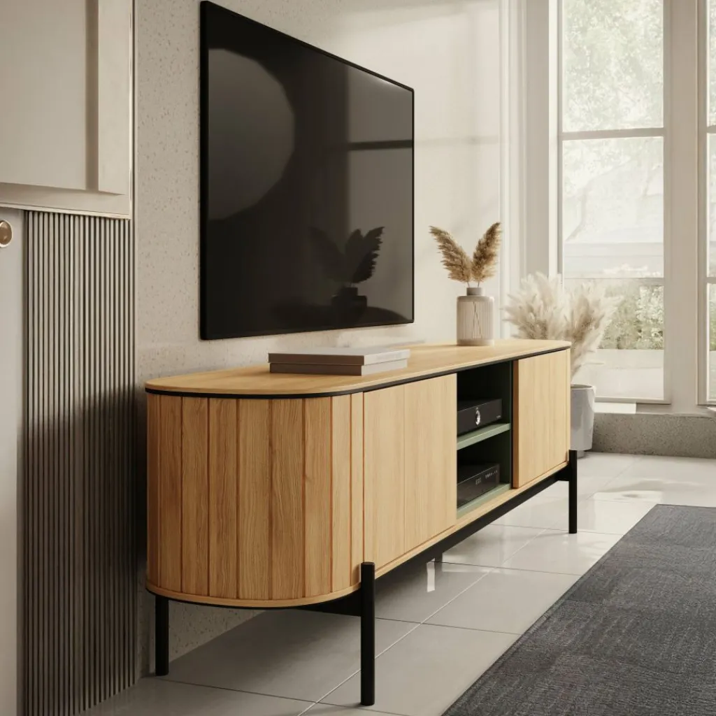 TV-Meubel Royale is een opbergkast voor onder de tv in een moderne stijl. Het ronde design geeft het meubel een speelse en elegante uitstraling. De TV-kast is gemaakt in een eiken kleur. Het onderstel is gemaakt van metaal in zwart. De Royale beschikt over 2 open vakken en 2 deuren die openen met het push to open systeem. Achter de linkerdeur zit 1 opbergvak en achter de rechterdeur zitten 2 opbergvakken.