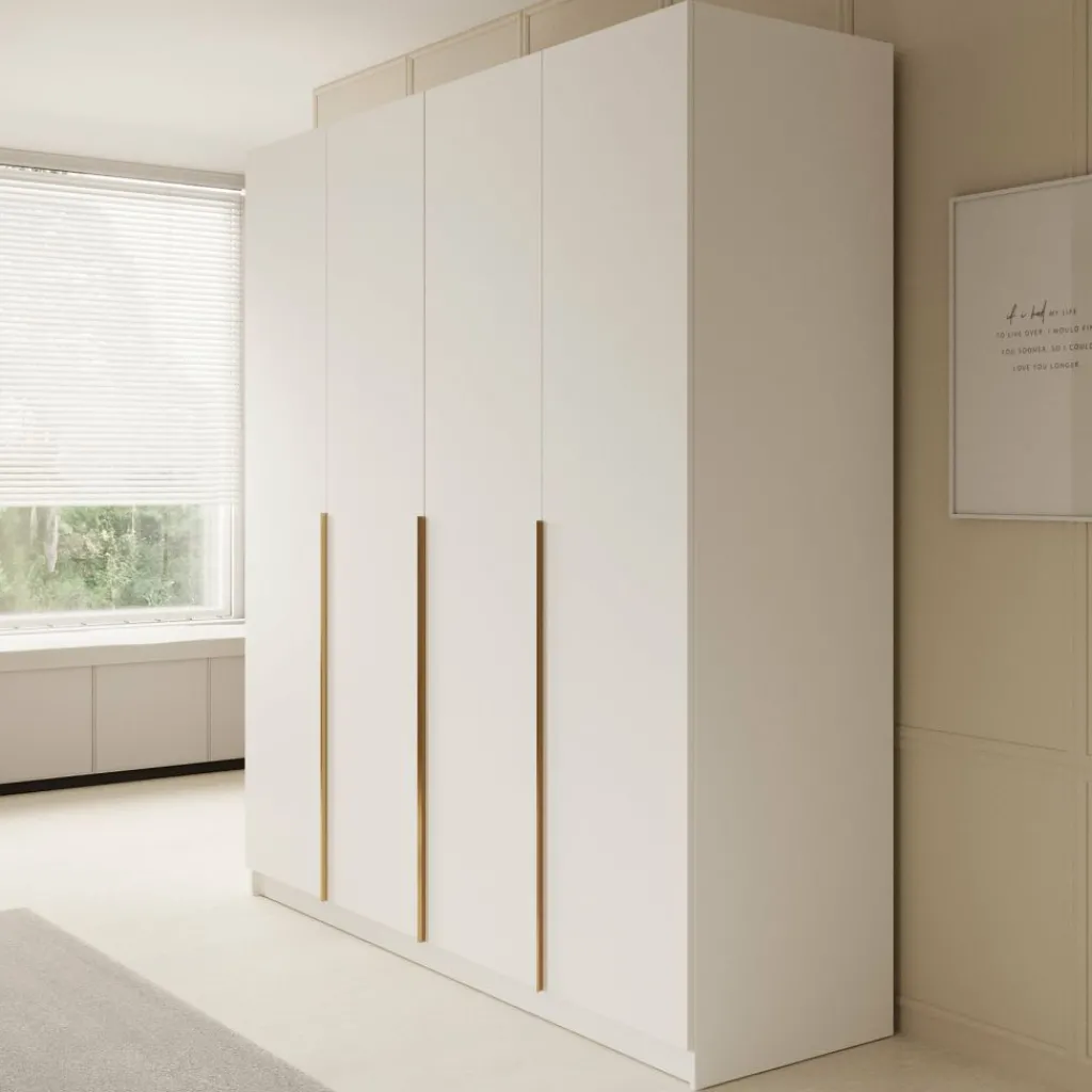 De Sabre is afgewerkt in een frisse witte kleur met opvallende, goudkleurige handgrepen die zorgen voor een hotelchique accent. Dankzij de hoogte van 215 cm benut je ook de verticale ruimte optimaal.