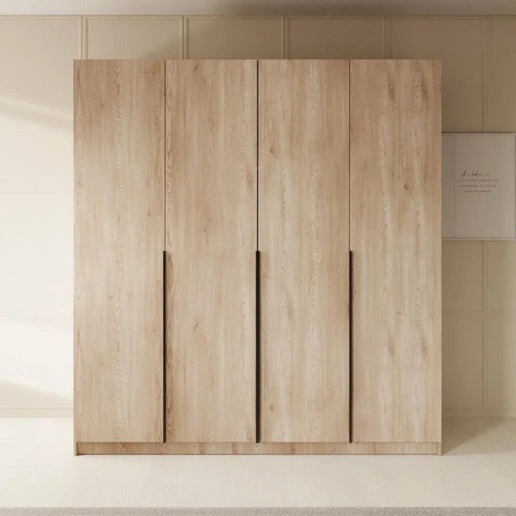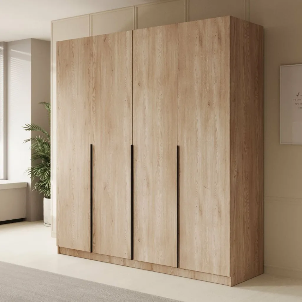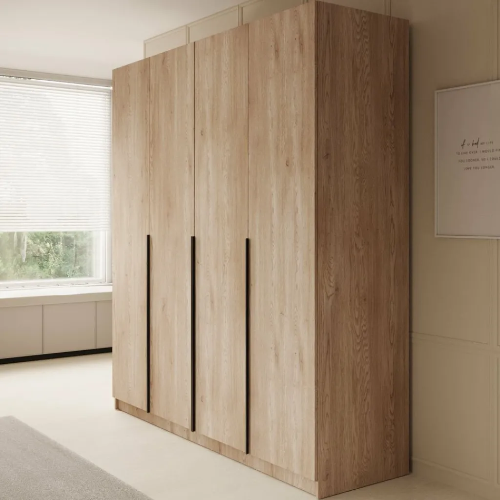 De Sabre is afgewerkt in een warme eikenhouten kleur met opvallende, matzwarte handgrepen die zorgen voor een modern accent. Dankzij de hoogte van 215 cm benut je ook de verticale ruimte optimaal.