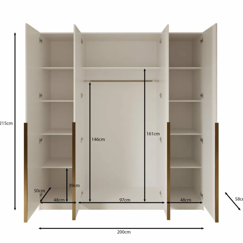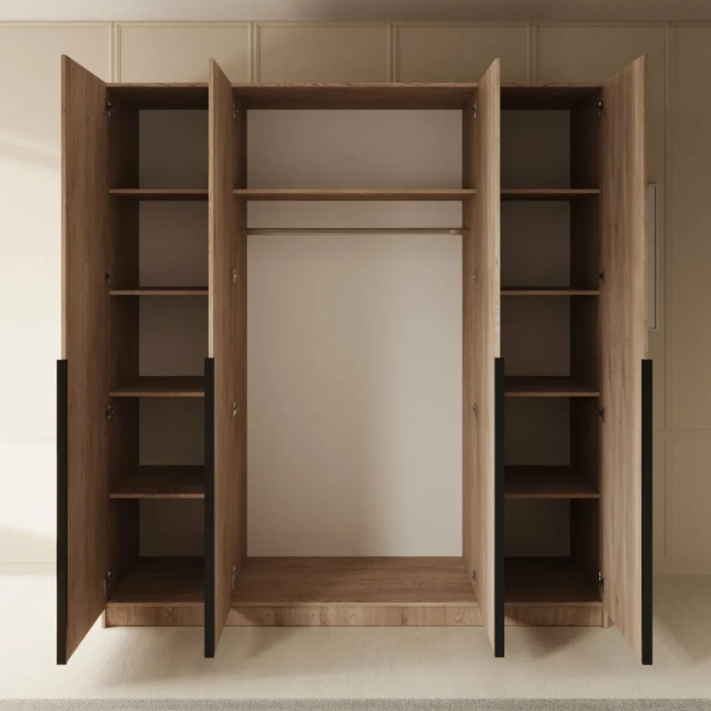 Achter de vier scharnierdeuren vind je één brede kledingroede van 97 cm voor jassen, blouses of jurken, en maar liefst elf vakken voor bijvoorbeeld truien, broeken, schoenen of beddengoed. De legplanken zijn overzichtelijk verdeeld over de drie zijvakken, wat het organiseren extra makkelijk maakt.