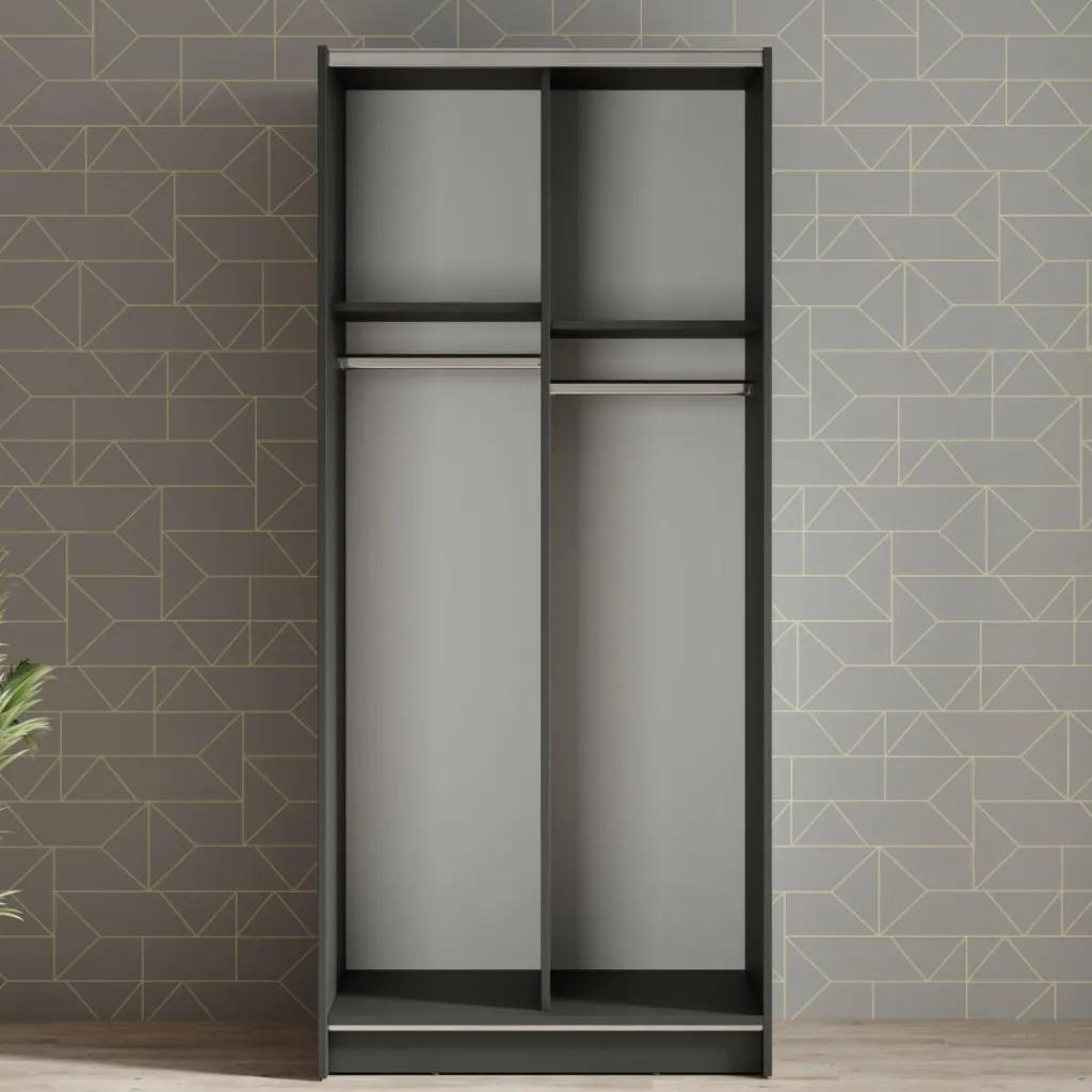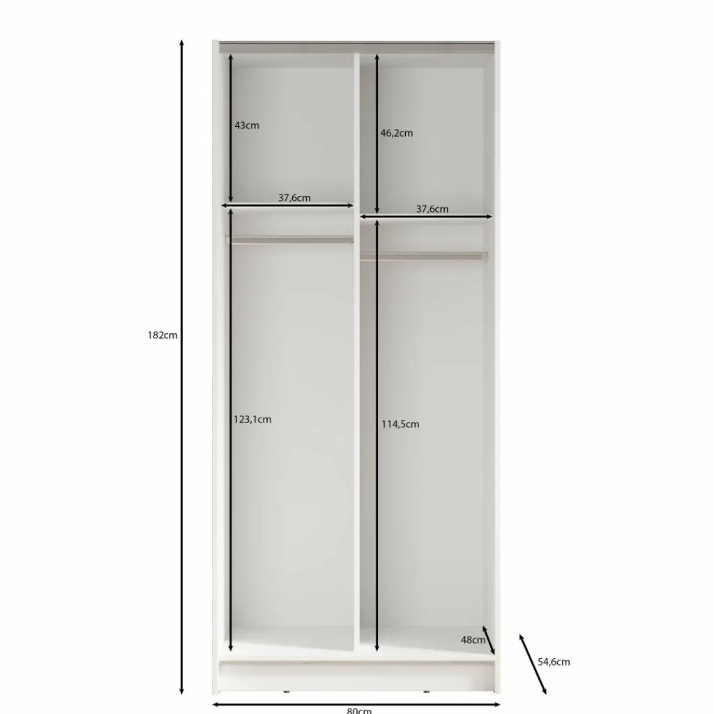 De binnenzijde is overzichtelijk ingedeeld met twee brede kledingroedes en twee legplanken bovenin. Zo biedt de Salta voldoende ruimte voor het ophangen van jassen, jurken of overhemden, maar ook voor het opbergen van gevouwen kleding of dozen.