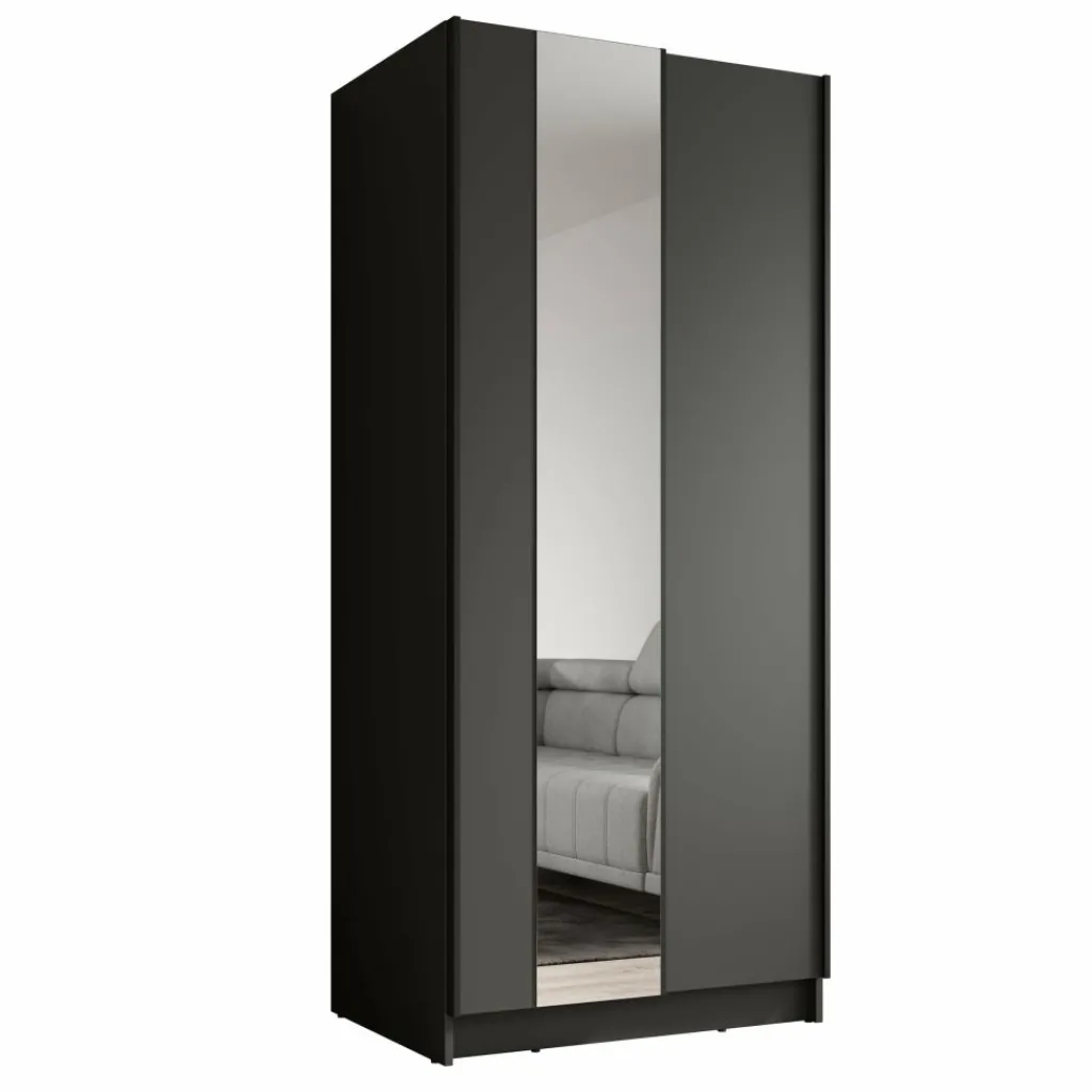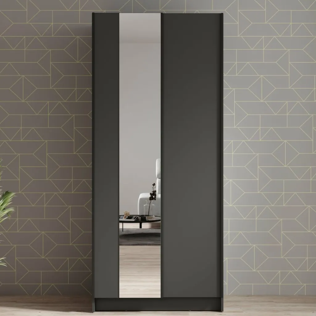 Kledingkast Salta is een moderne garderobekast met een minimalistische uitstraling en praktische indeling. De kast is uitgevoerd in het zwart en voorzien van twee schuifdeuren zonder handgrepen, wat zorgt voor een strakke en eigentijdse look. Eén van de deuren is afgewerkt met een grote spiegel: ideaal om outfits te checken en tegelijkertijd de ruimte optisch te vergroten.