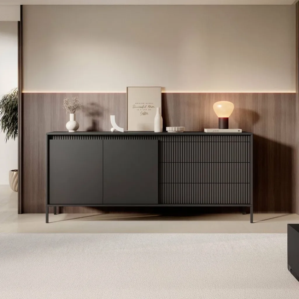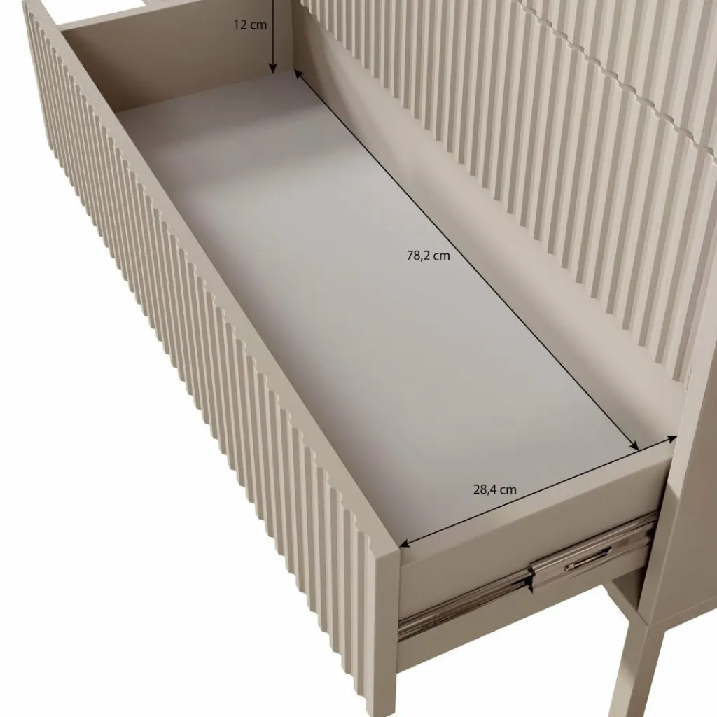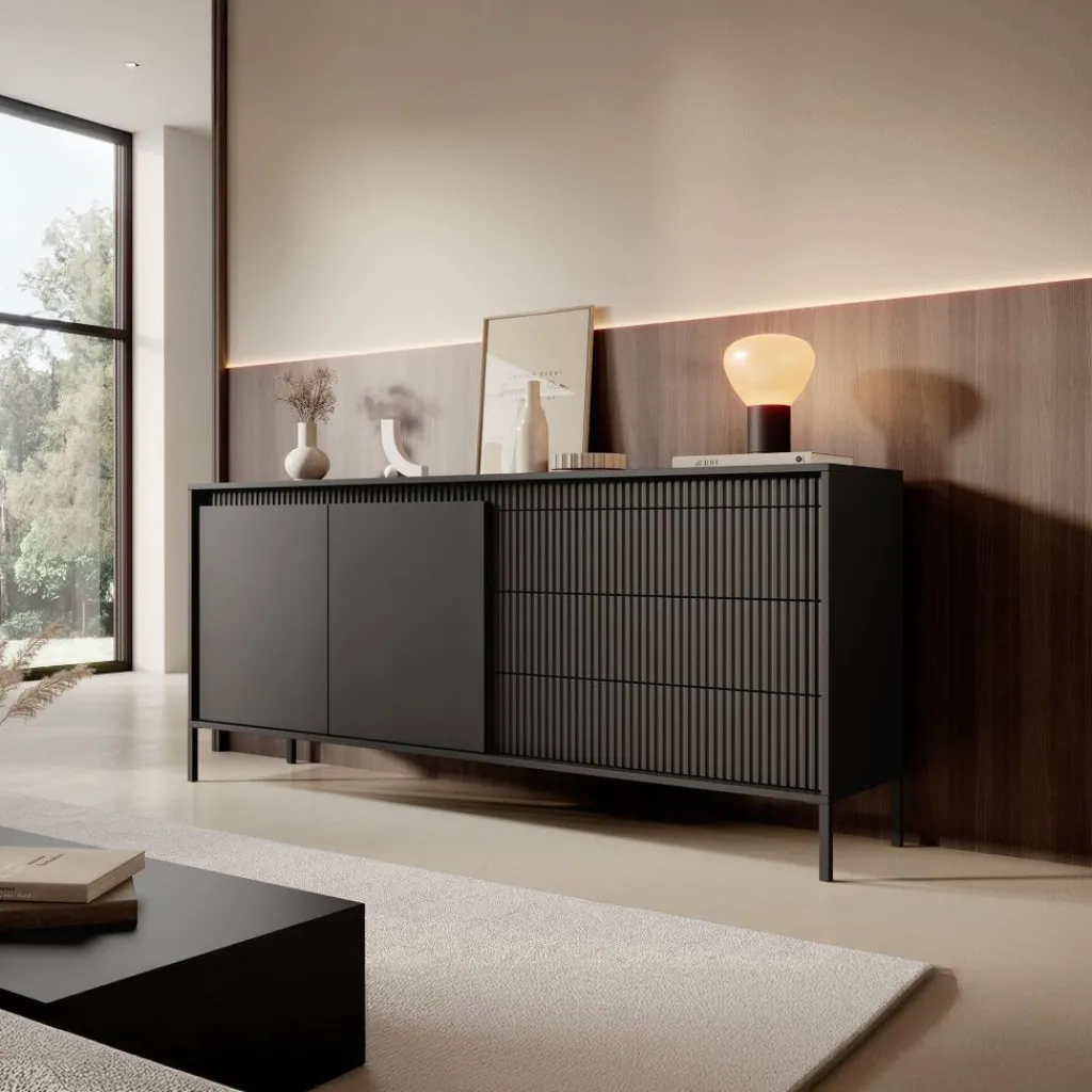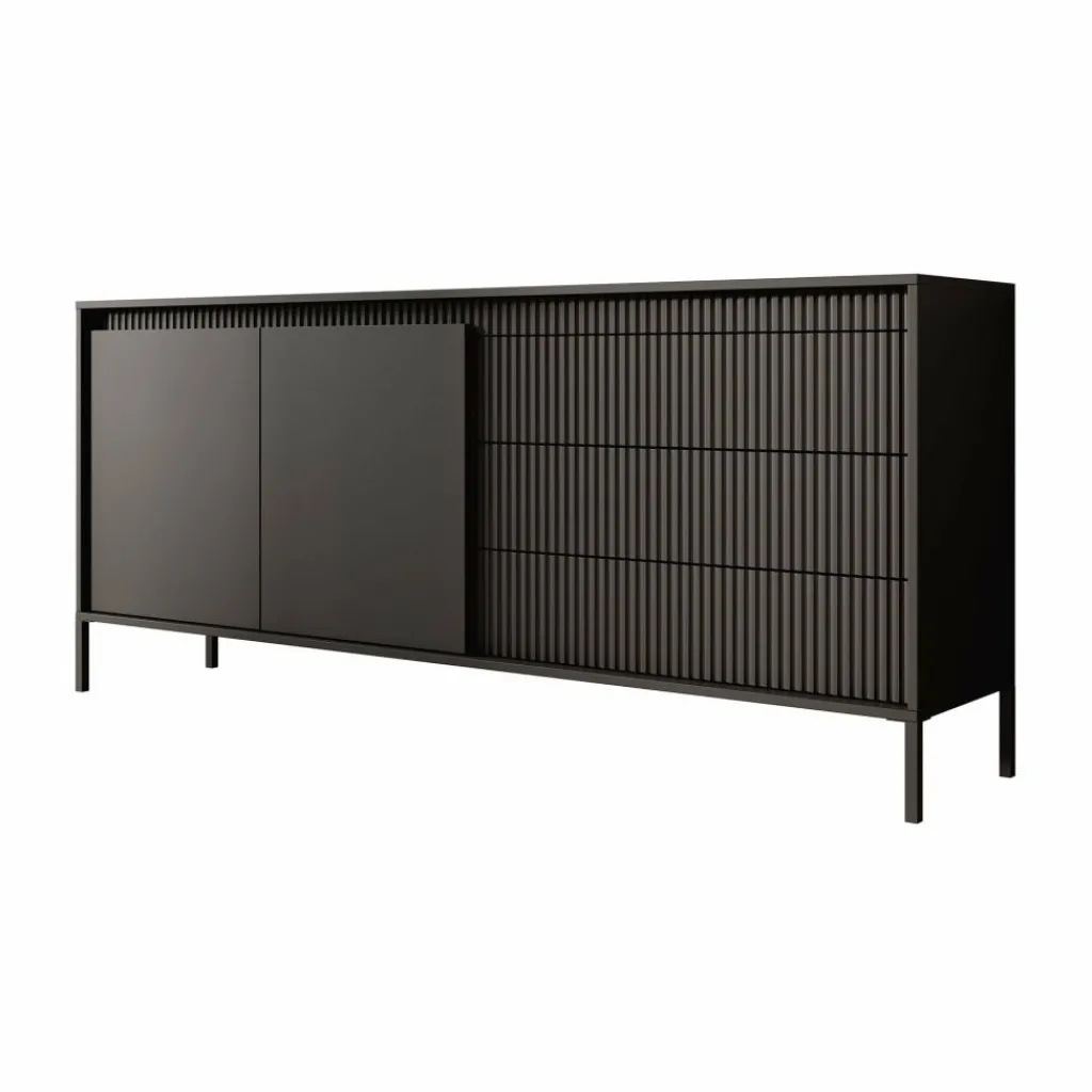 De kast heeft 2 greeploze deuren en 3 lades. Op de voorkant zit een latten patroon. Achter de deuren bevinden zich 4 opbergvakken. Het dressoir staat op hoge, zwarte pootjes.