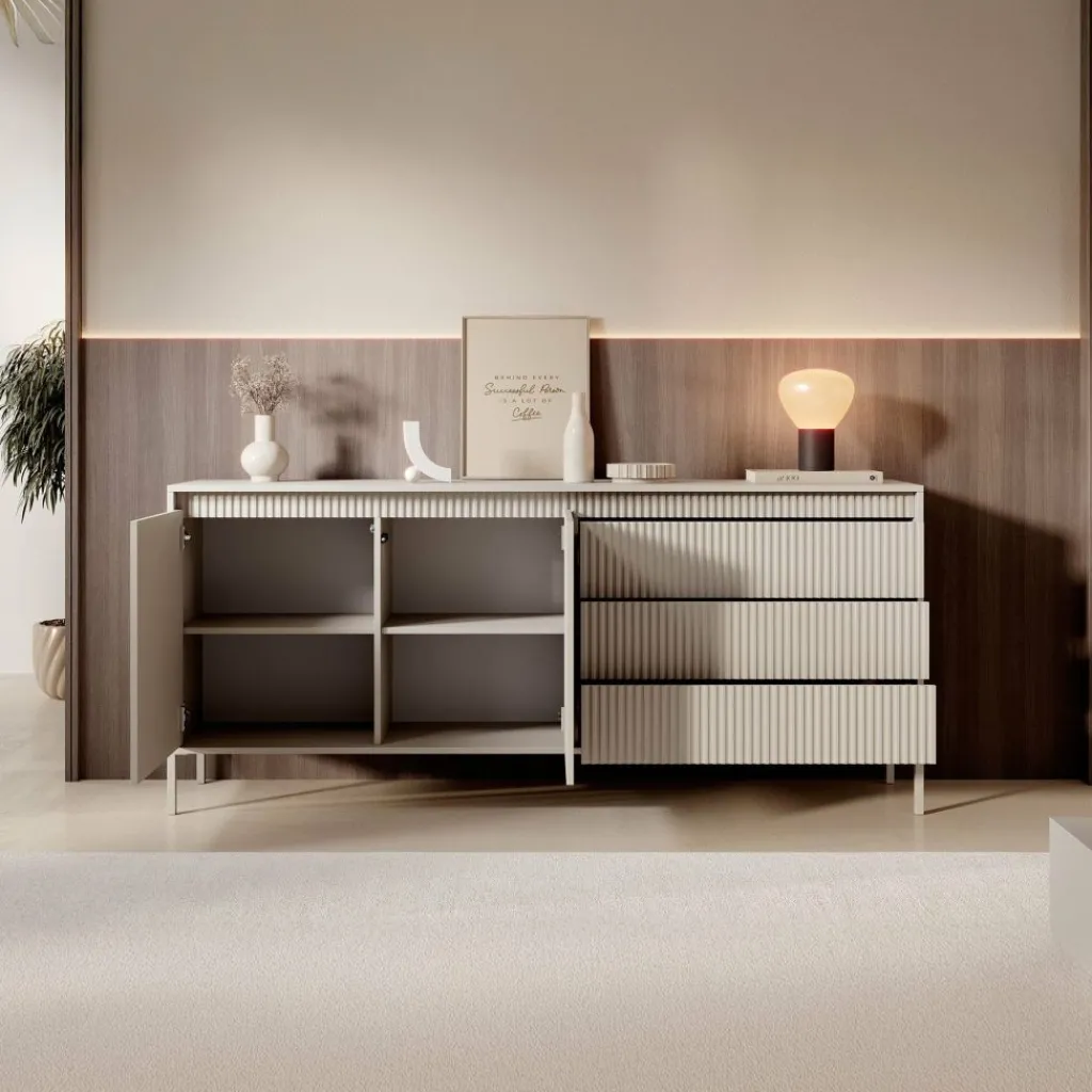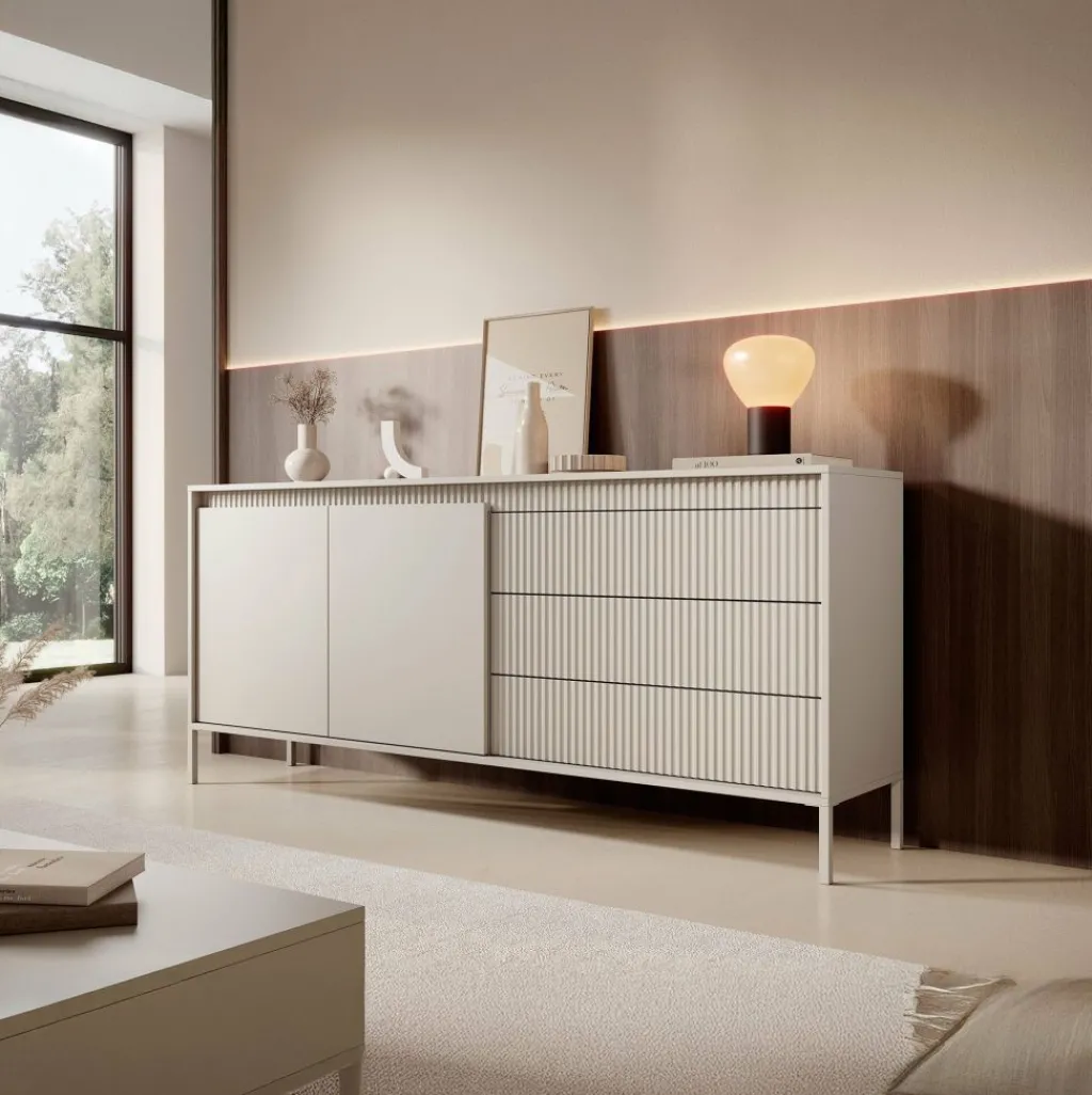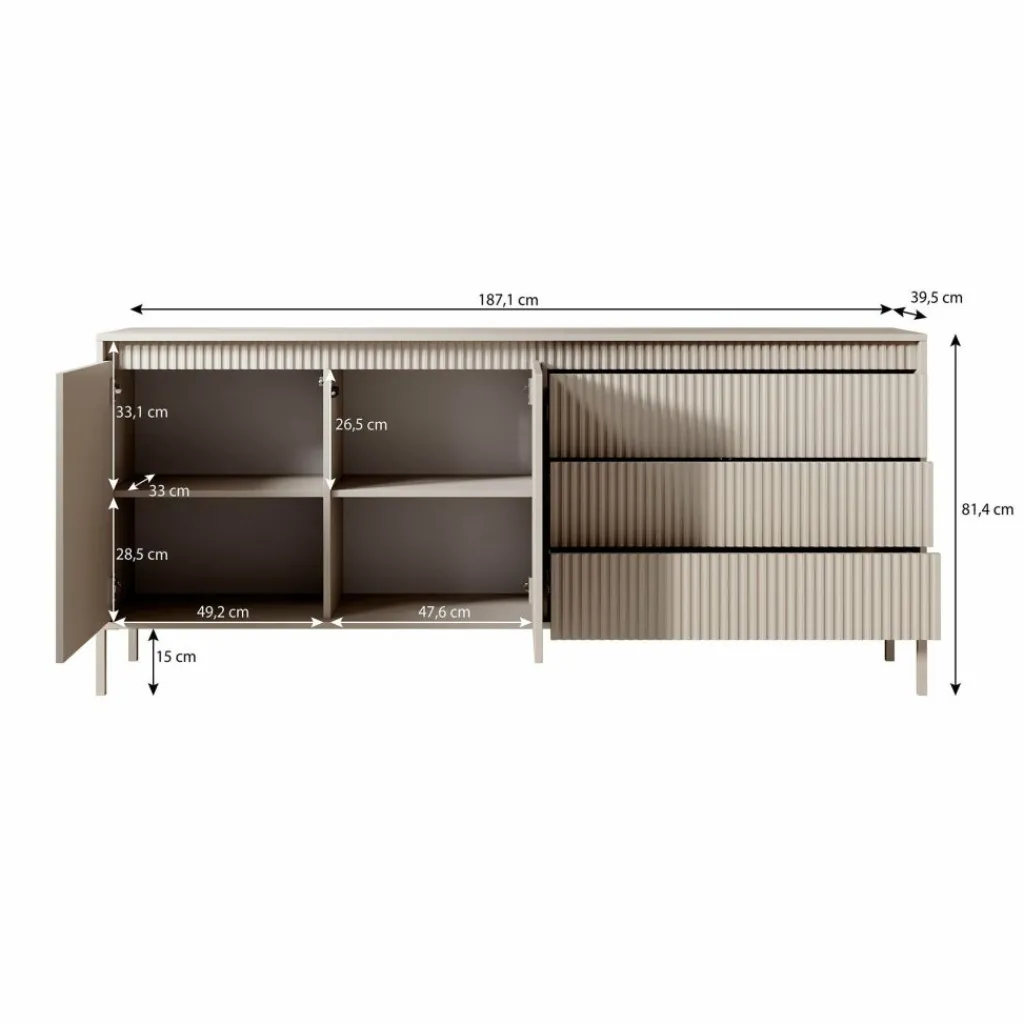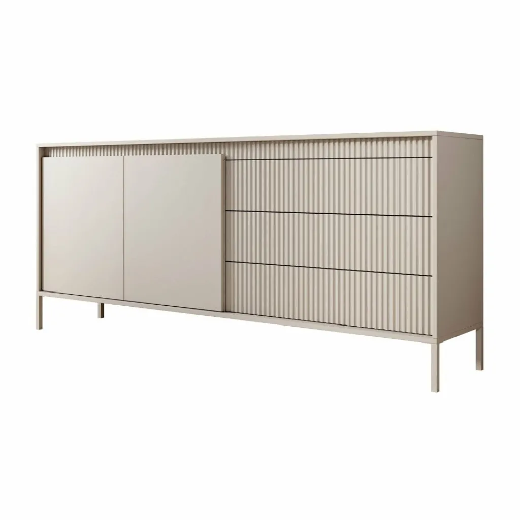 De kast heeft 2 greeploze deuren en 3 lades. Op de voorkant zit een latten patroon. Achter de deuren bevinden zich 4 opbergvakken. Het dressoir staat op hoge, beige pootjes.