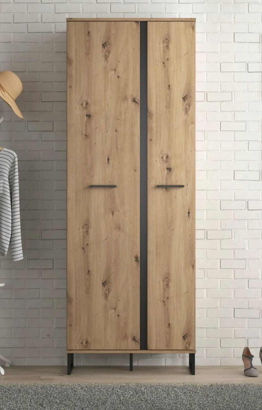 Halkast Saturn is een stijlvolle kast uitgevoerd in eiken met zwarte details. De kast heeft twee deuren, waarachter zich 4 vakken bevinden. Deze vakken verschillen in grootte.