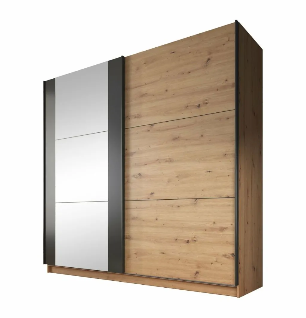Kledingkast Saturn is een stijlvolle garderobekast uitgevoerd in eiken met zwarte details. Op de linker schuifdeur zit een grote spiegel. De kledingkast heeft twee schuifdeuren met daarachter veel opbergruimte. In het midden vind je twee stangen om kleding op te hangen en aan de linker-, rechter- en bovenkant vind je in totaal 12 vakken om kleding op te bergen.