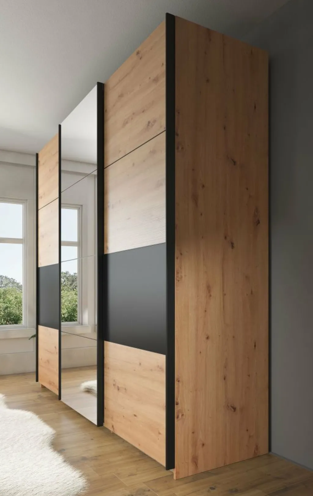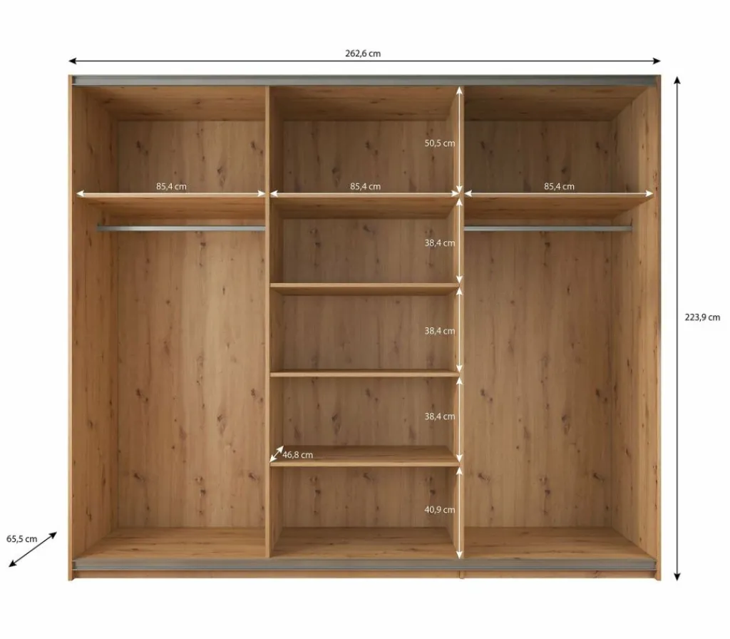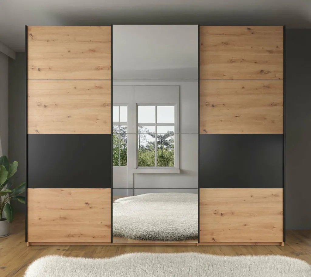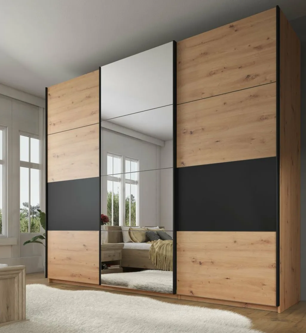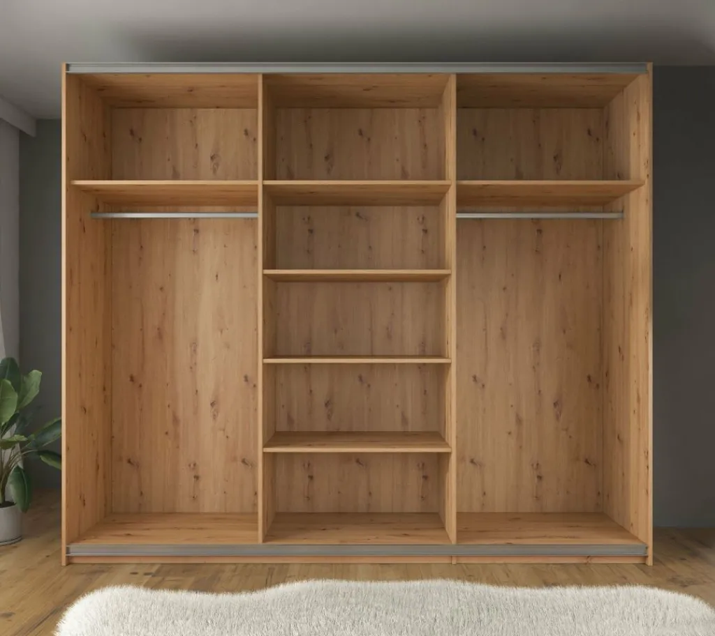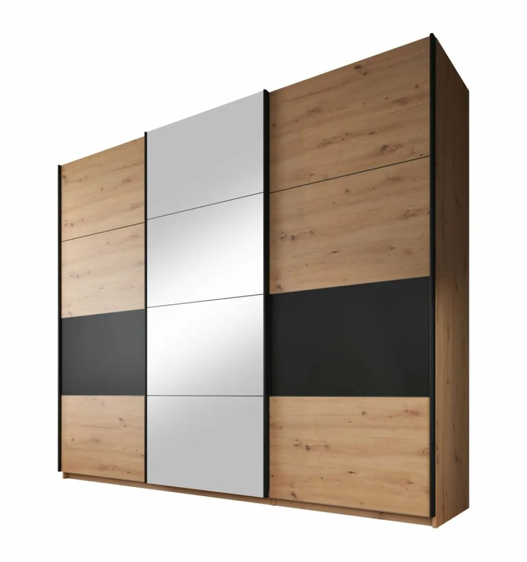 Kledingkast Saturn is een stijlvolle garderobekast uitgevoerd in eiken met zwarte details. Op de middelste schuifdeur zit een grote spiegel. De kledingkast heeft drie schuifdeuren met daarachter veel opbergruimte. Aan de linker- en rechterzijde vind je stangen om kleding op te hangen. Daarnaast beschikt de kast over in totaal 7 vakken om kleding op te bergen.