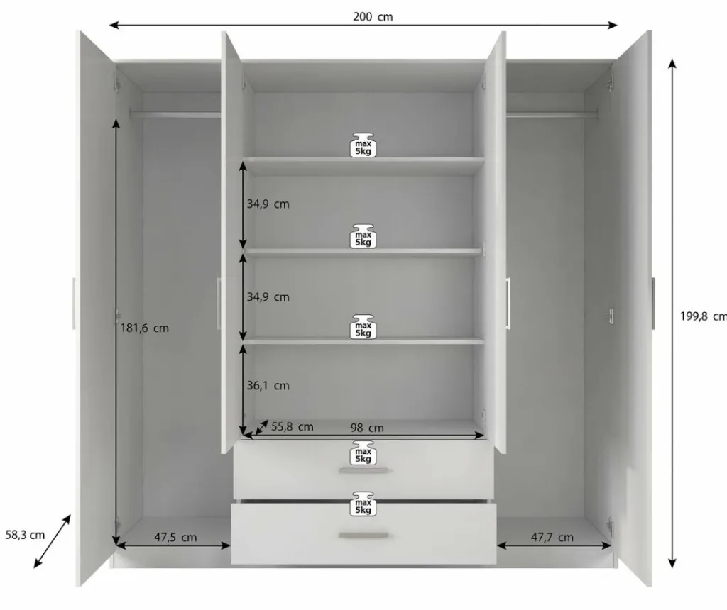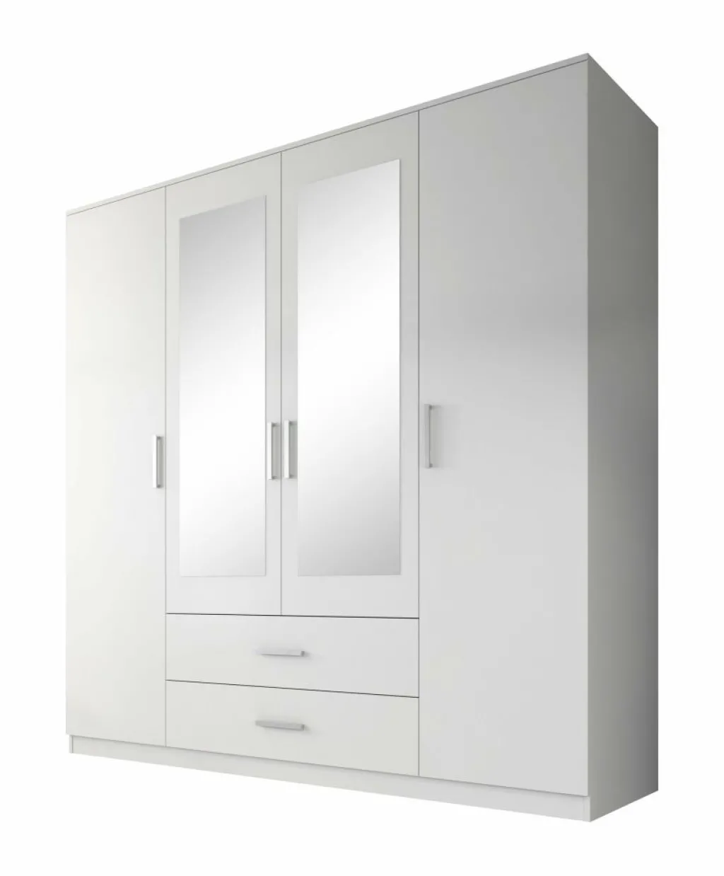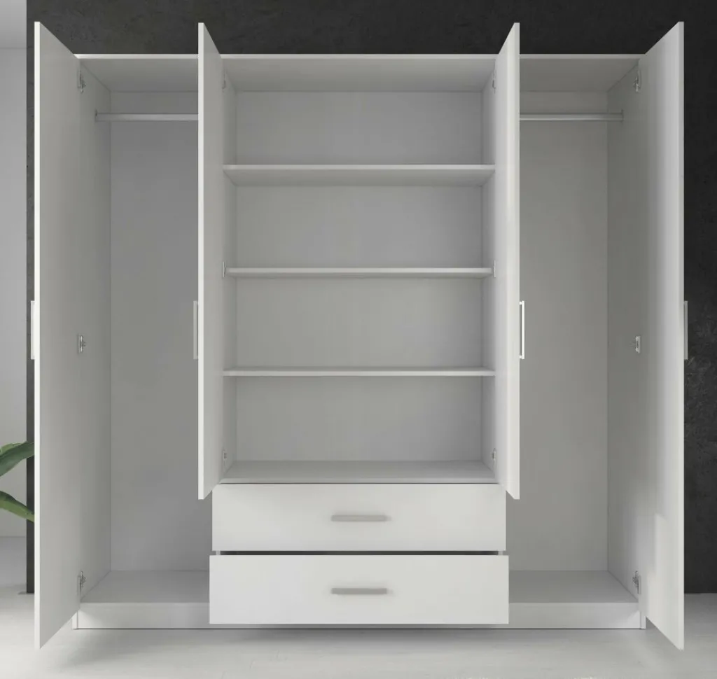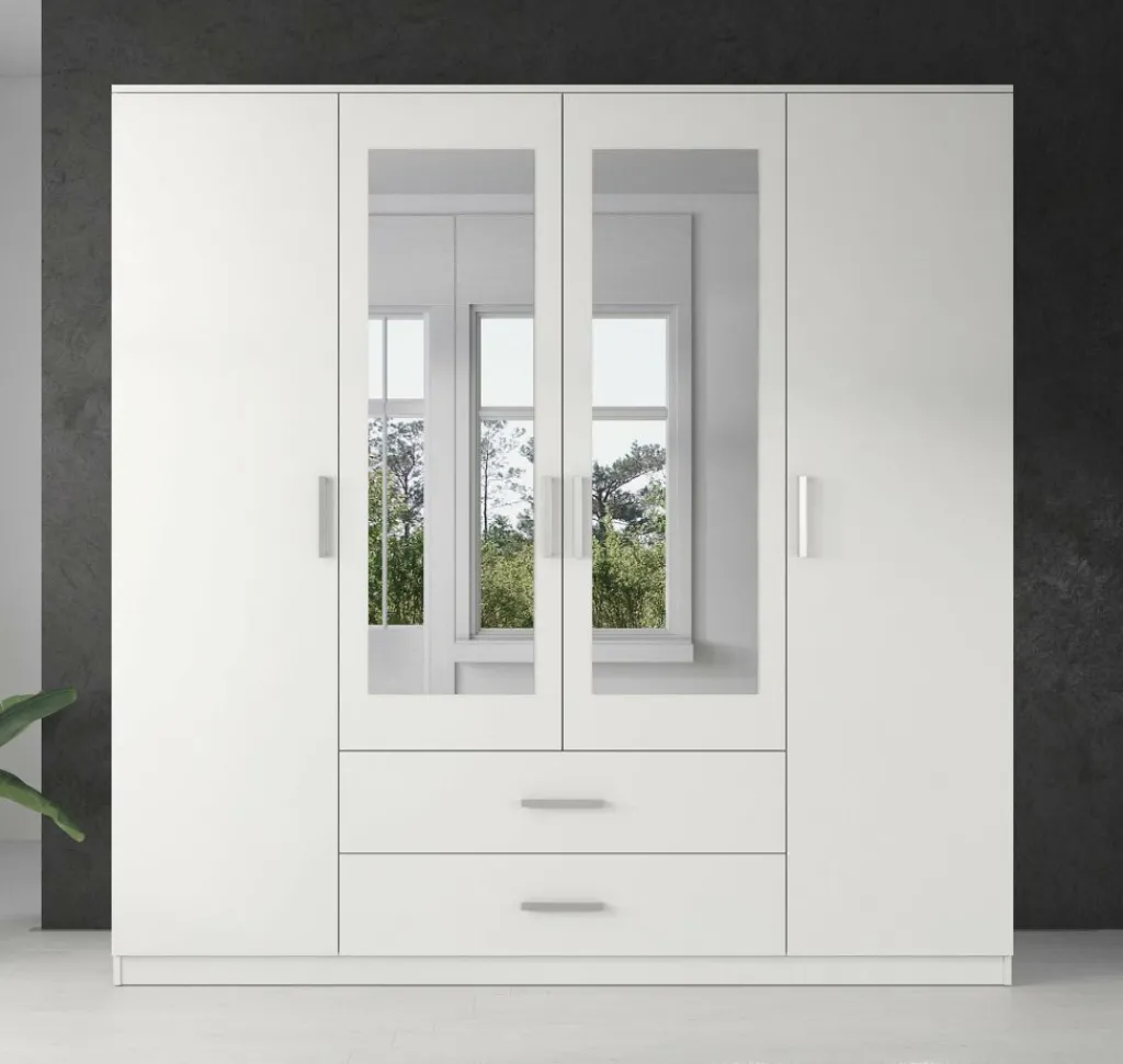 Garderobekast Savona is een praktische kast uitgevoerd in mat witte kleur. De kledingkast beschikt over 4 klapdeuren. De middelste deuren beschikken over een spiegel. Het binnenwerk bestaat uit twee metalen stangen om kleding aan op te hangen. Daarnaast beschikt de kast over 2 grote opberglades en 3 brede legplanken en biedt daardoor opbergruimte genoeg!