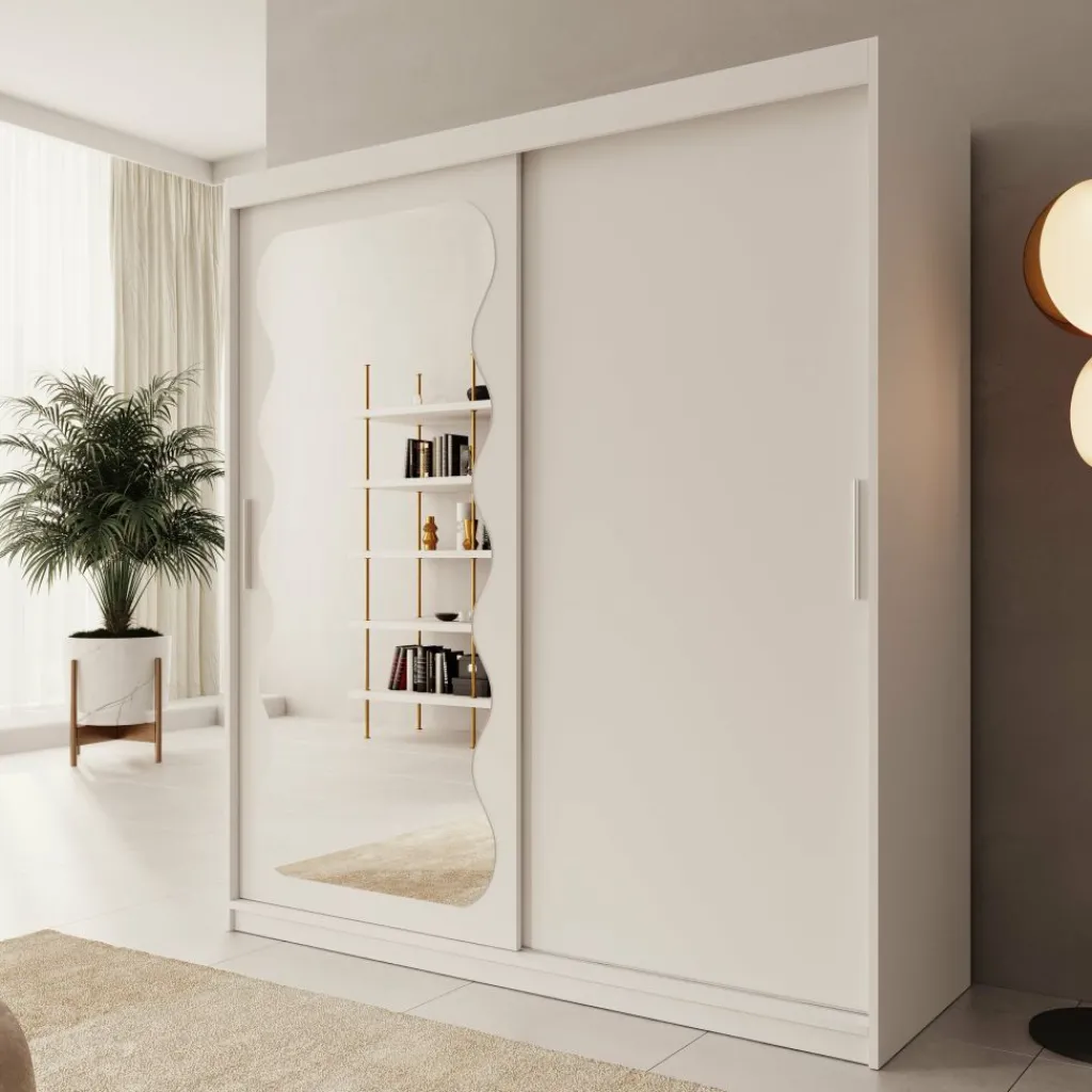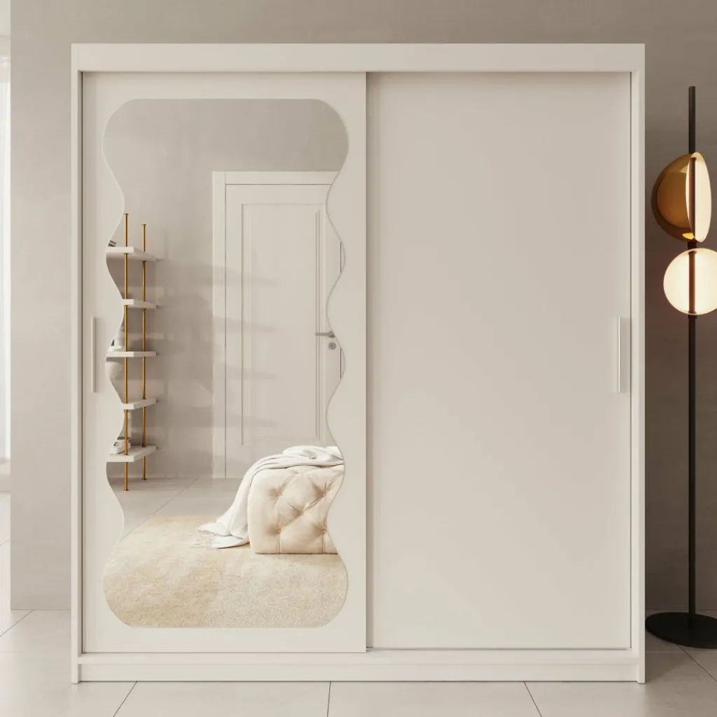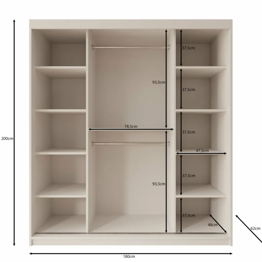 De kast is voorzien van twee schuifdeuren, waarvan één deur is afgewerkt met een grote spiegel aan de voorzijde. Hierdoor kun je gemakkelijk je outfit bekijken en oogt de ruimte optisch groter. Binnenin is de kast verdeeld in drie secties. In het middelste gedeelte bevinden zich twee metalen kledingroedes boven elkaar voor het ophangen van kleding. Aan de linkerzijde zijn meerdere legplanken geplaatst met daaronder twee lades voor kleinere kledingstukken of accessoires. Aan de rechterzijde bevindt zich een kolom met legplanken en eveneens twee lades voor extra opbergruimte.