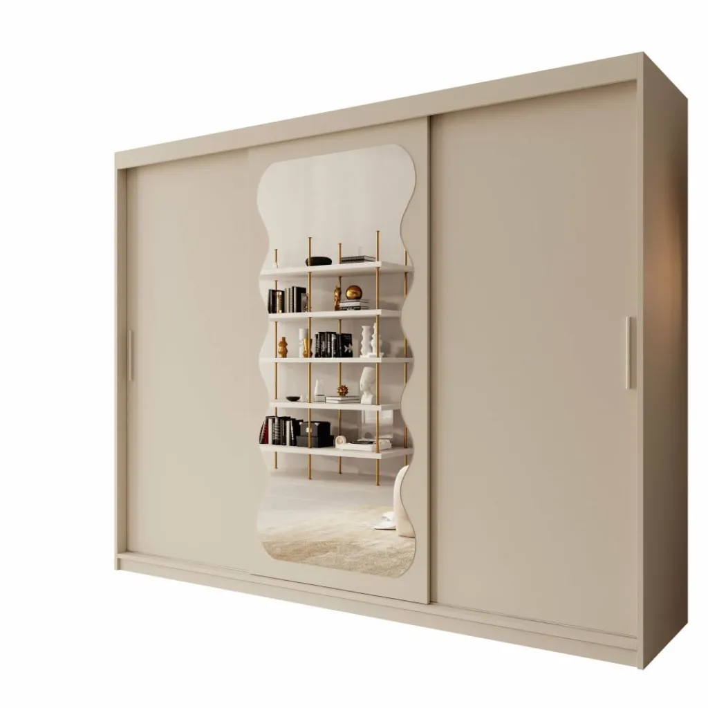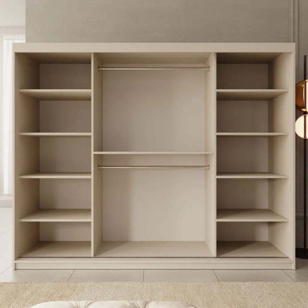 De Sentoji kledingkast is een extra ruime schuifdeurkast uitgevoerd in beige en geschikt voor de slaapkamer of dressing. Met een breedte van 250 cm, een diepte van 62 cm en een hoogte van 200 cm biedt deze kast zeer veel overzichtelijke opbergruimte voor kleding, accessoires en andere items.