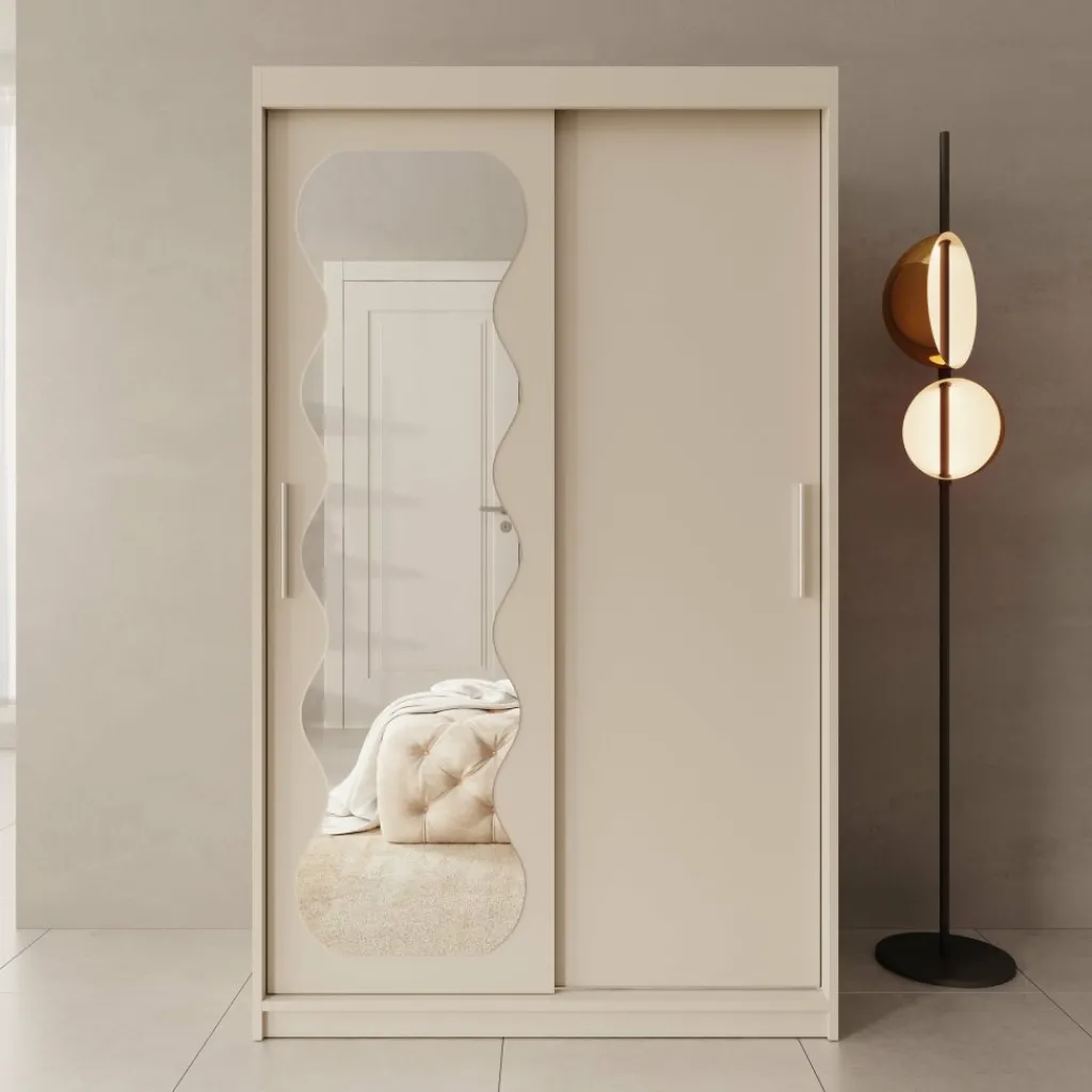 De kast is voorzien van twee schuifdeuren, waarvan één deur is afgewerkt met een gepolijste spiegel aan de voorzijde. Hierdoor kun je gemakkelijk je outfit controleren en wordt de ruimte optisch groter. Binnenin is de kast verdeeld in een hanggedeelte met metalen kledingroedes en meerdere legvakken. Daarnaast beschikt de kast over twee lades voor kleinere kledingstukken of accessoires.