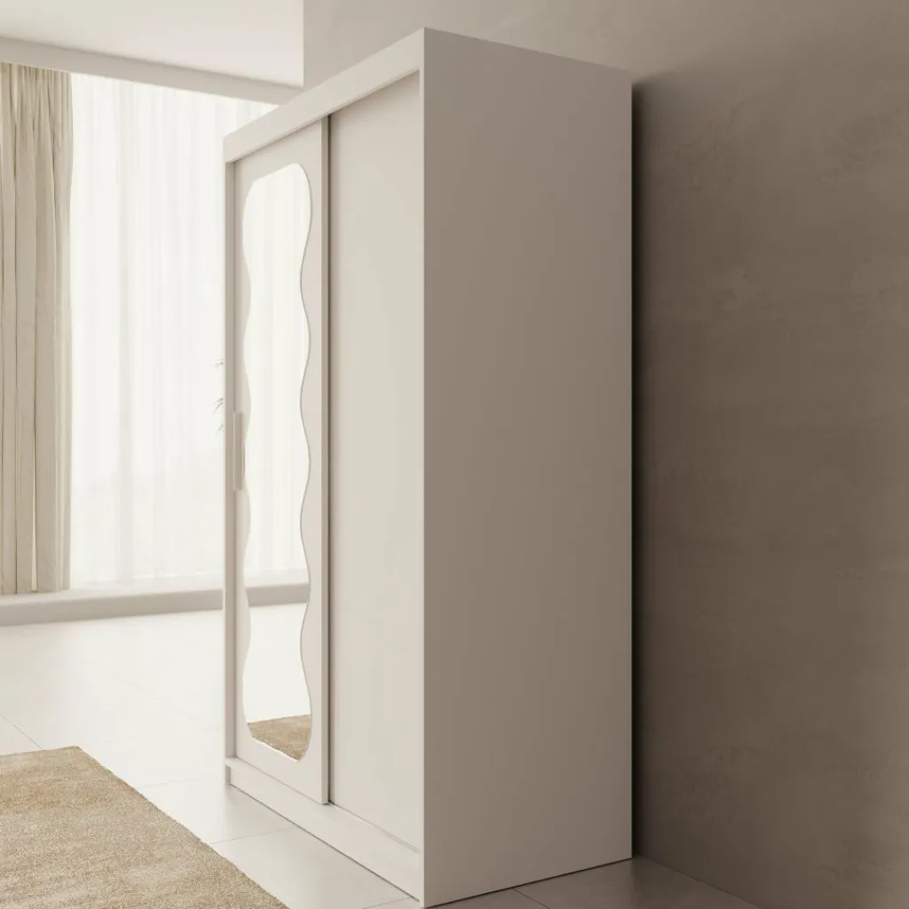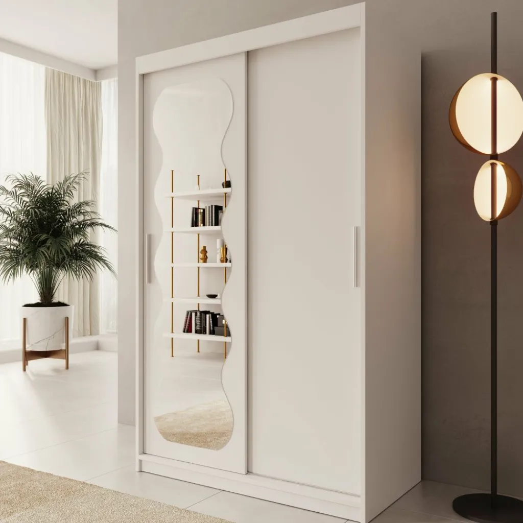 De kast is voorzien van twee schuifdeuren, waarvan één deur is afgewerkt met een gepolijste spiegel aan de voorzijde. Hierdoor kun je gemakkelijk je outfit controleren en wordt de ruimte optisch groter. Binnenin is de kast verdeeld in een hanggedeelte met metalen kledingroedes en meerdere legvakken. Daarnaast beschikt de kast over twee lades voor kleinere kledingstukken of accessoires.